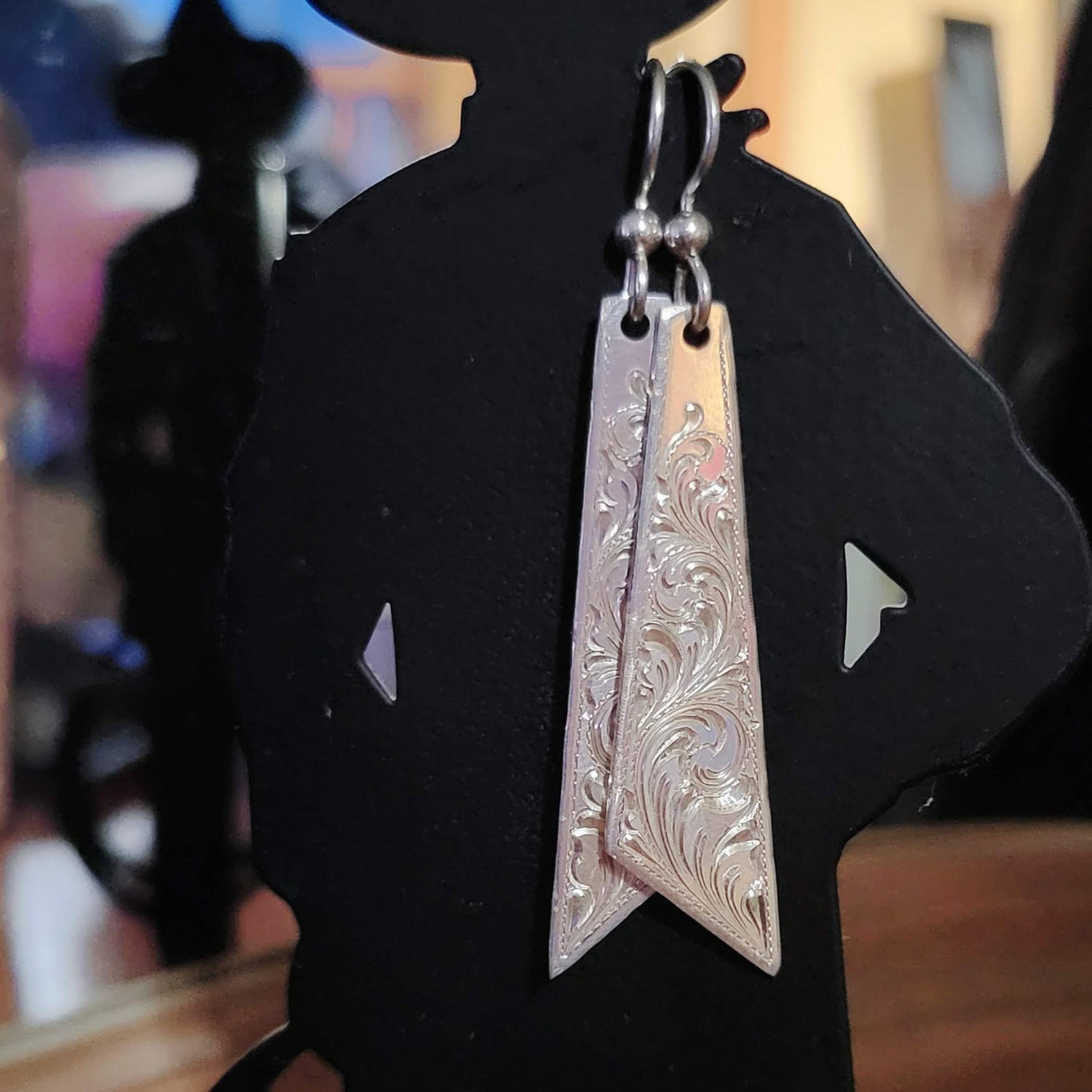Walk down the aisle in these handmade and hand-engraved unique western dangle earrings put together with love and expert craftsmanship. These dangles will shimmer from every angle as you move—beautiful hand-crafted sterling silver geo-shaped earrings with Western engraving.