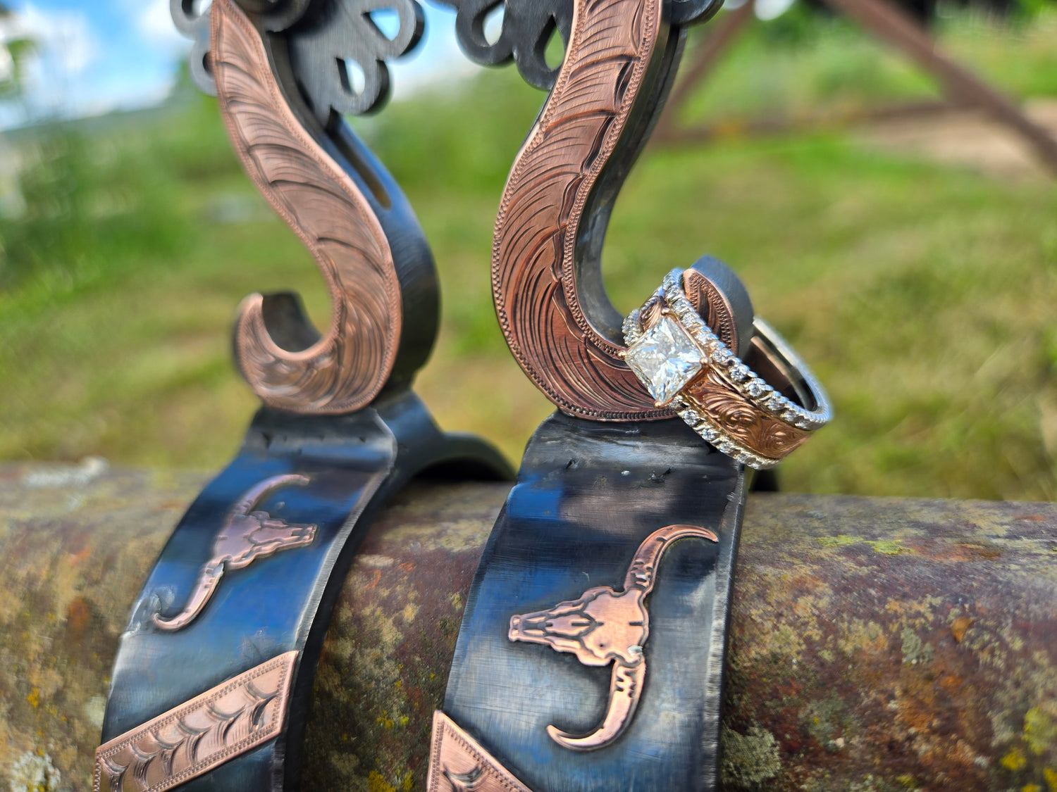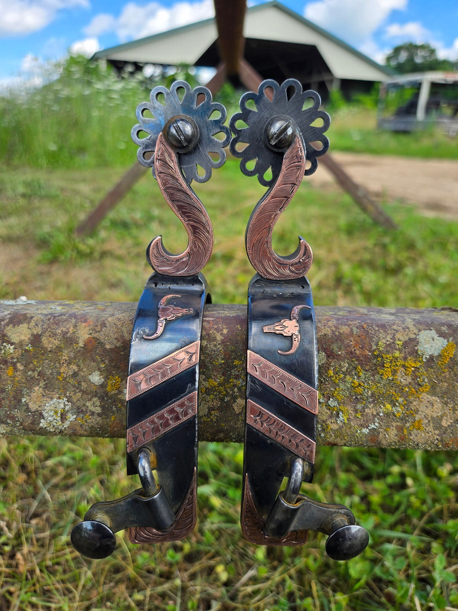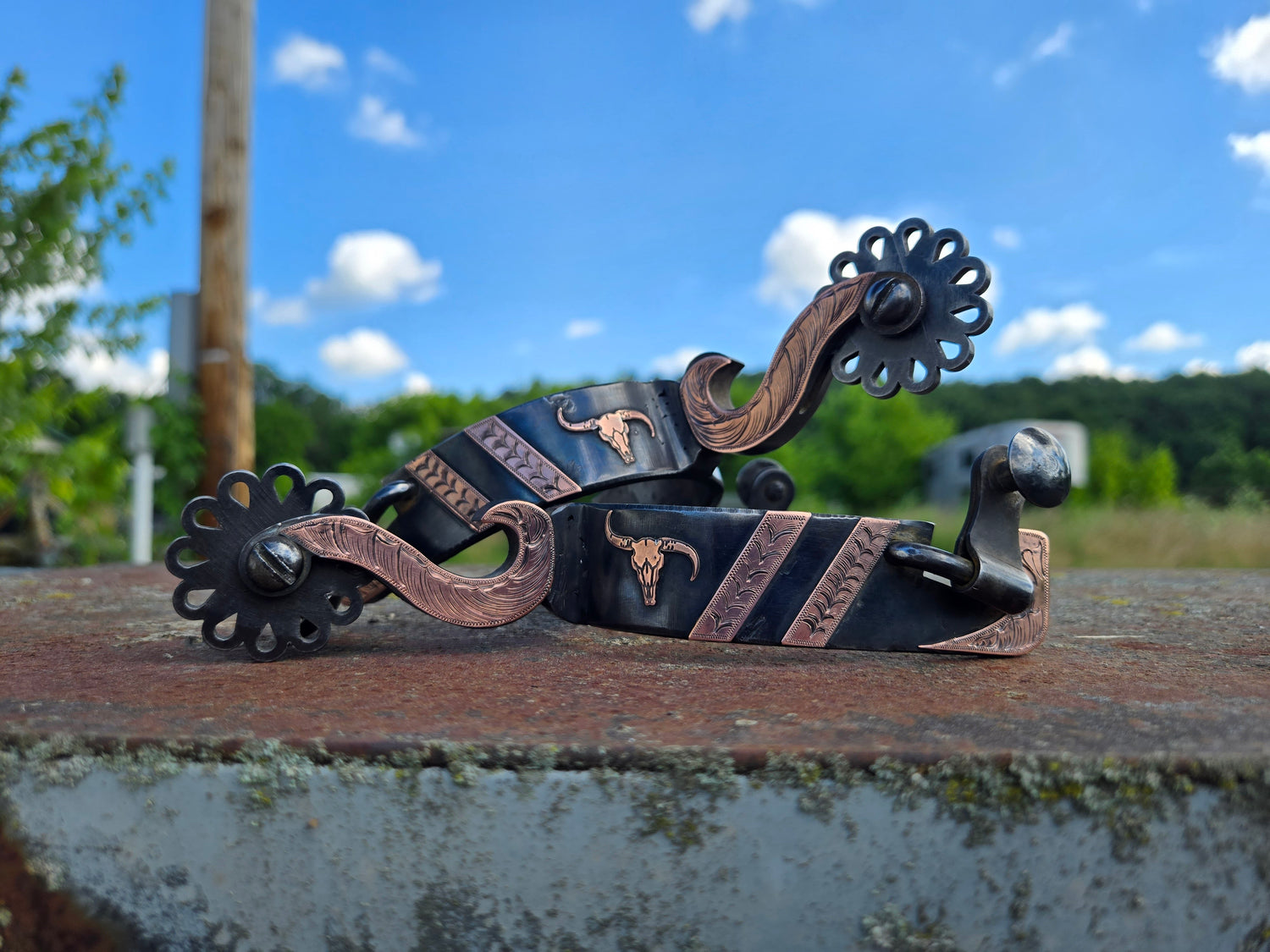 These handsome steel spurs were handmade and overlaid with contrasting, hand-engraved copper accents. They feature a cow skull and are perfect for the punchy cowboy looking to add something truely unique to his spur collection.