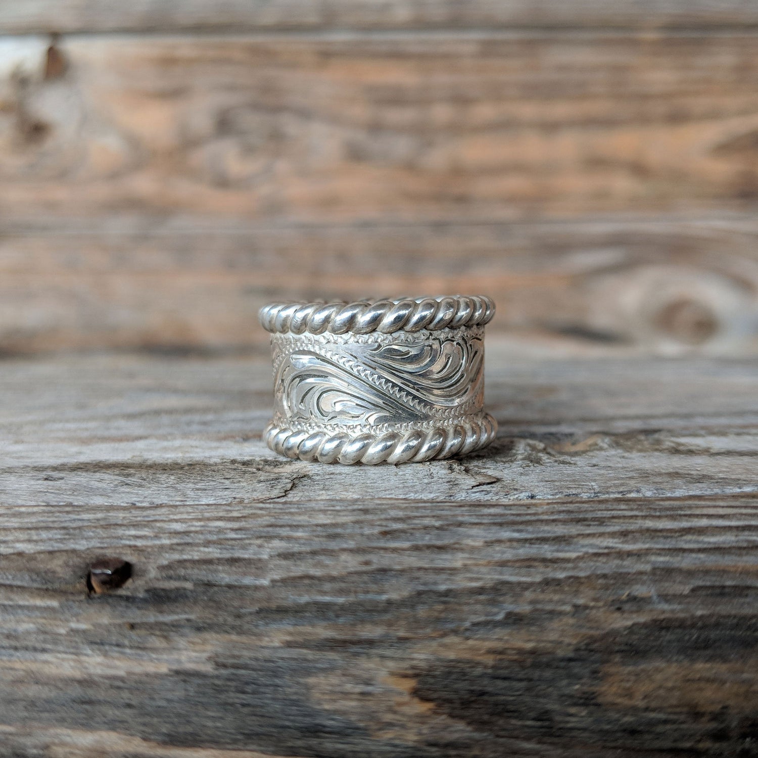 Beautiful cigar style sterling silver hand-engraved ring with silver "rope" edge, hand made with love in Eminence Missouri by western designer and engraver Ryan Liggett.