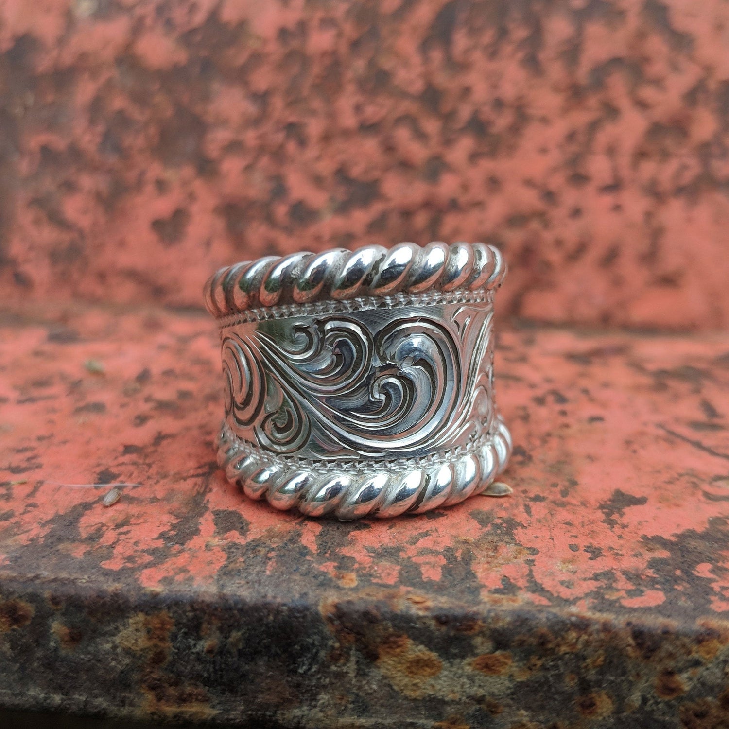 Sterling Silver Engraved Scroll Design Western Ring, For Her, Rope Edge, Design RNG00026 by Loreena Rose