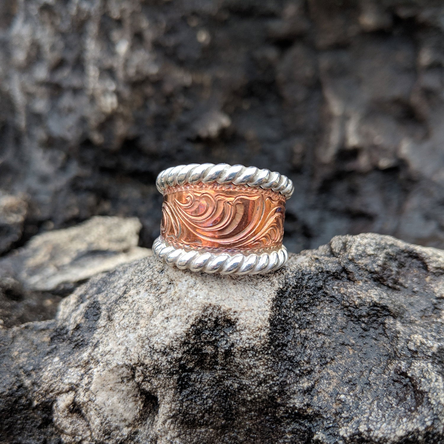 This is a beautiful tapered copper hand-engraved ring with a sterling silver "rope" edge, hand-made with love in Eminence Missouri by Western designer and engraver Ryan Liggett.