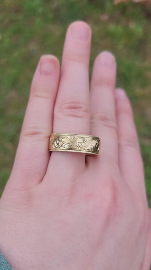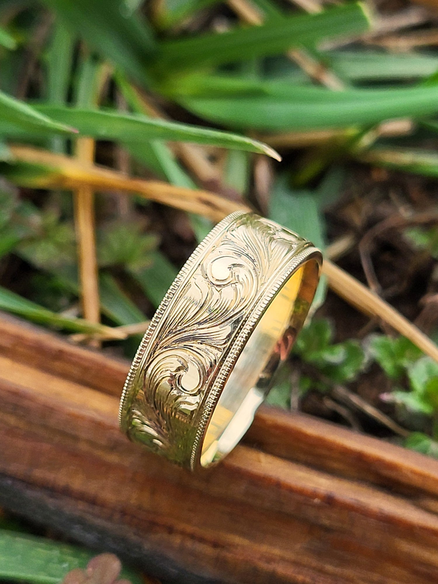 This 8mm, 10K, 14K or 18K yellow gold men's western wedding band has a hand-engraved center with a stunning milgrain edge detail. It is a comfort fit for a balanced and comfortable feel.
