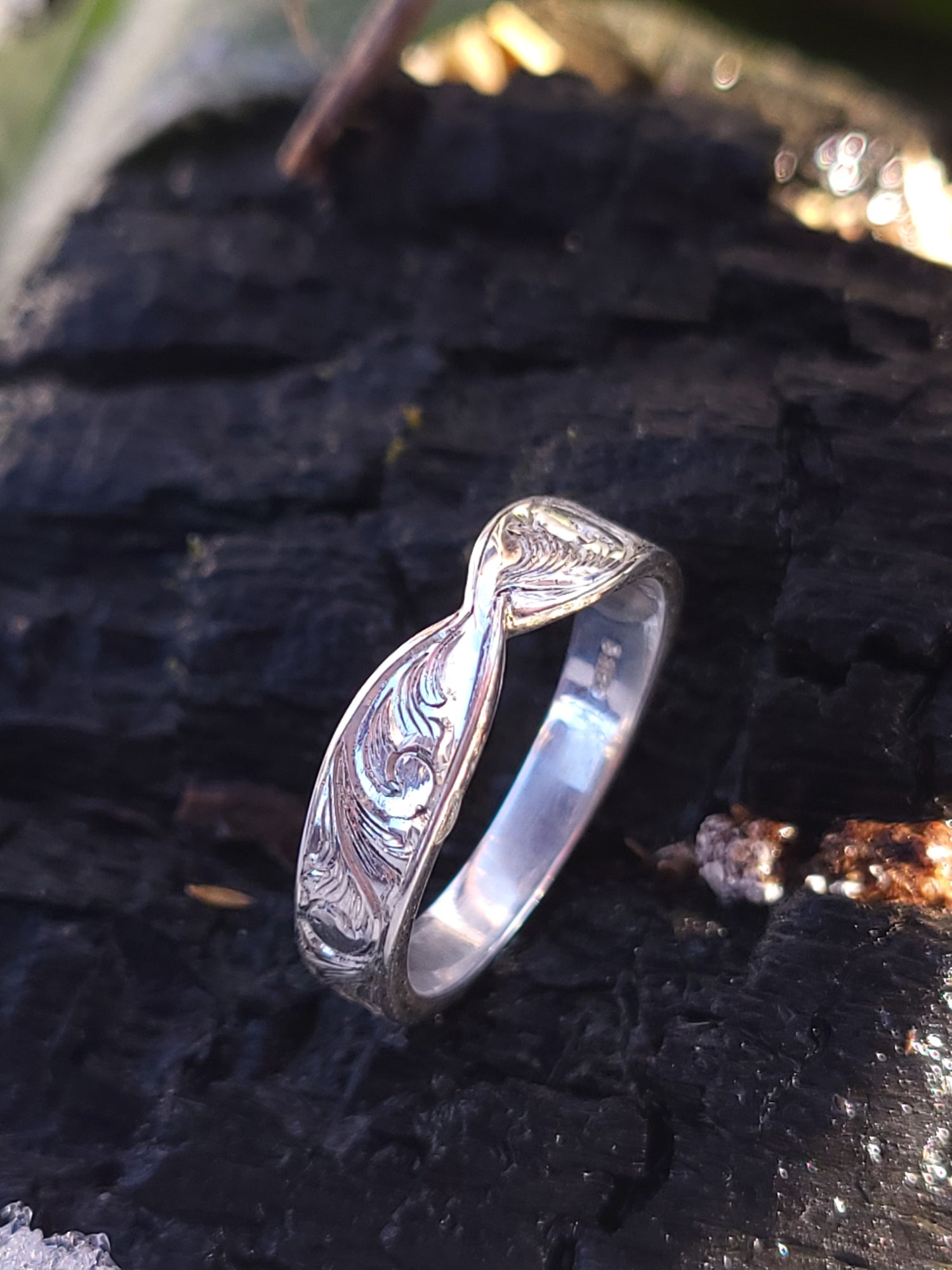 This 5mm wide band is hand-engraved with our signature bright scrollwork, has the cutest twist detail, and fits beautifully with a large range of engagement rings due to the space created by the twist. Available in a range of metal options, from sterling silver to 10K, 14K, and platinum.