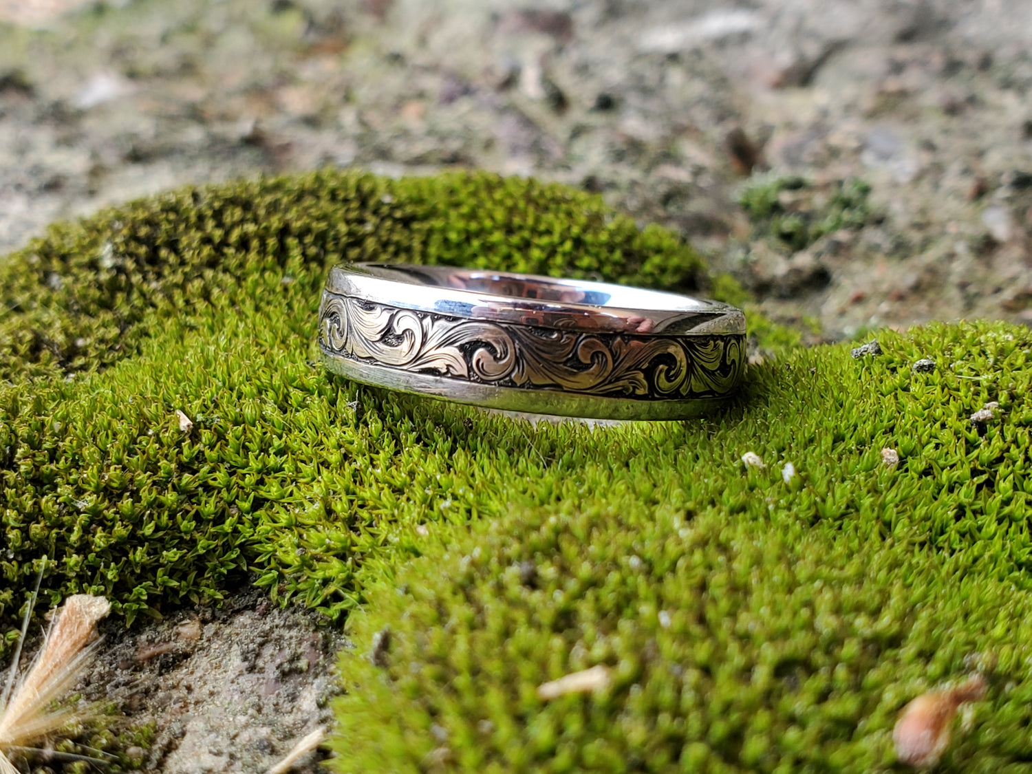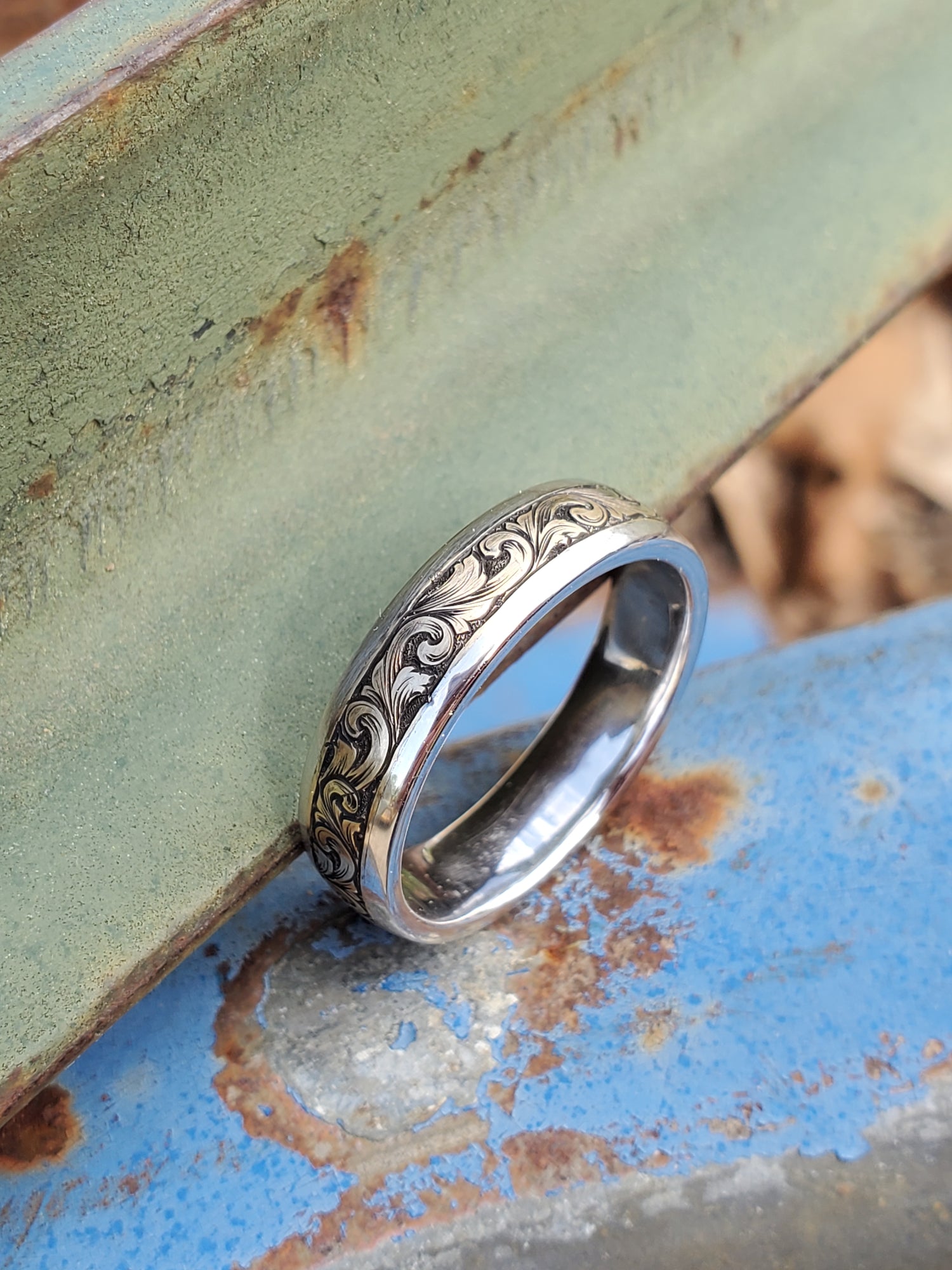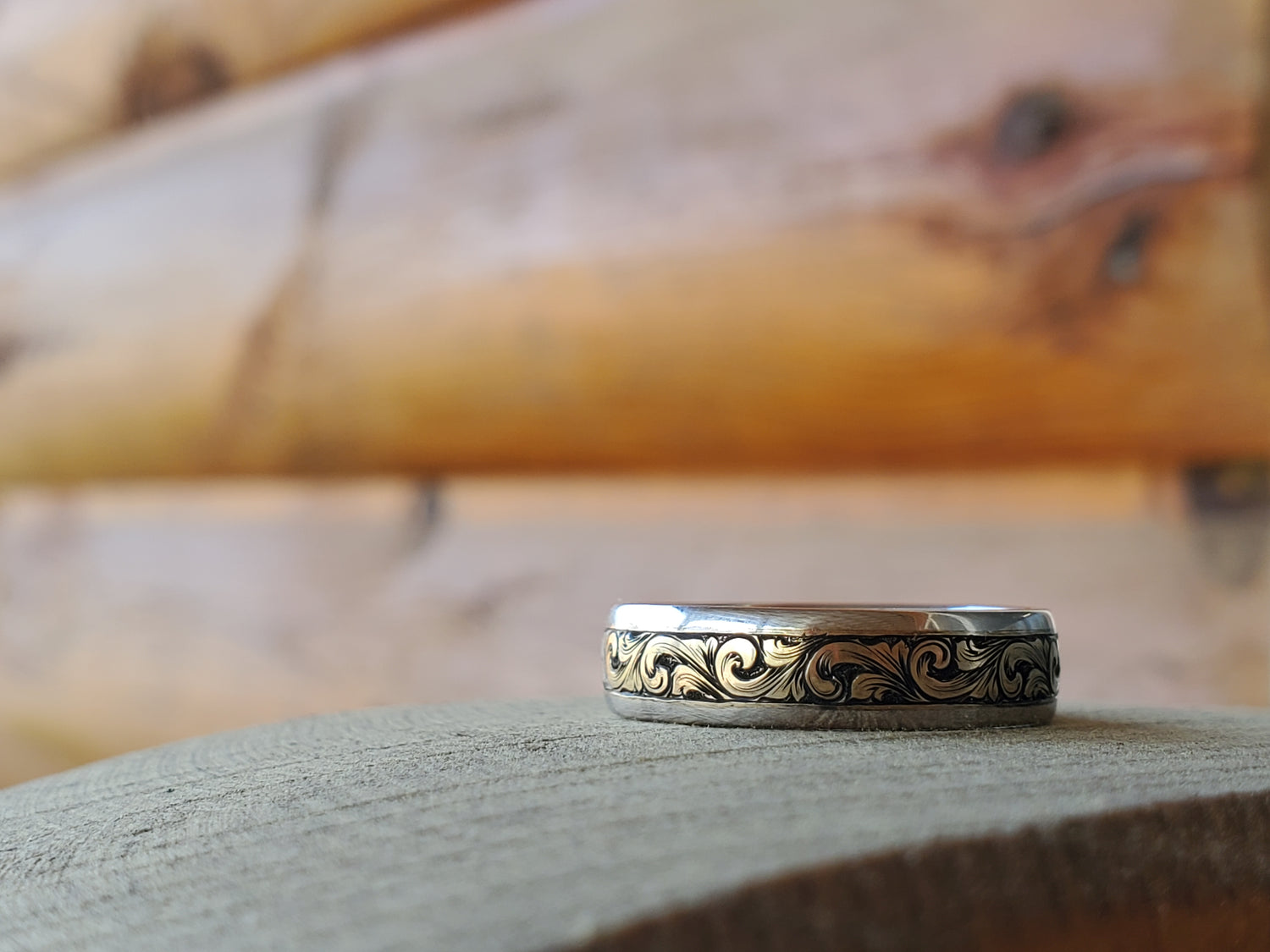The Parker is a fantastic 6mm western men's wedding band with a unique style: an inlaid yellow-gold band is nestled into the white gold, making the antiqued hand-engraved scrollwork have an almost 3-D effect. Available in 10K, 14K, or 18K.