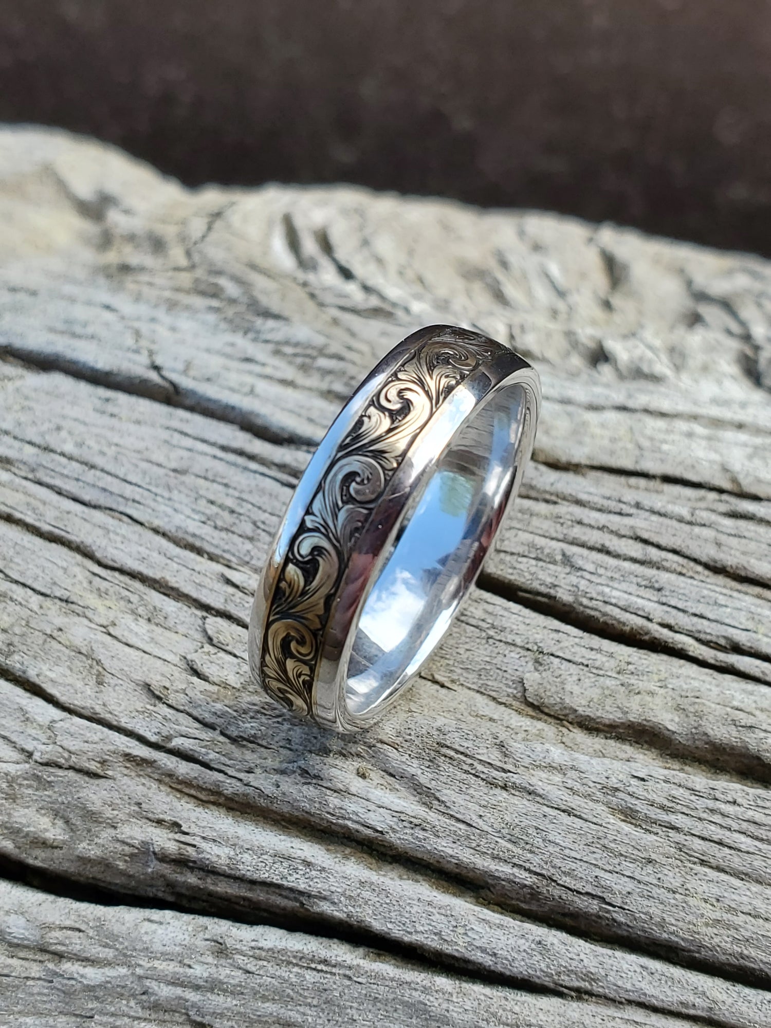 The Parker: Two-Tone Men's Band with Inlaid Yellow Gold Center, Western Men's Wedding Band, Cowboy Wedding Ring, Hand-Engraved Men's Band
