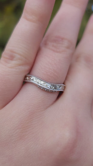 This unique diamond-accented band features a gentle contour to fit perfectly with your engagement ring, swirling hand-engraved scrollwork details, and an upraised milgrain edge for extra interest and texture.