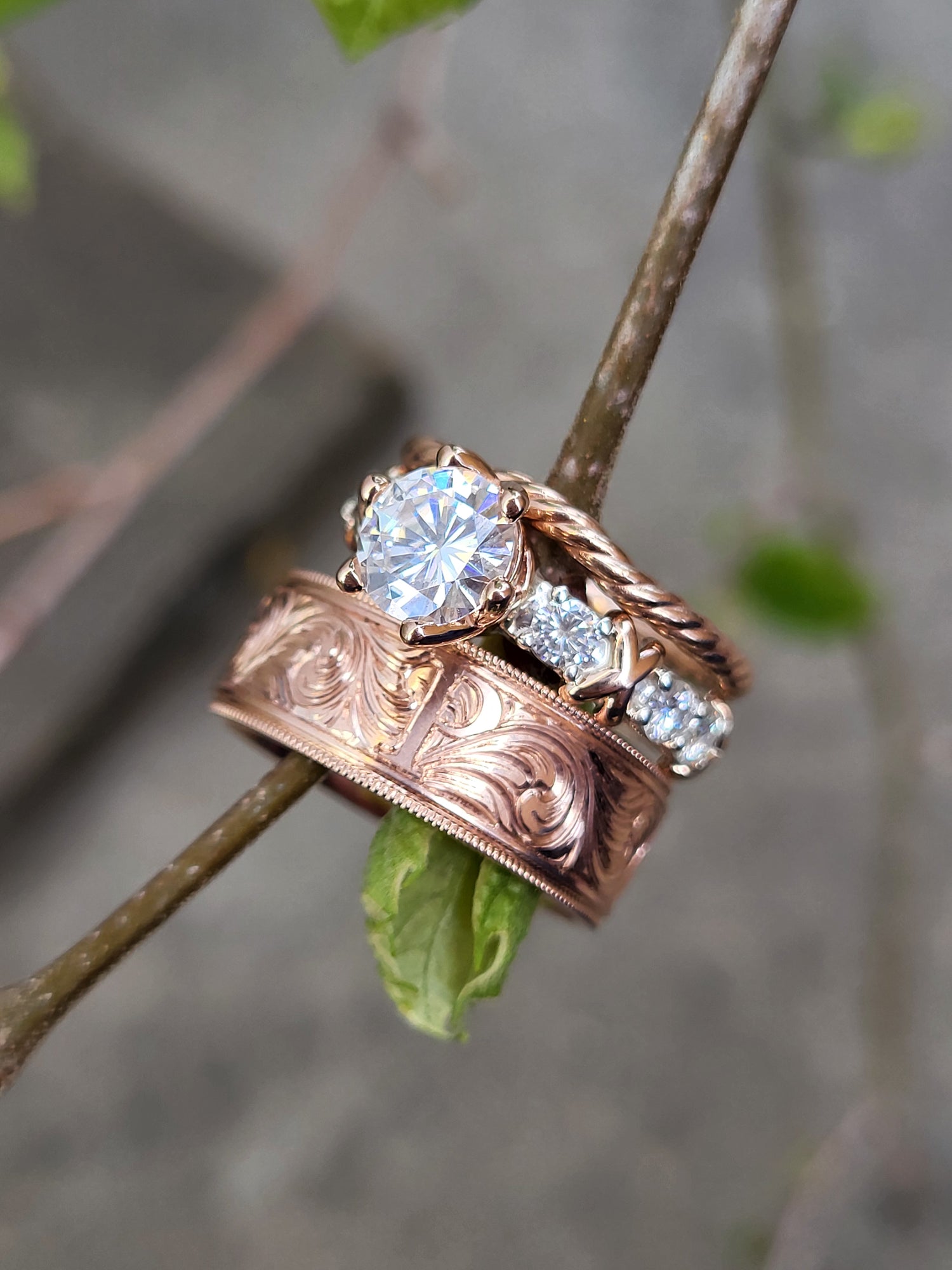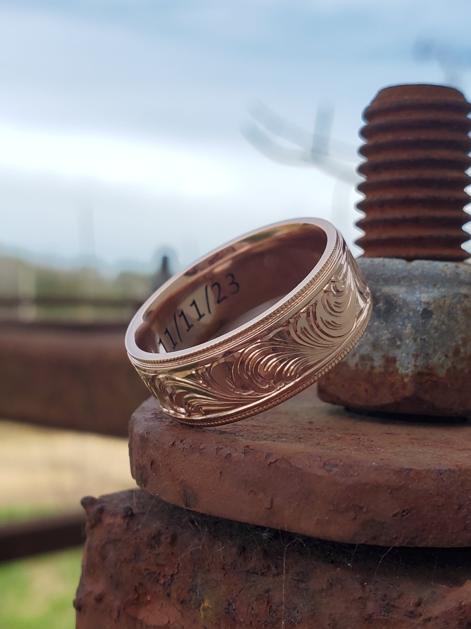 The Samuel: 10K, 14K, or 18K Rose Gold Western Wedding Band, Hand-Engraved Cowboy Wedding Ring, Cowboy Ring, Rose Gold Men's Wedding Band, Detailed Wedding Ring