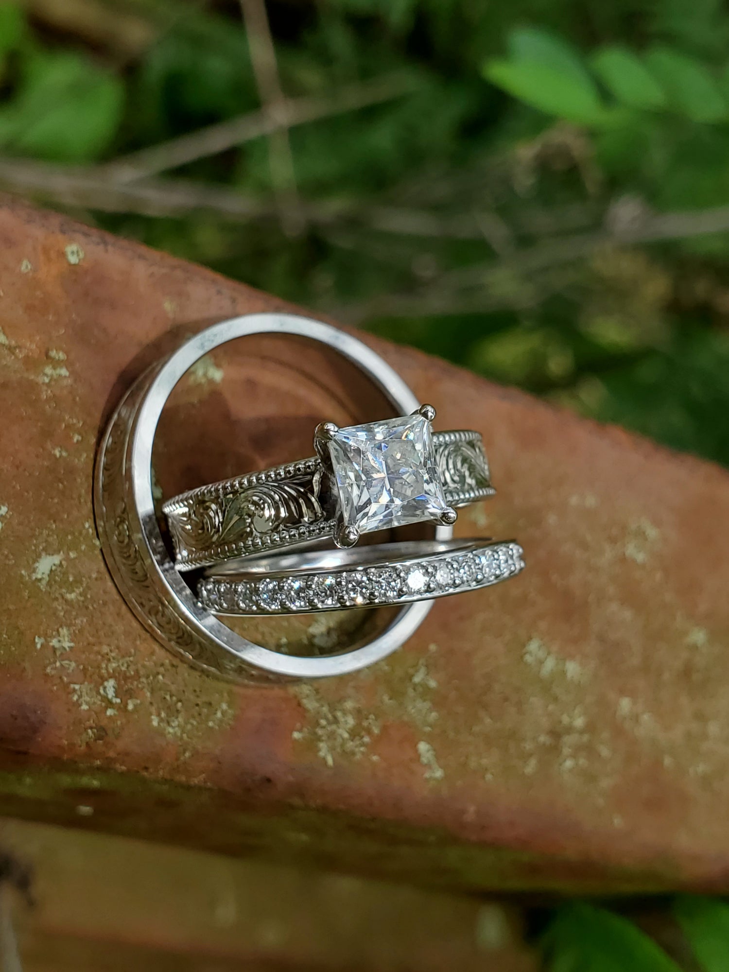 The Tawny is a lovely ring with a 1.25 square center Moissanite or lab DEF diamond. It's made out of sterling silver, 10K or 14K white gold and has intricate hand-engraved swirls. This ring features a unique upraised milgrain edge. At 5mm wide, it's a comfortable width that shows off the hand engraving beautifully!