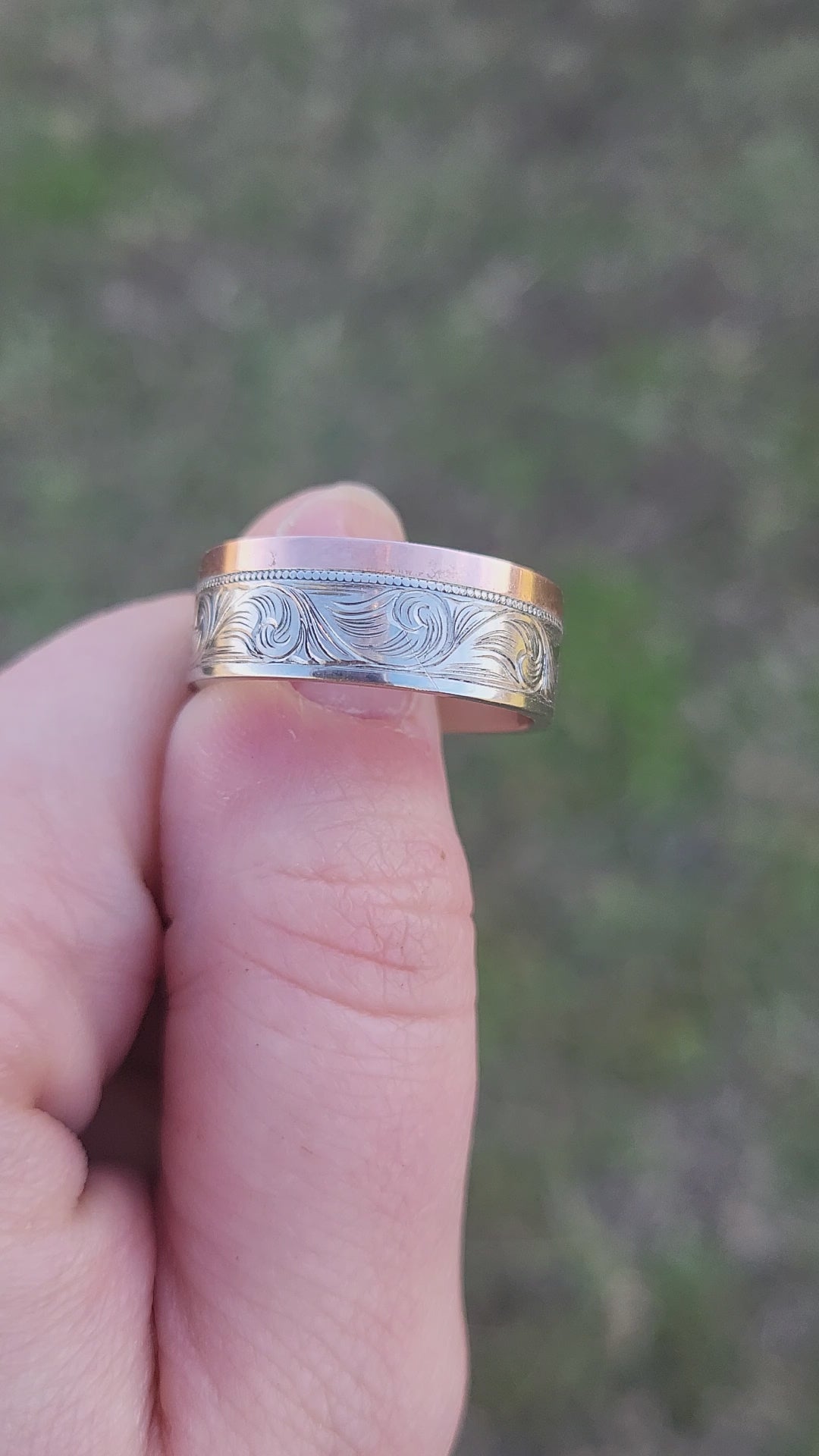 Hankering for something unique? An asymmetrical, two-tone band ticks all the boxes, with a sterling silver or white gold base and rose gold accent side. The hand-engraved scrollwork is separated from the rose gold accent with a line of hand-placed milgrain.
