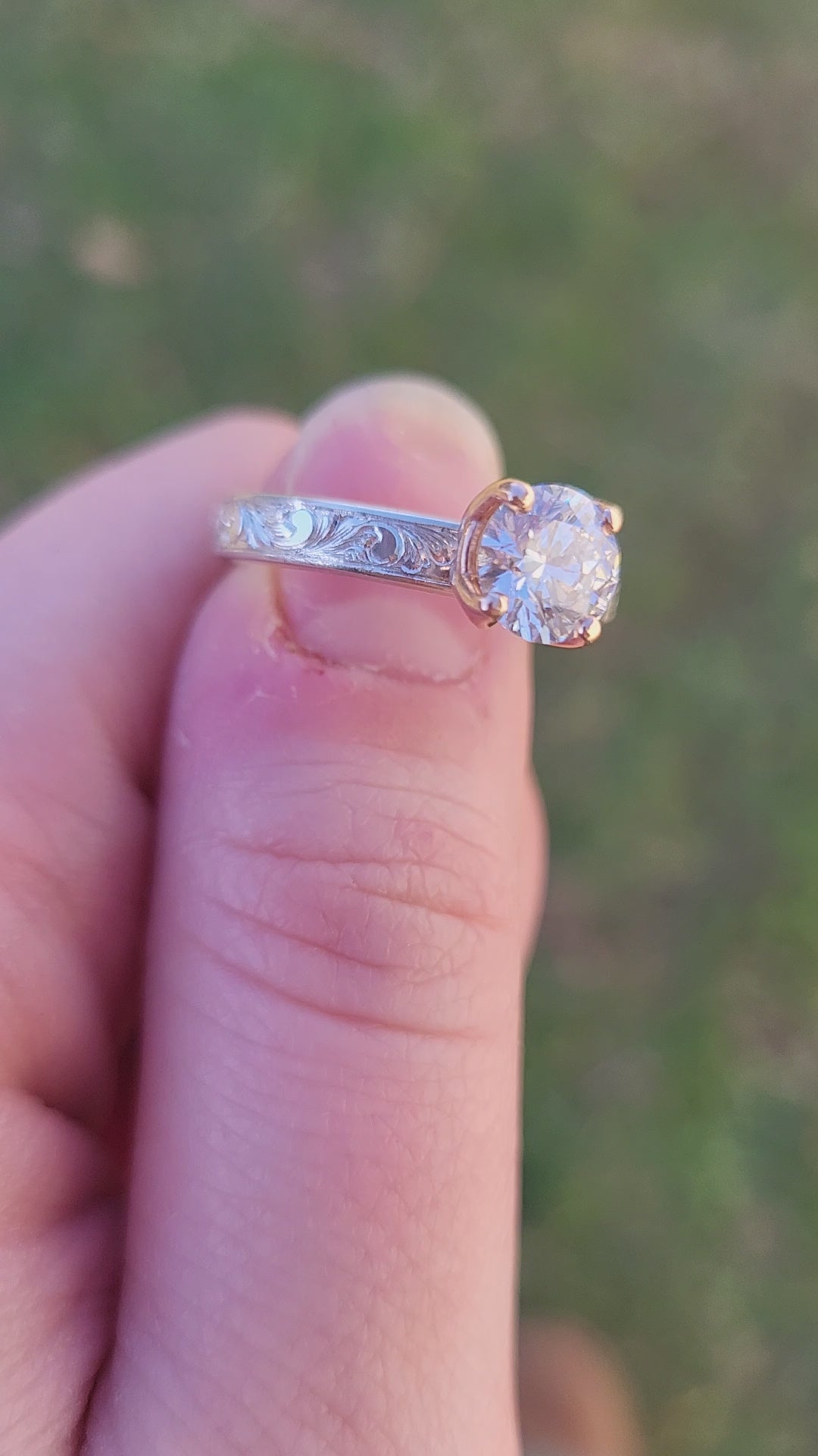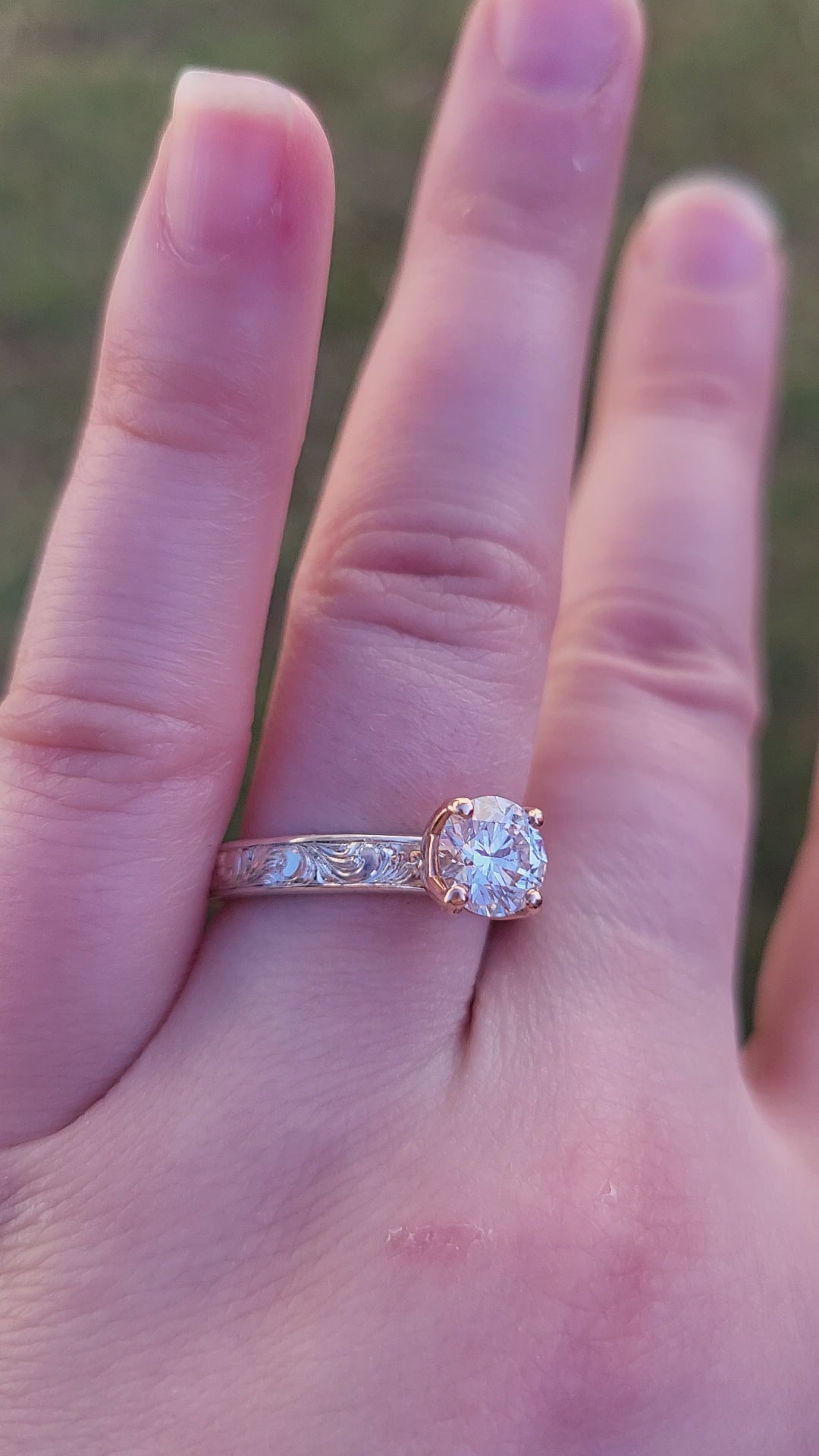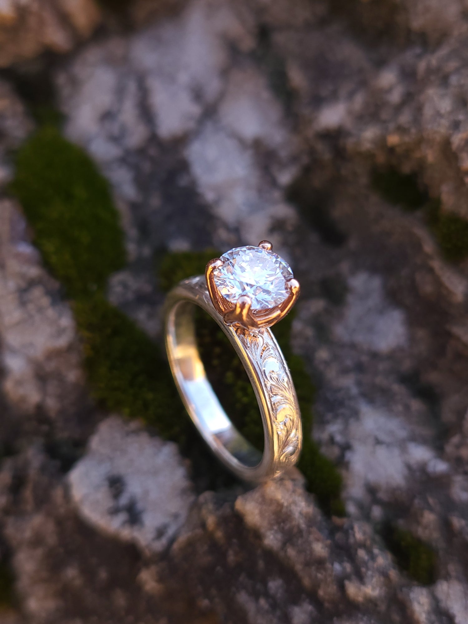 It is made with a 3.5mm sterling silver band, with a 10K white, yellow, or rose gold setting, and carefully hand-engraved with a detailed western scrollwork design around the entire band.