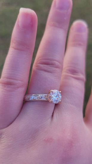 This is a beautiful Western engagement ring with a lovely round center stone (available with a DEF lab-grown diamond or moissanite, in a range of ct sizes!).