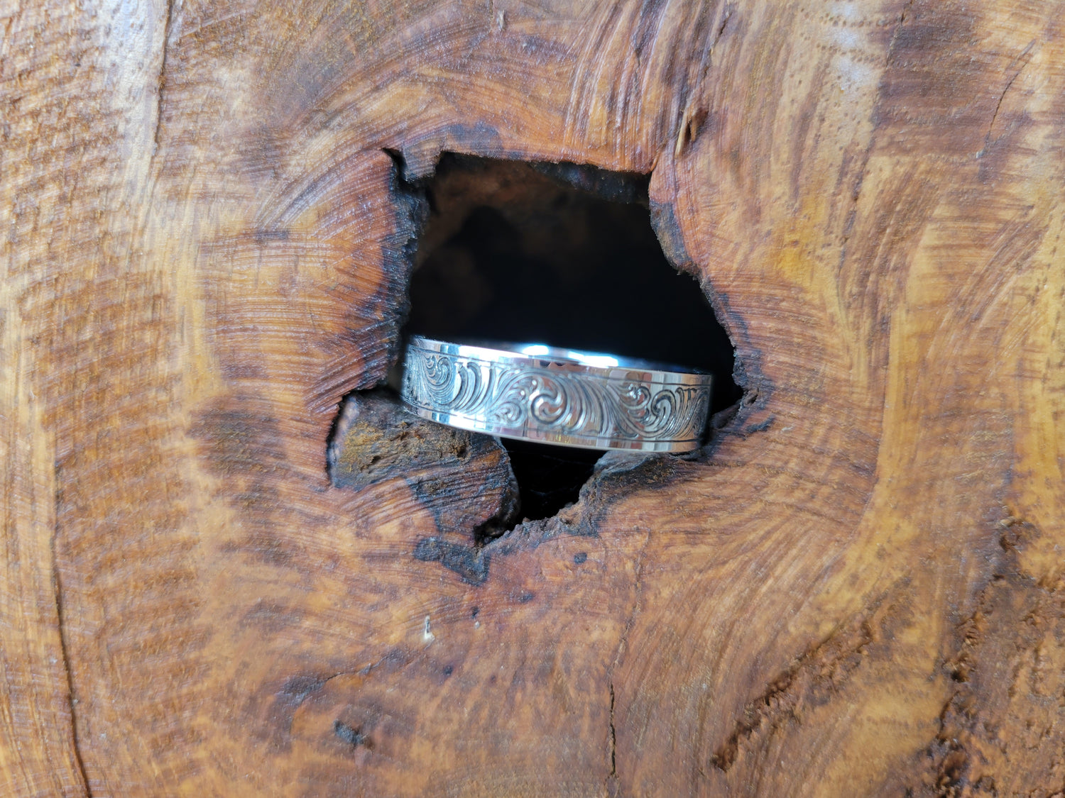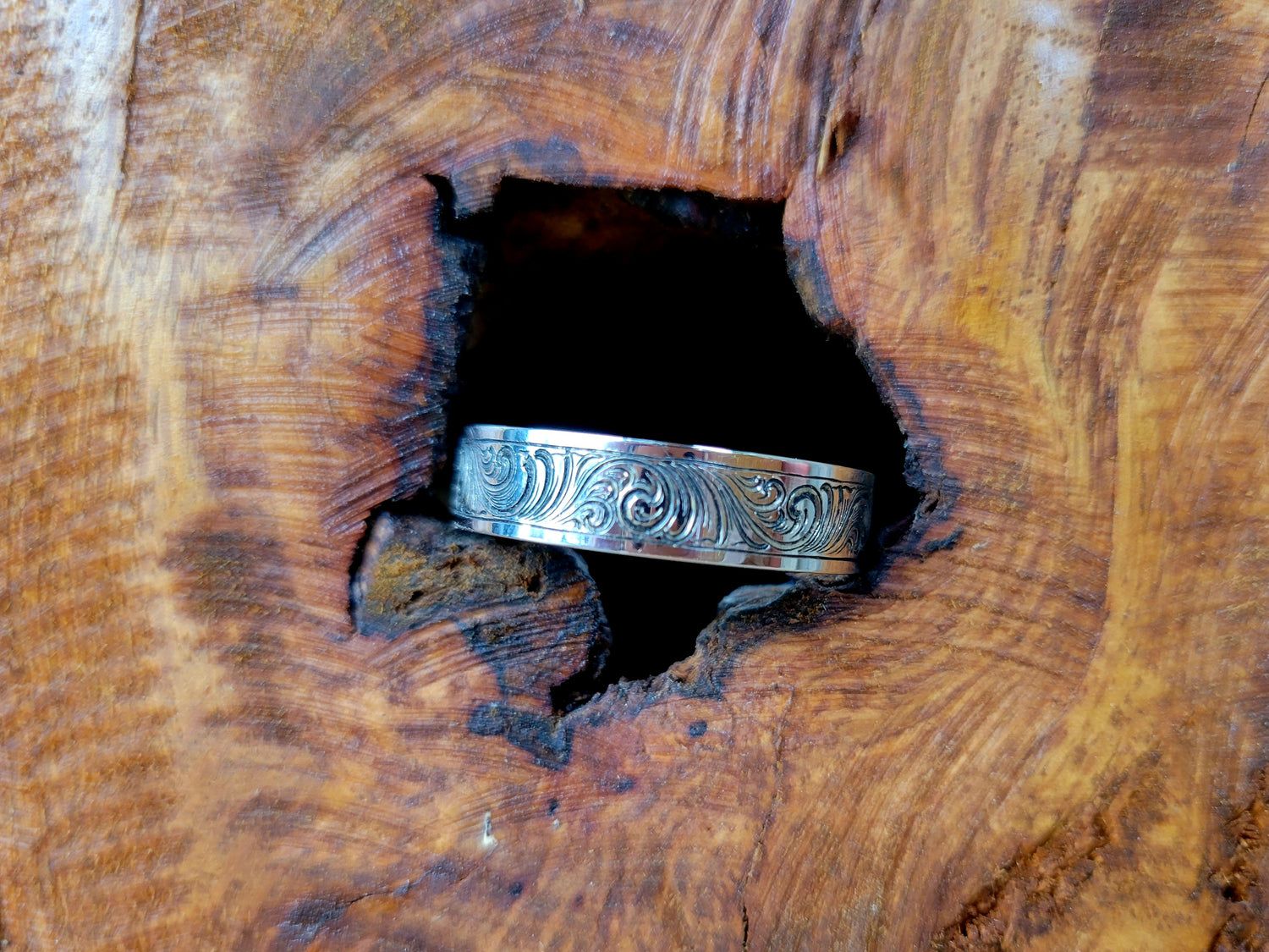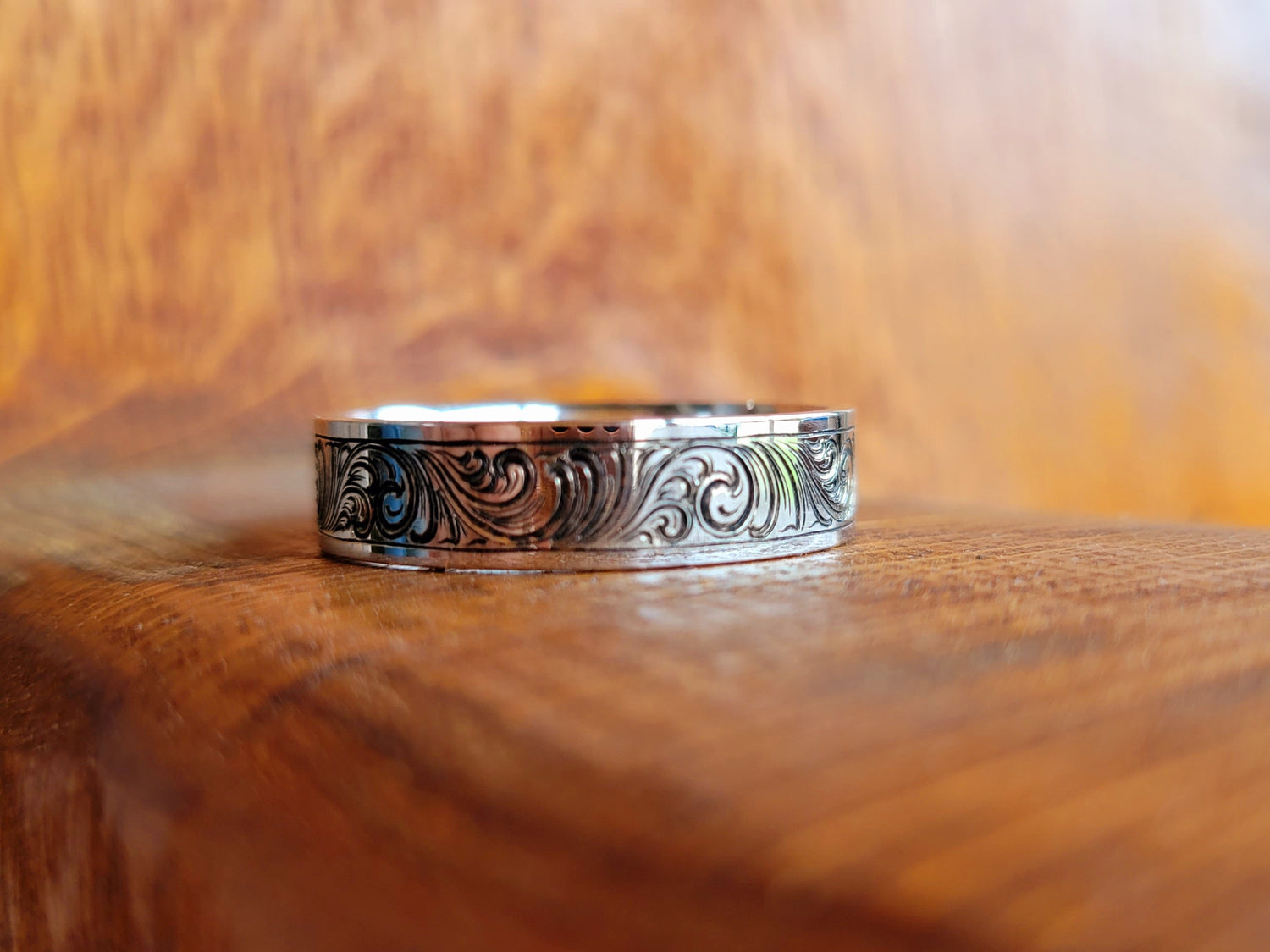At 6mm with comfort fit, this band is comfortable and balanced. It is fully hand-engraved with incredible Western scrollwork.