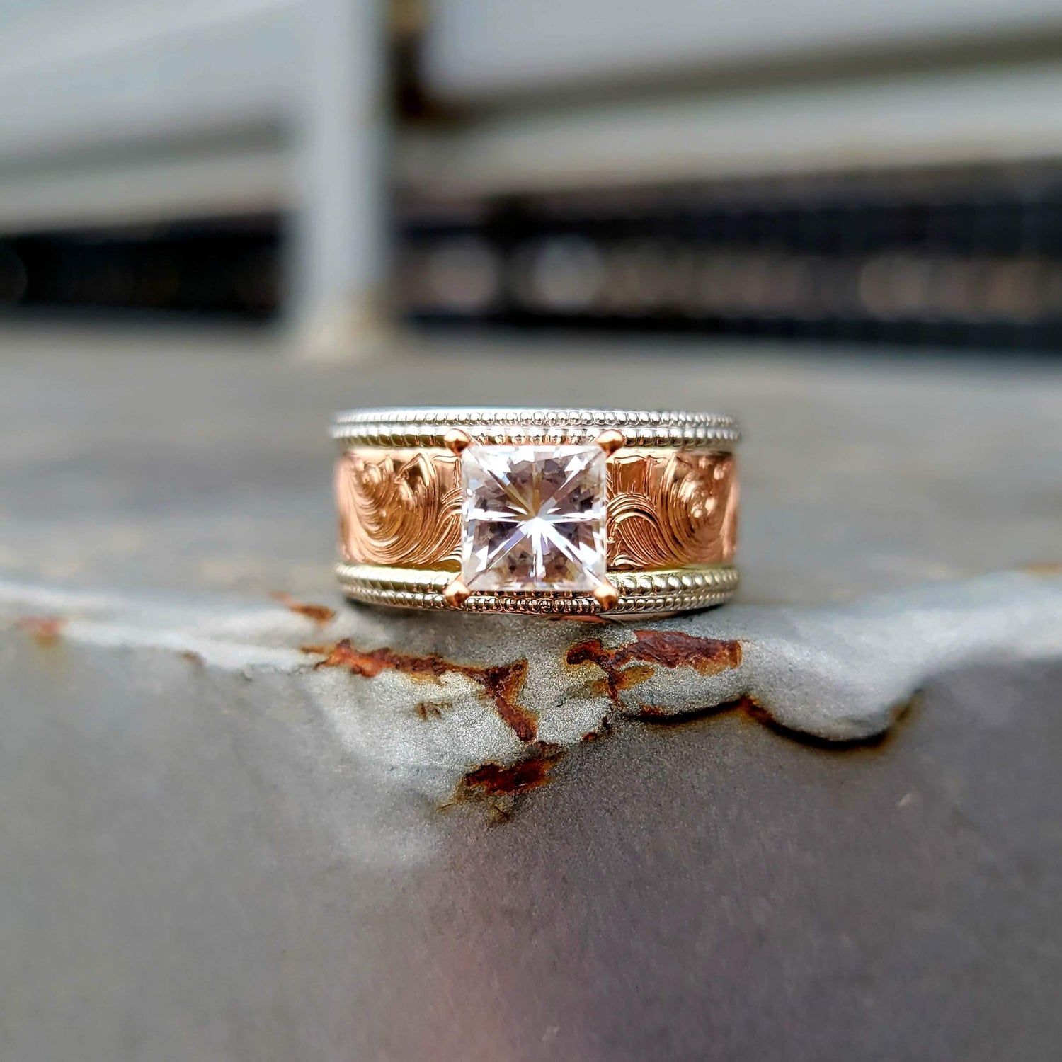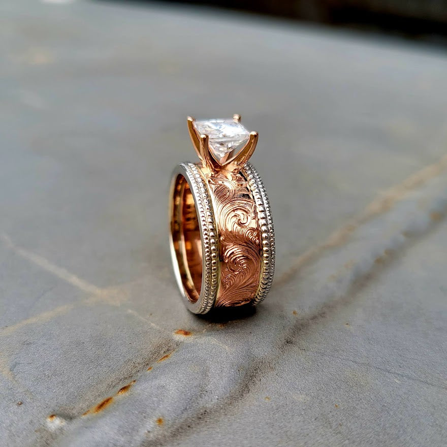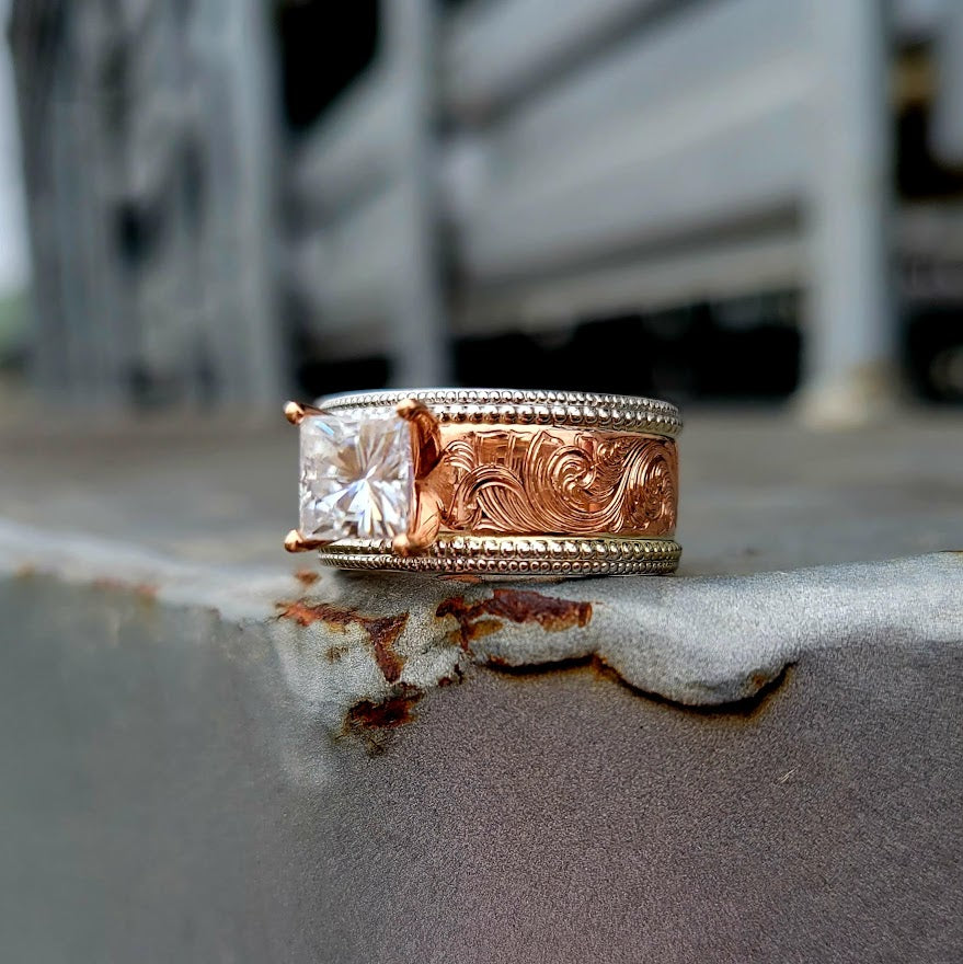 A brilliant 1.25 moissanite sits atop an intricate hand-engraved 10K rose gold band that sparkles with a double sterling silver bead edge, giving the illusion of tiny set diamonds without the cost.
