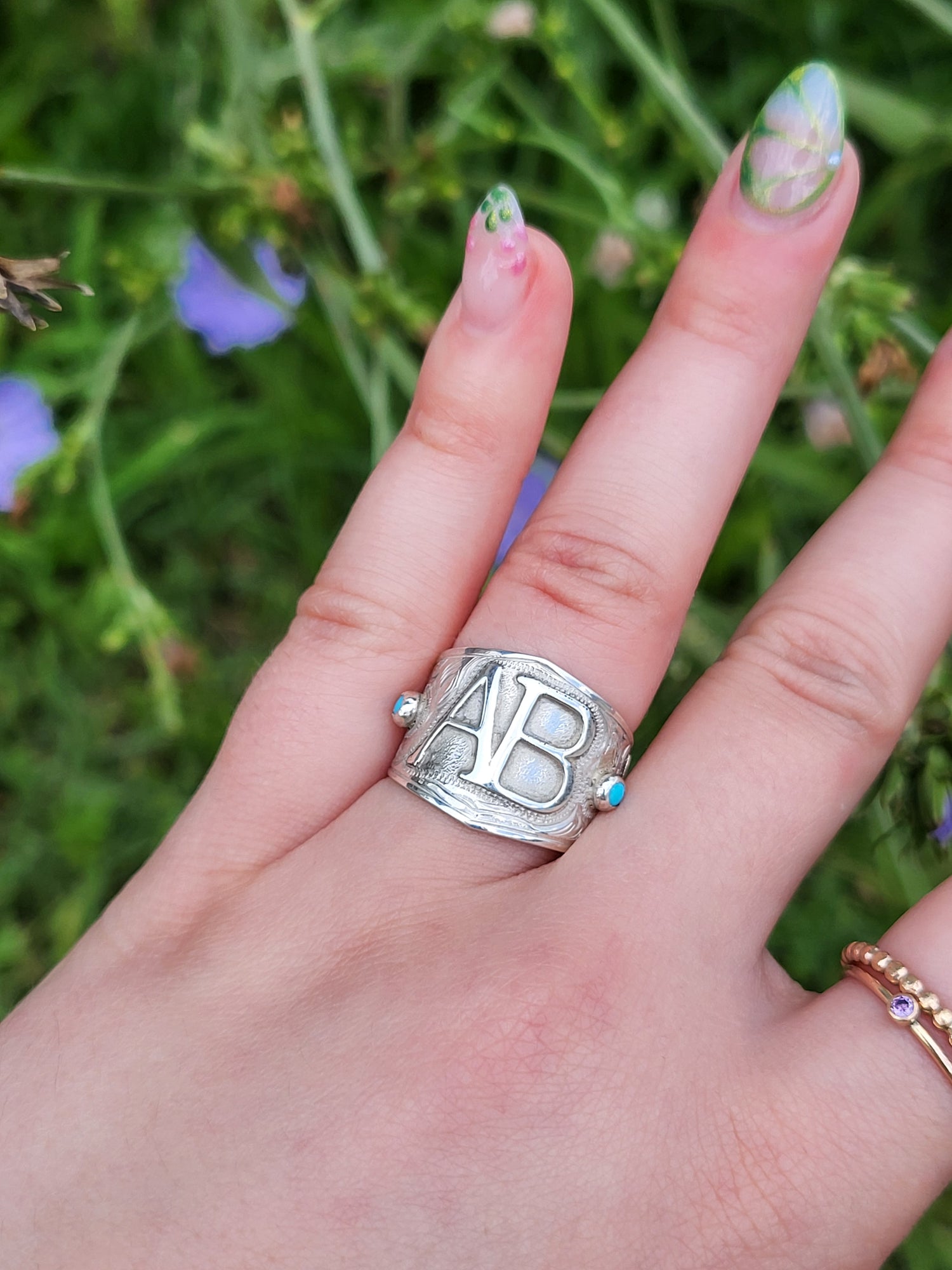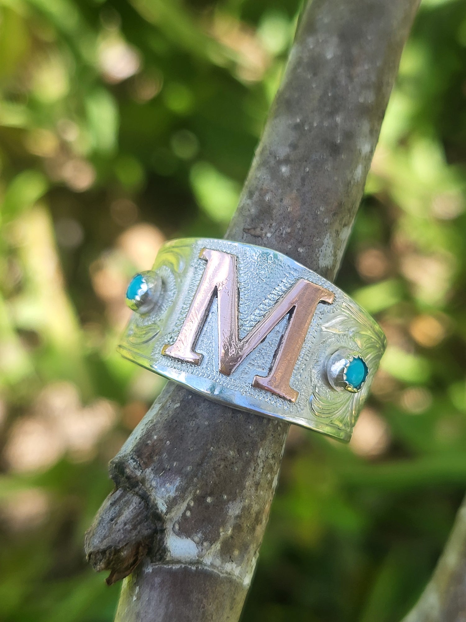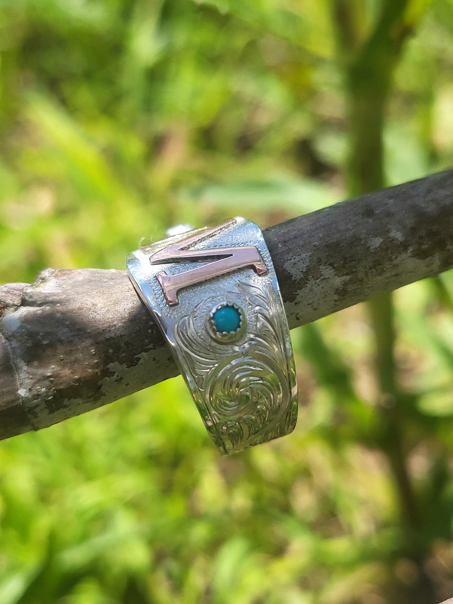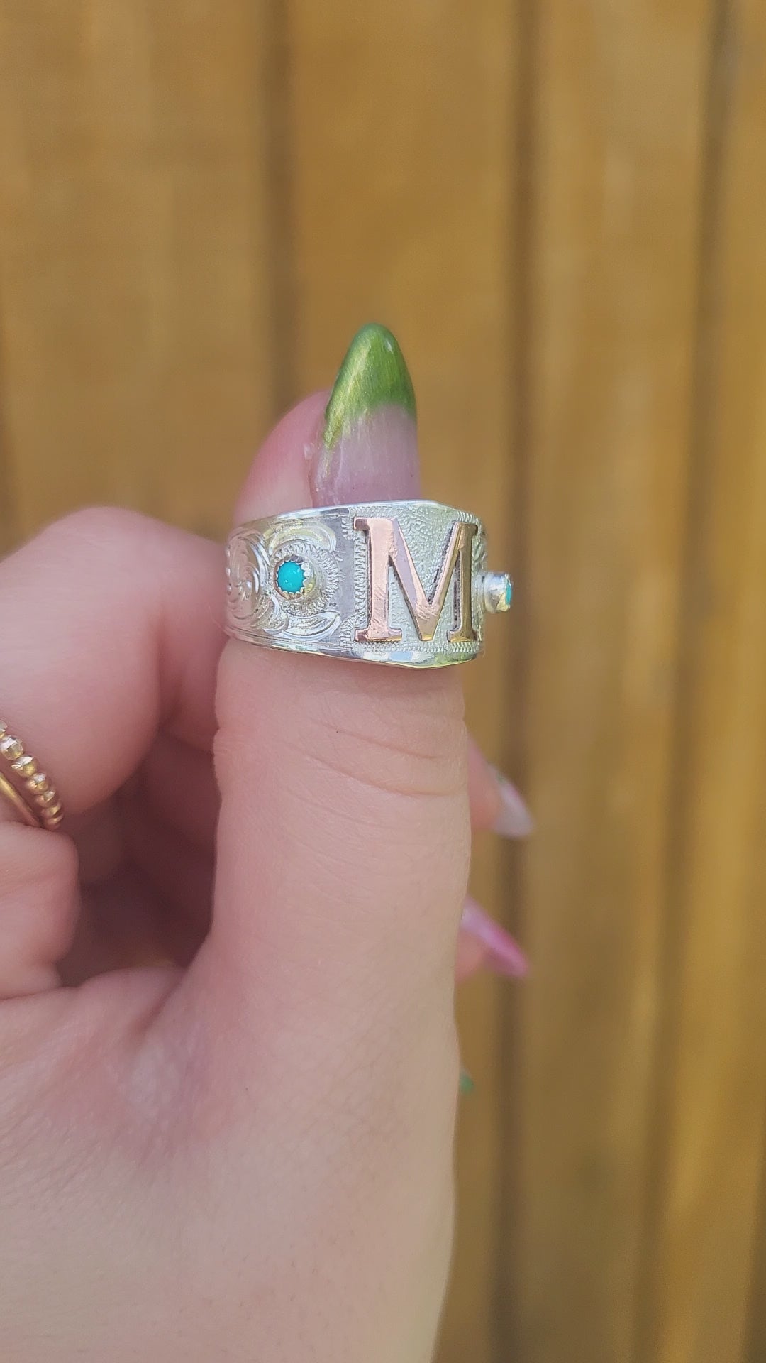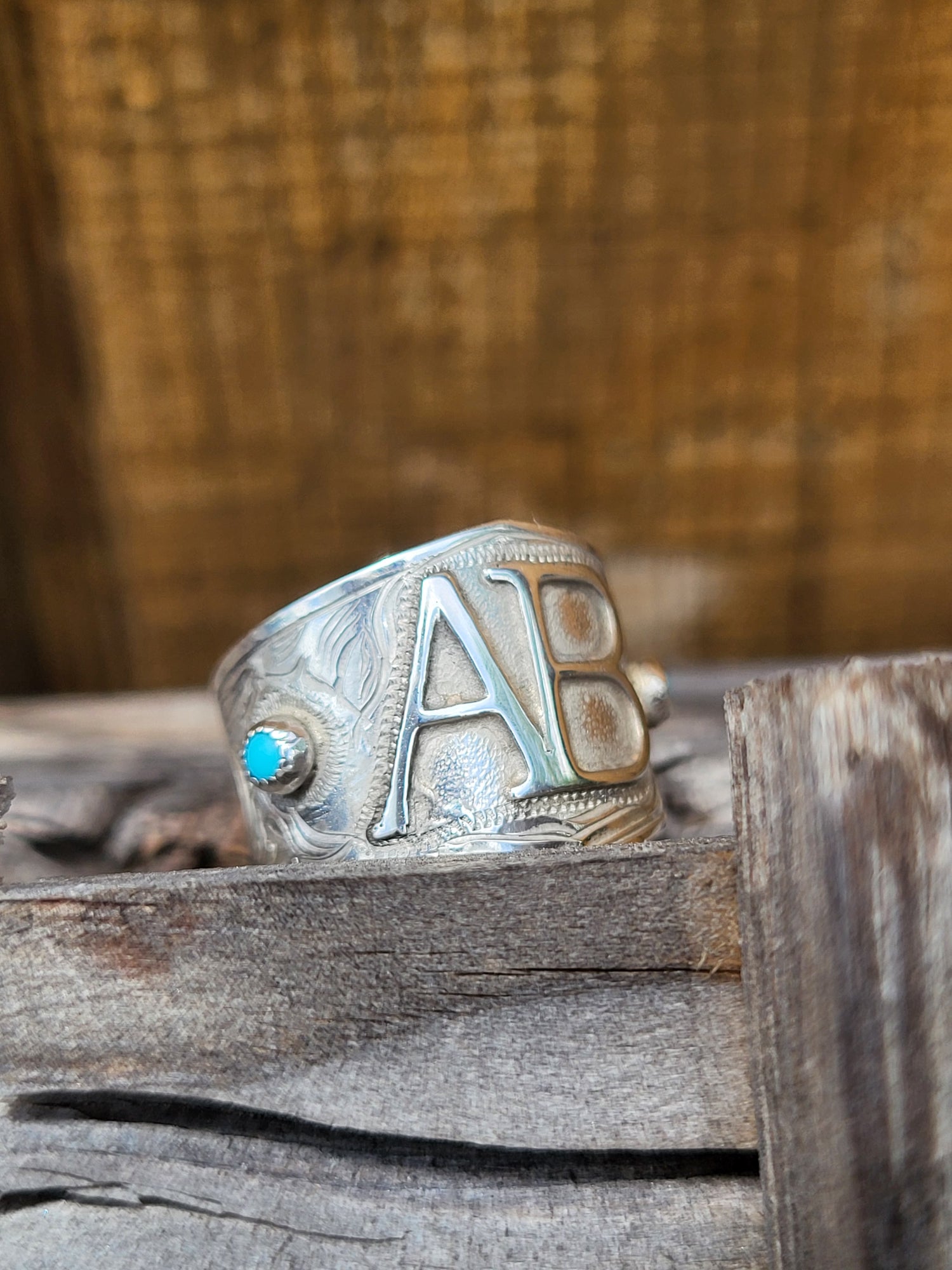 This custom inital ring is the cutest way to display your own inital or keep your cowboy's inital close at hand! Mix and match metals, fonts, and gems to make something truely unique.