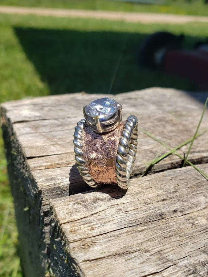 Beautiful copper hand-engraved ring with silver "rope" edge, hand made with love in Eminence Missouri by western designer and engraver Ryan Liggett.
