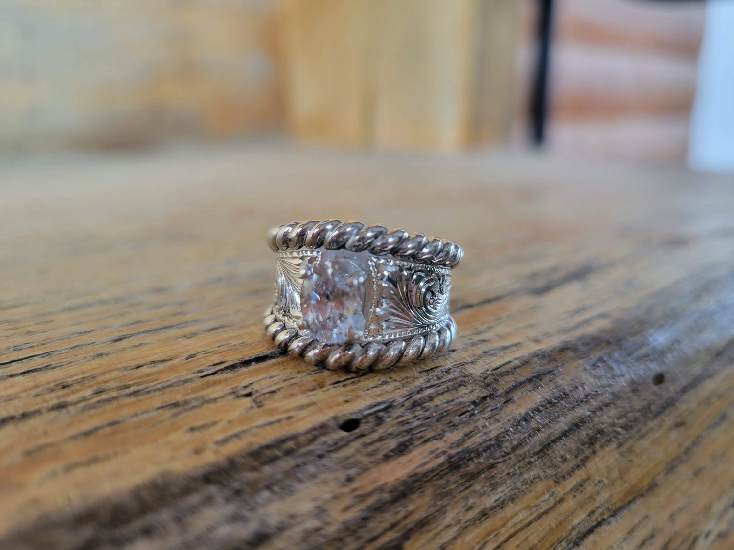 Make a bold statement with this hand-engraved sterling silver ring. It features a stylish rope edge, meticulous western engraving, and a unique oval mossinate setting.