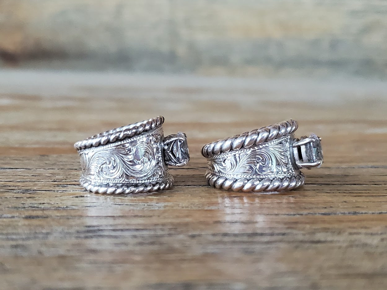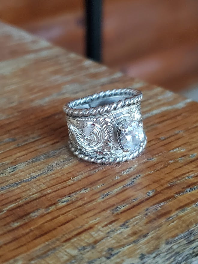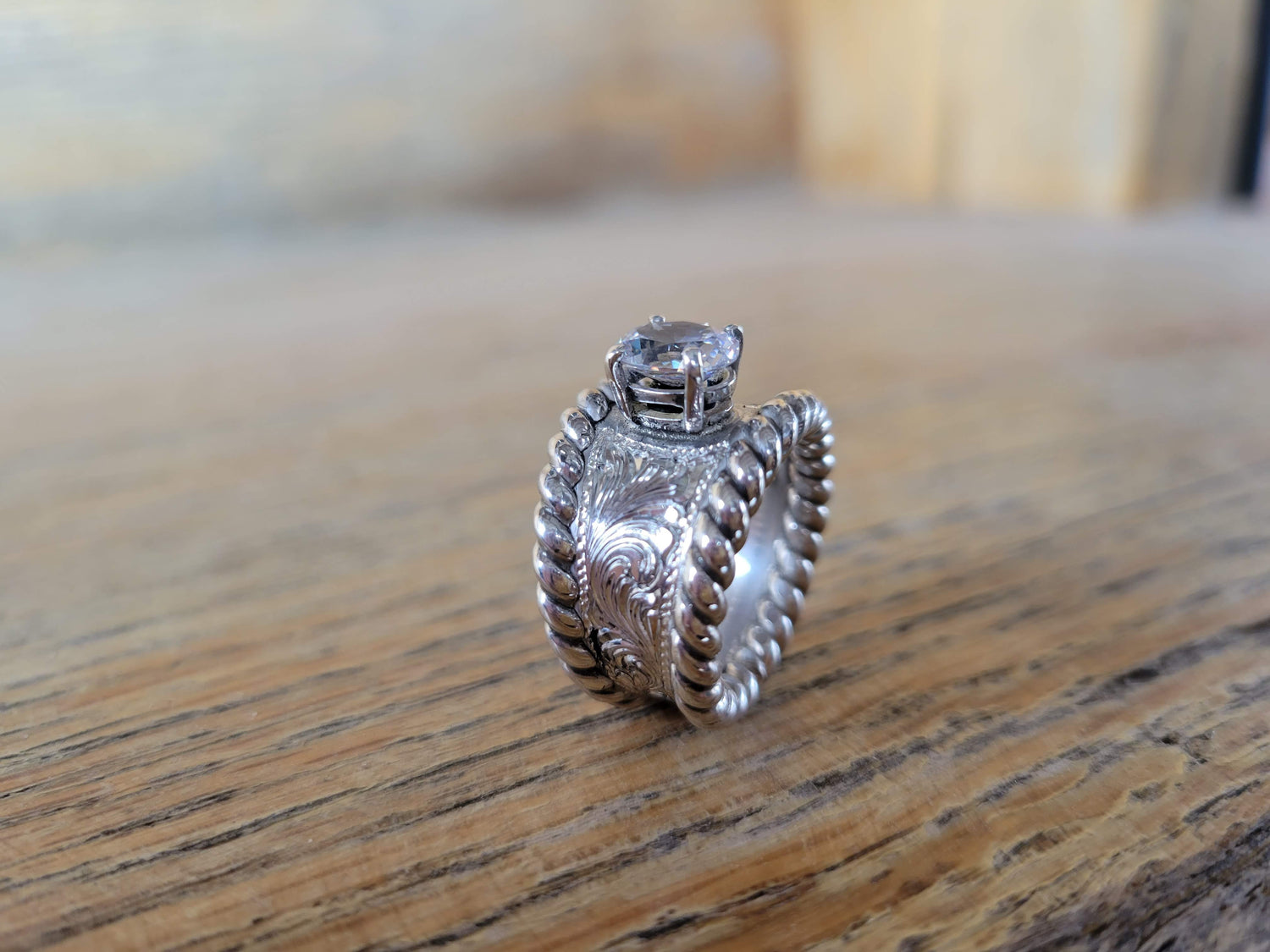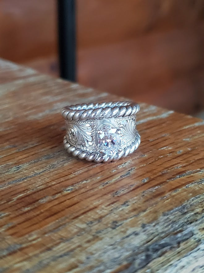 Sterling Silver Engraved Ring with Unique Oval Setting and Rope Edge