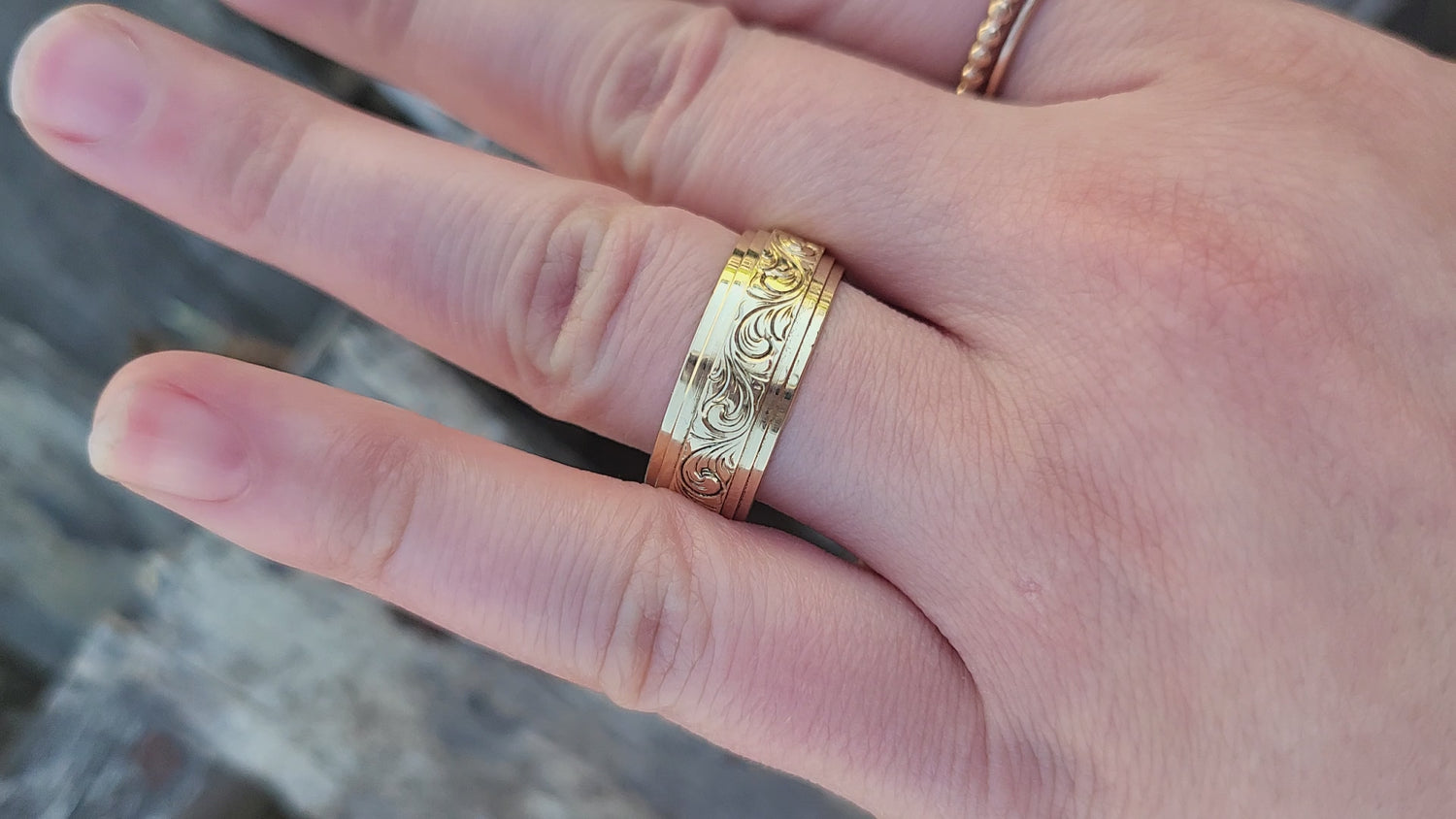 This bold band is the perfect choice for your bold cowboy. At 8mm with a triple stepped edge, it glows in 10K yellow gold, and reflects the sunlight beautifully. The center is hand-engraved with our classic Western scrollwork.