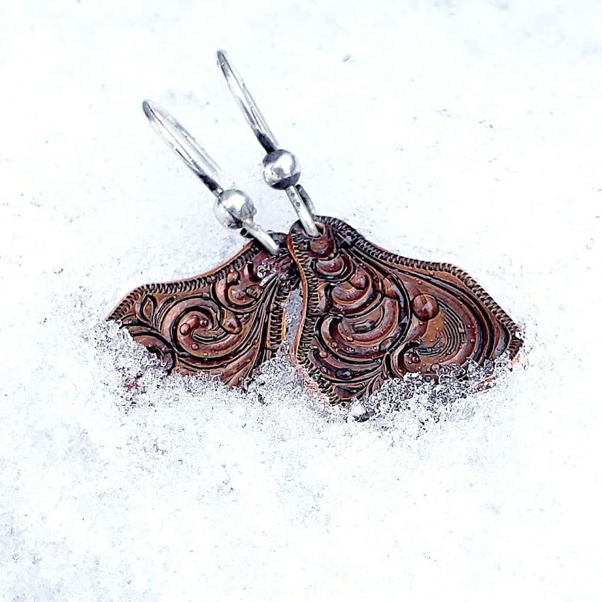 Beautiful copper hand-engraved cow tag earrings, hand made with love in Eminence Missouri by western designer and engraver Ryan Liggett.