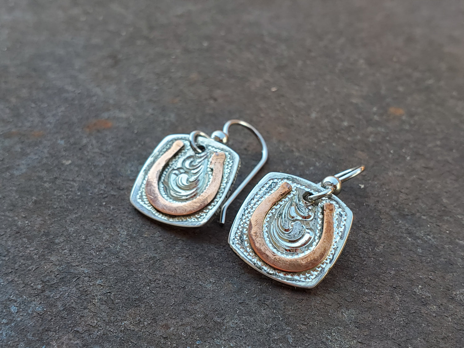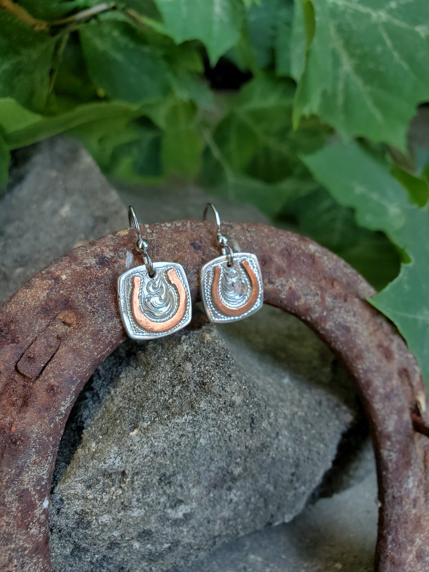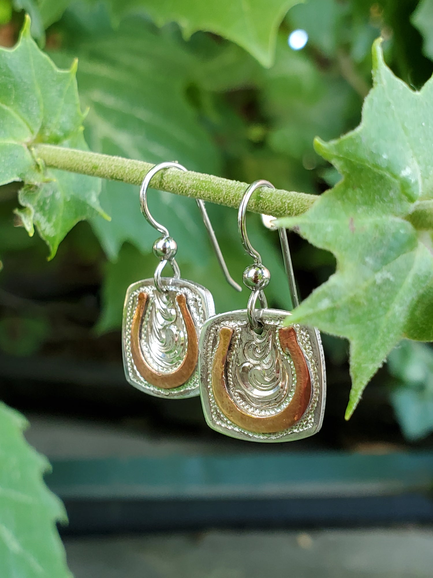 Lucky: Hand-engraved Sterling Silver and Copper Cowgirl Earrings with Horse-shoes, Western Earrings