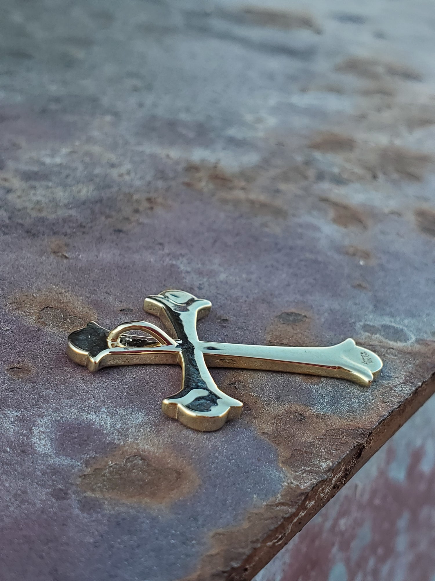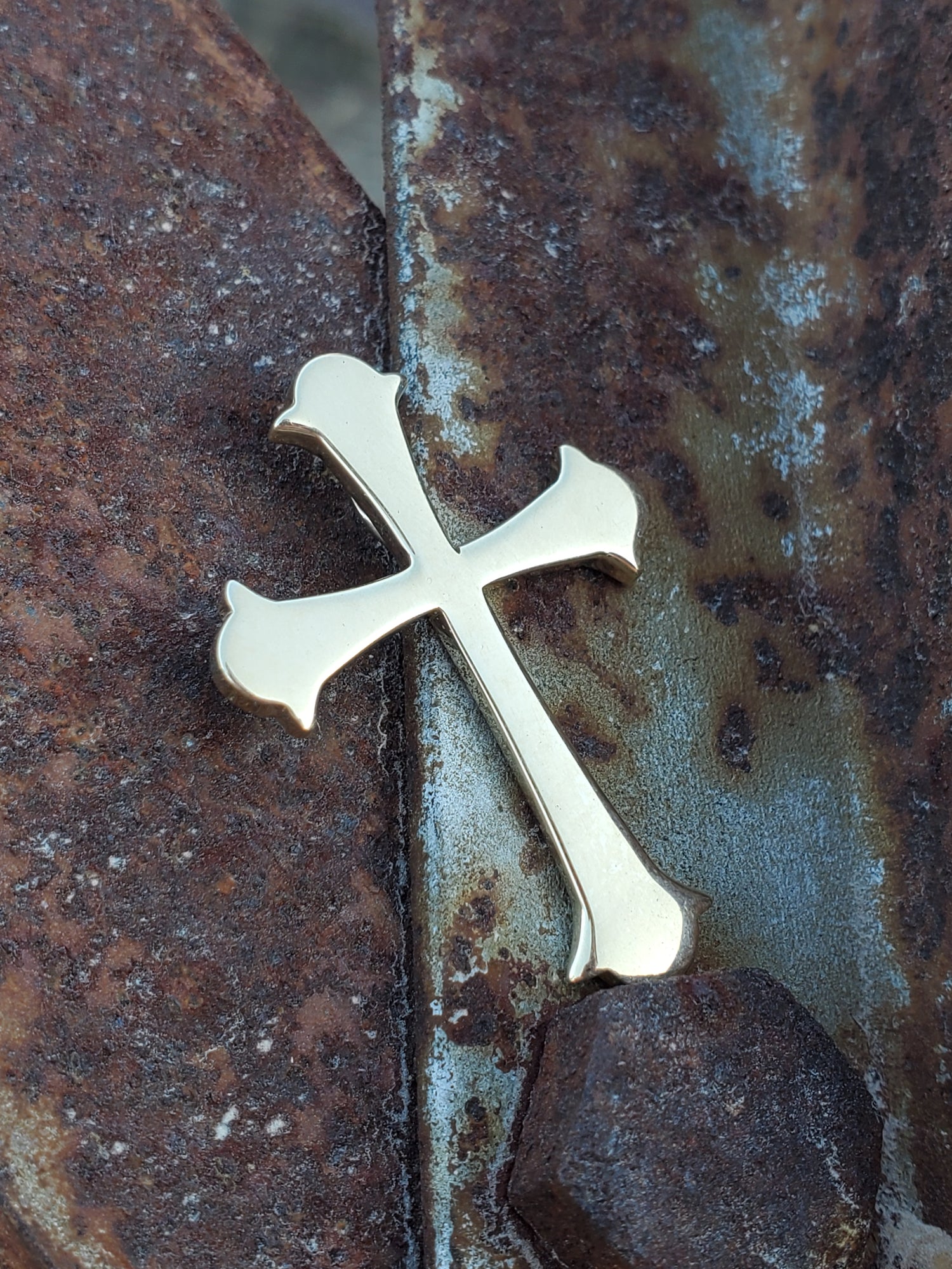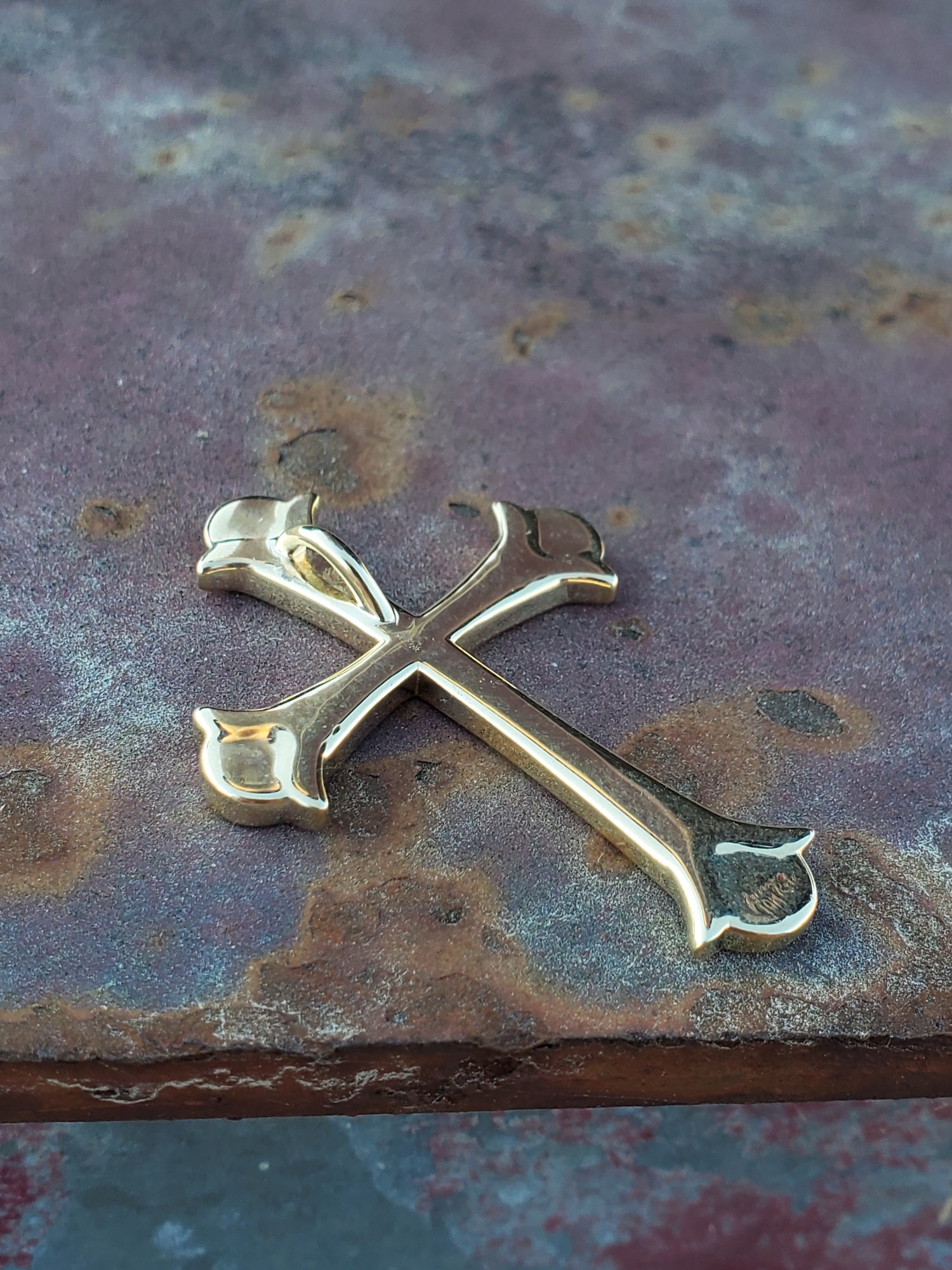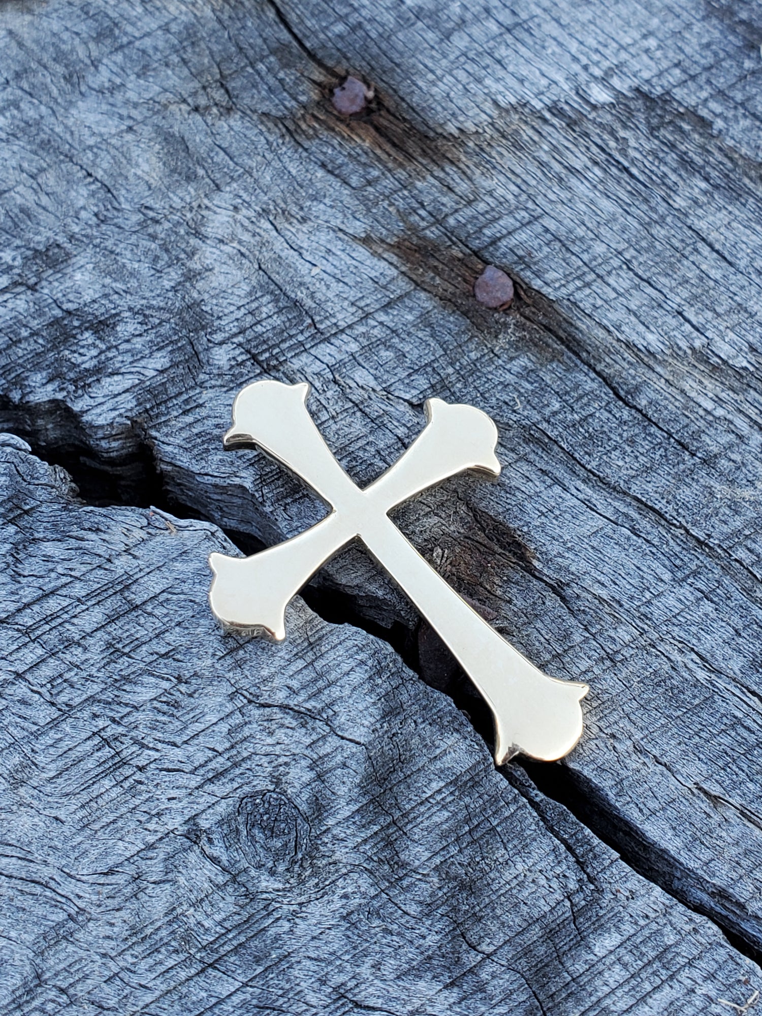 This simple cross glows in warm yellow gold. It is designed to be touched: it's tactile design is smooth, with rounded edges. The edges of the cross come out at a point for western flair. The bail is hidden in the back, so the design isn't inturupted.
