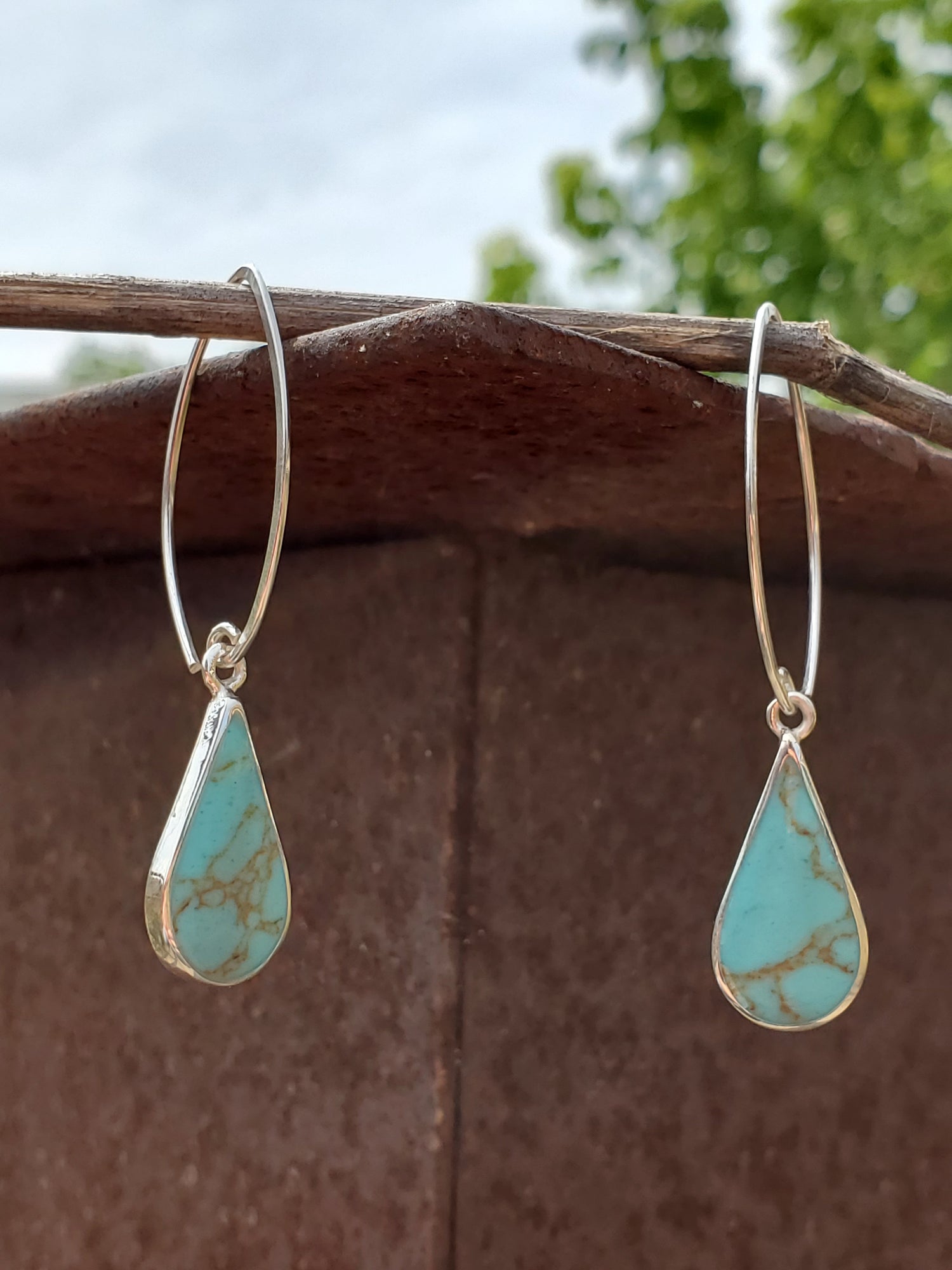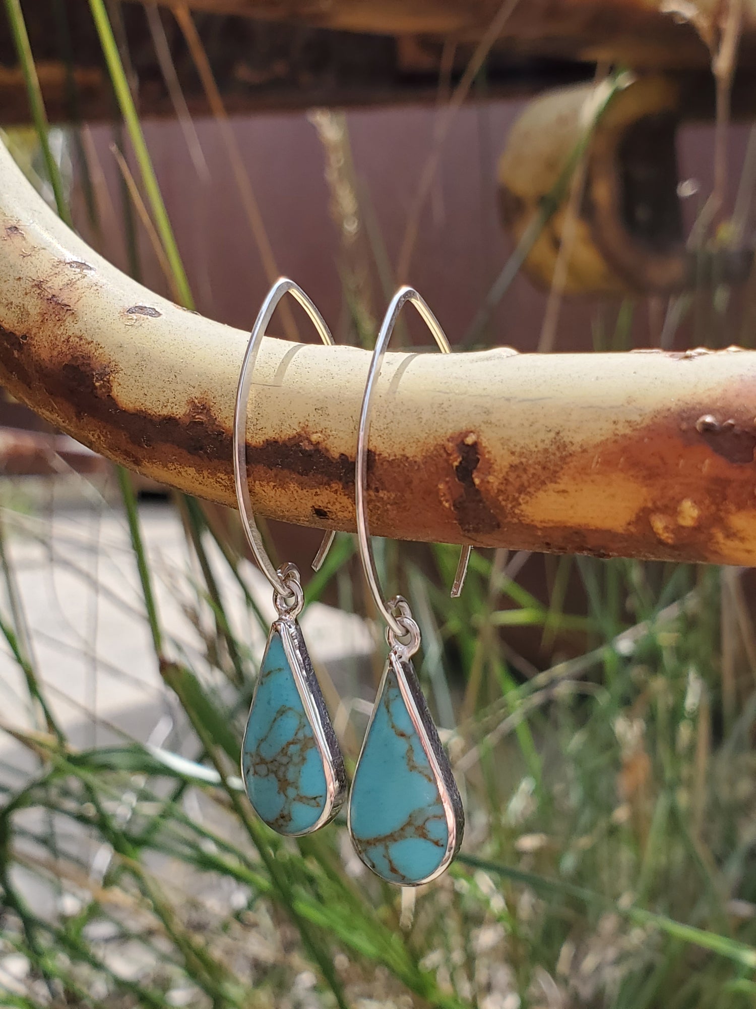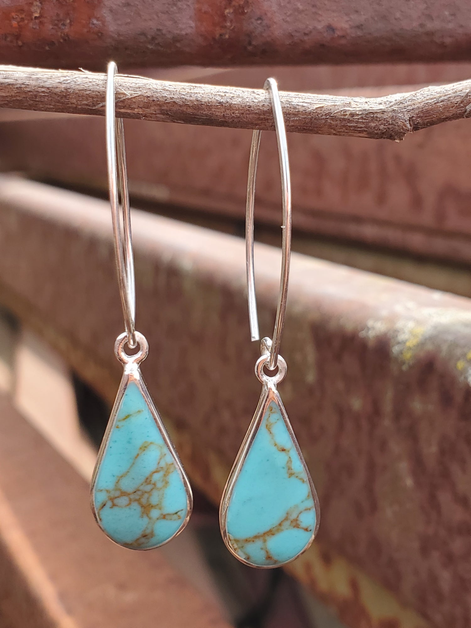 These sweet little earrings feature tear-drop-shaped turquoise set in sterling silver. The shape and sterling silver give them a beautiful modern look, and the turquoise lends a down-to-earth vibe, making this a great Western earring set.