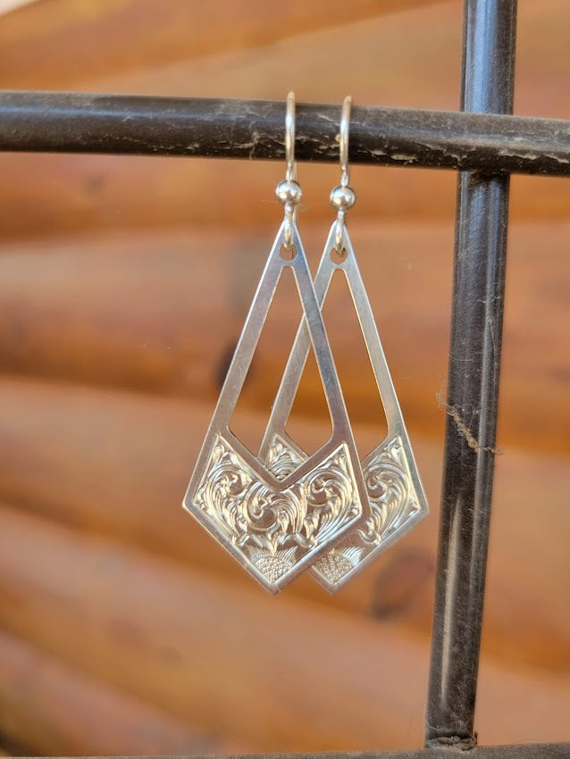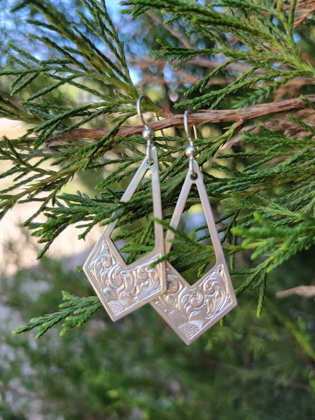 Sterling Silver Engraved Geometric Floral Drop Earrings, Western Bright Cut, Metal Fashion, Negative Space, Gifts for Her