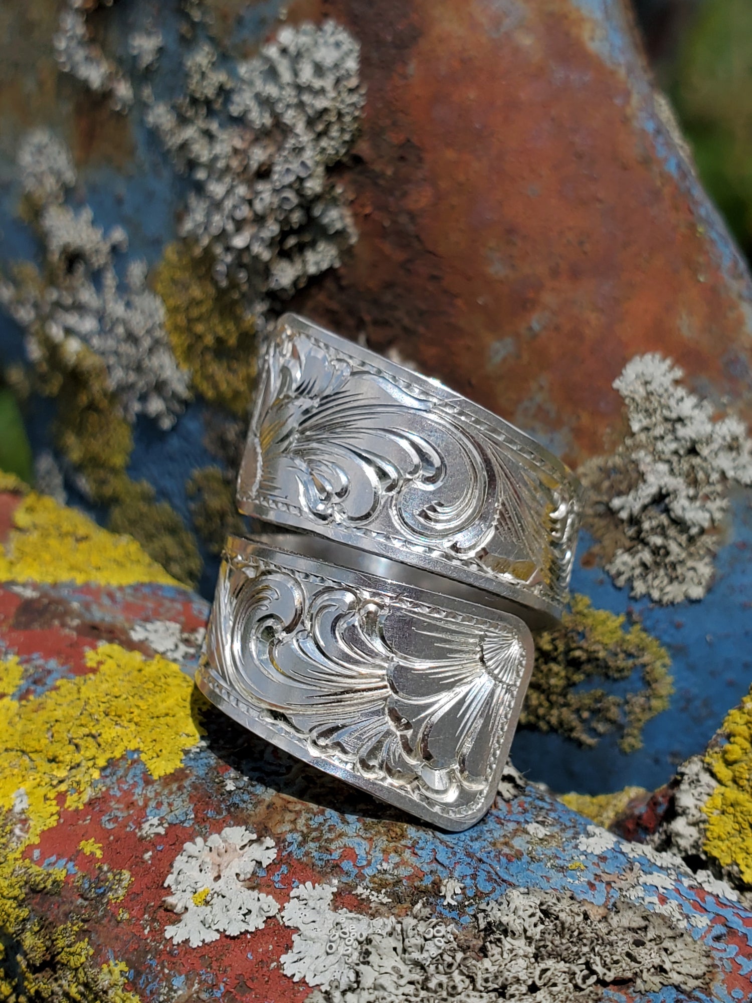 Beautiful sterling silver wrap-around, hand-engraved ring, hand-made with love in Eminence Missouri by Western designer and engraver Ryan Liggett.