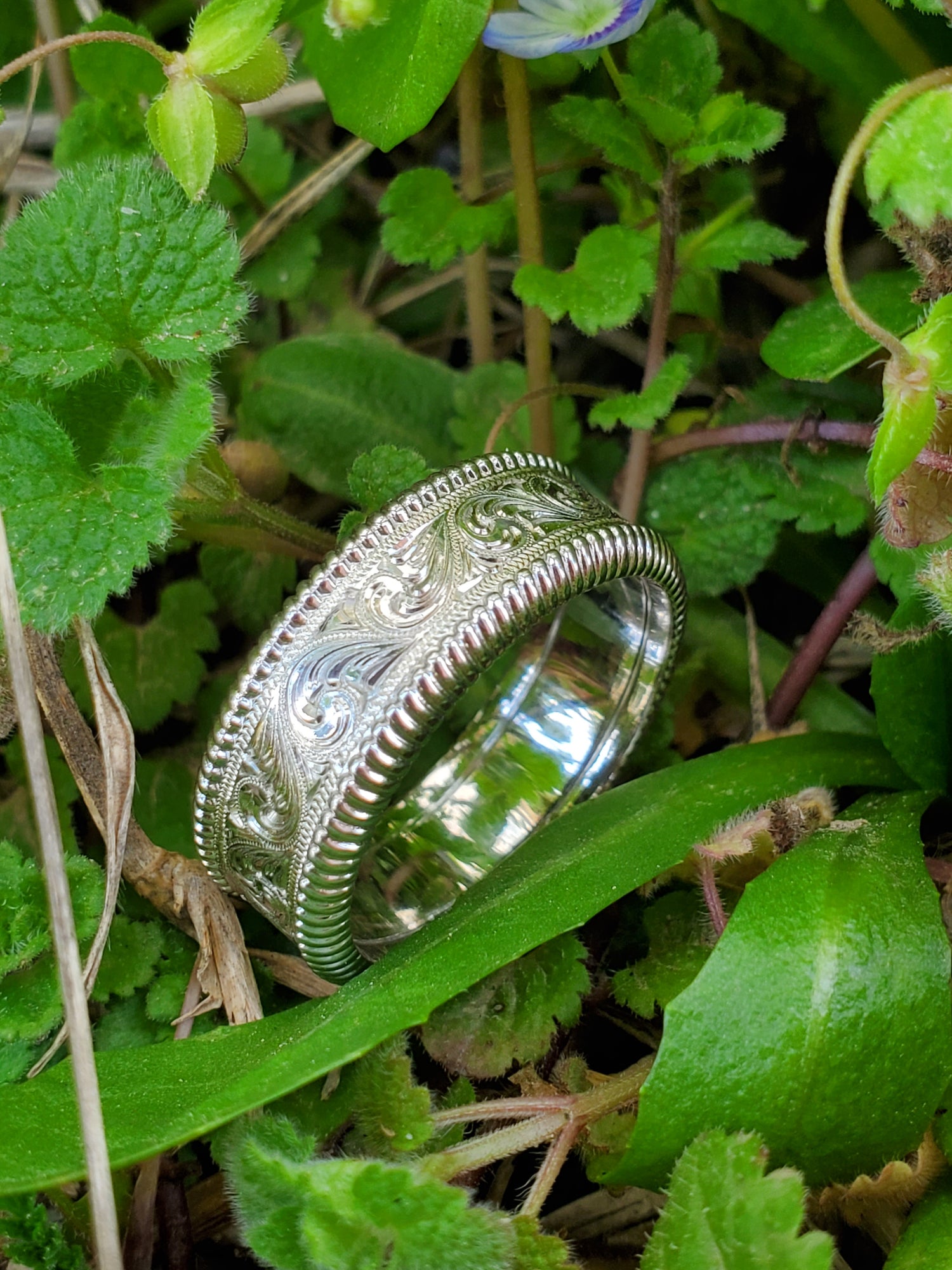 We make each piece one at a time for every order. Because of this, your final piece may vary slightly from the picture and the engraving style may be adjusted slightly to fit your ring size or customizations. Please allow ample time for shipment as we make your ring to order.