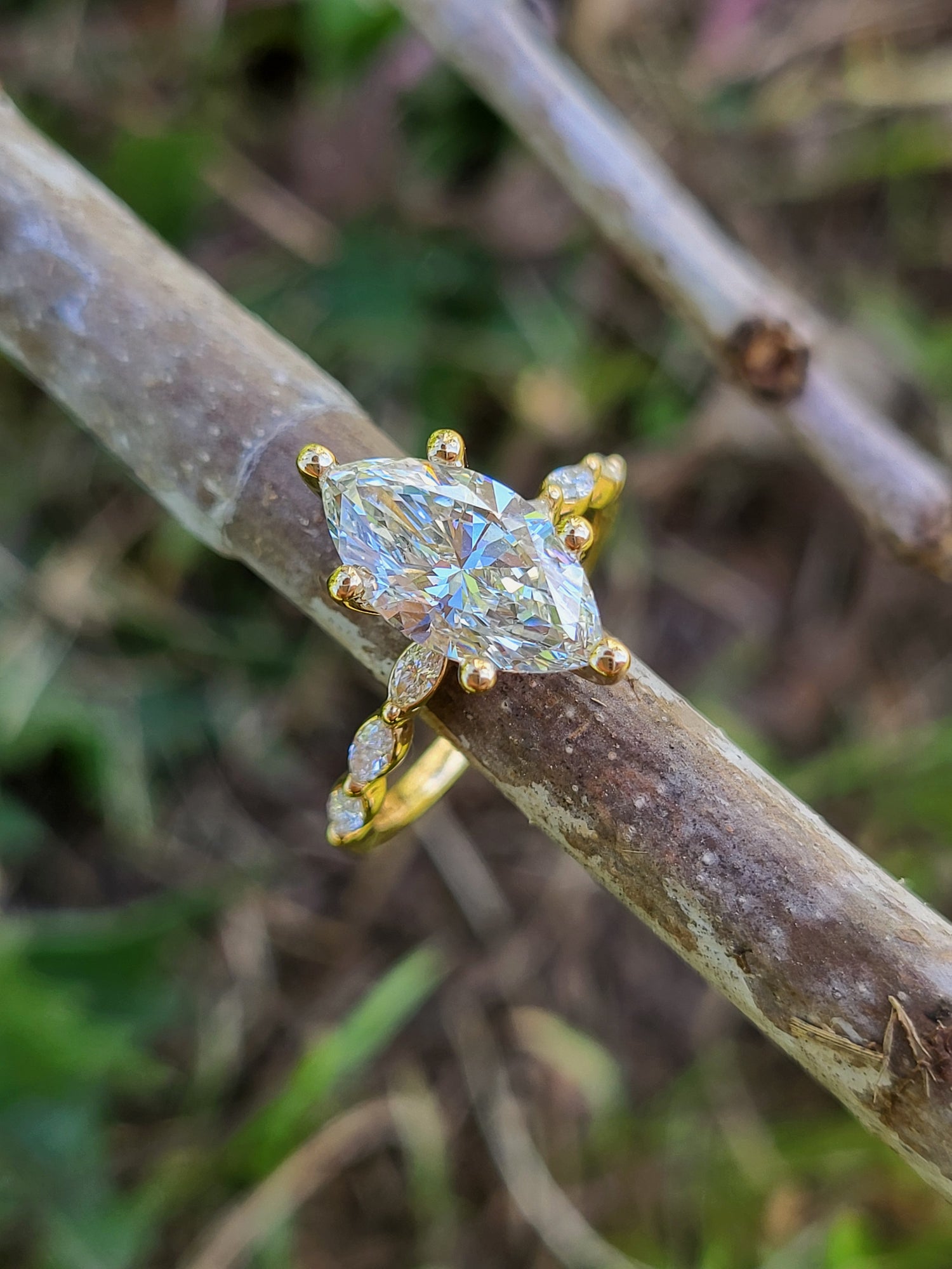 Designed to stack beautifully, this ring brings a playful yet refined touch to your everyday cowgirl-chic style. The ring features 6 dainty lab diamond marquise accent stones, and your choice of a 2 to 2.75ct lab diamond or moissanite center.
