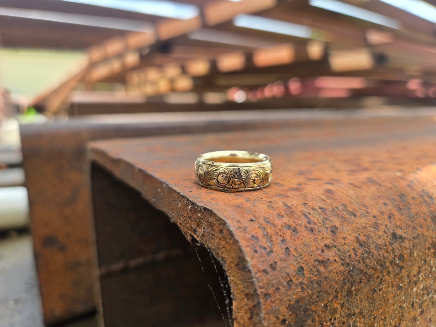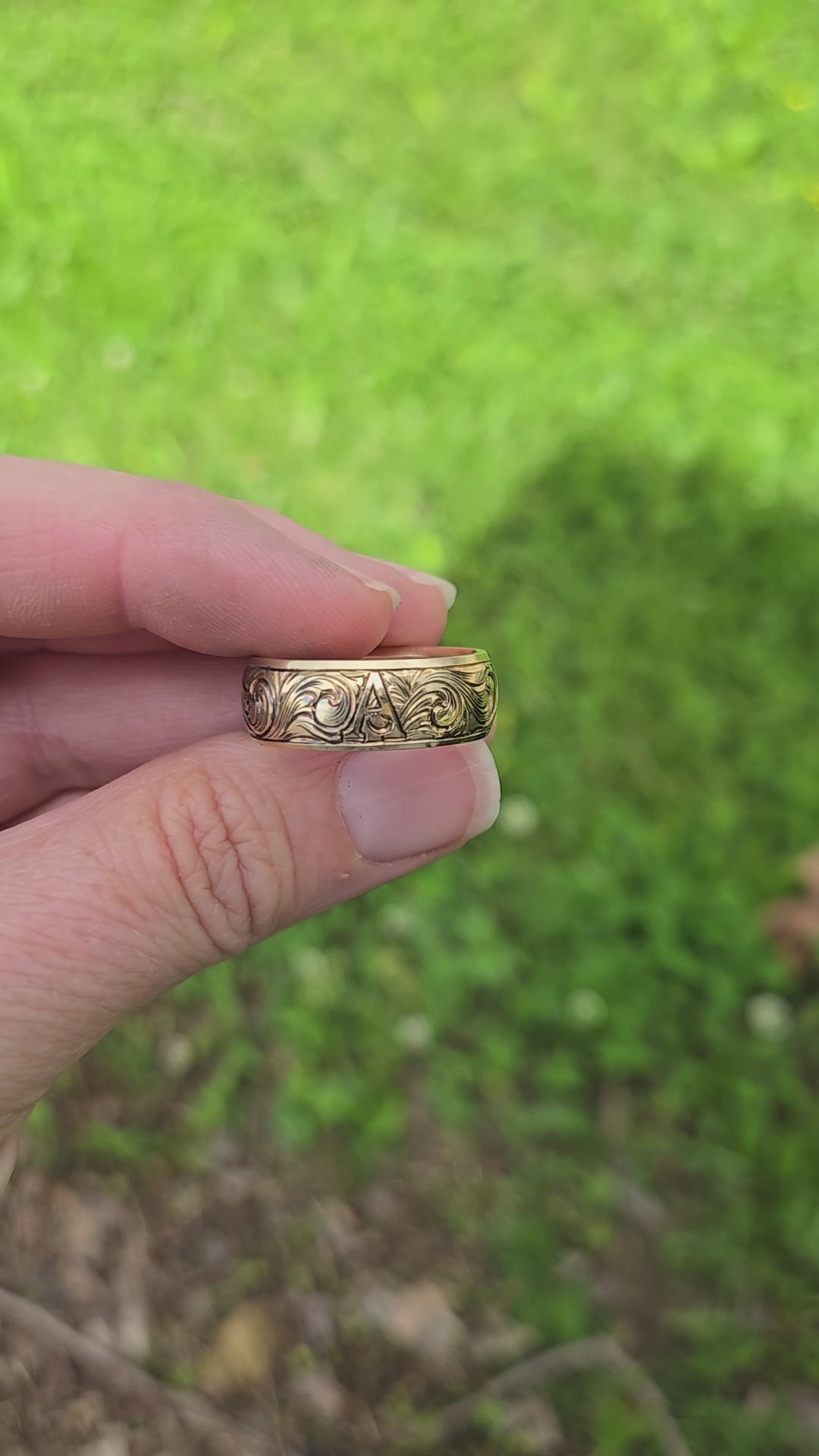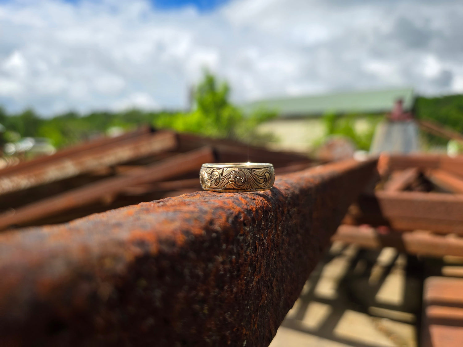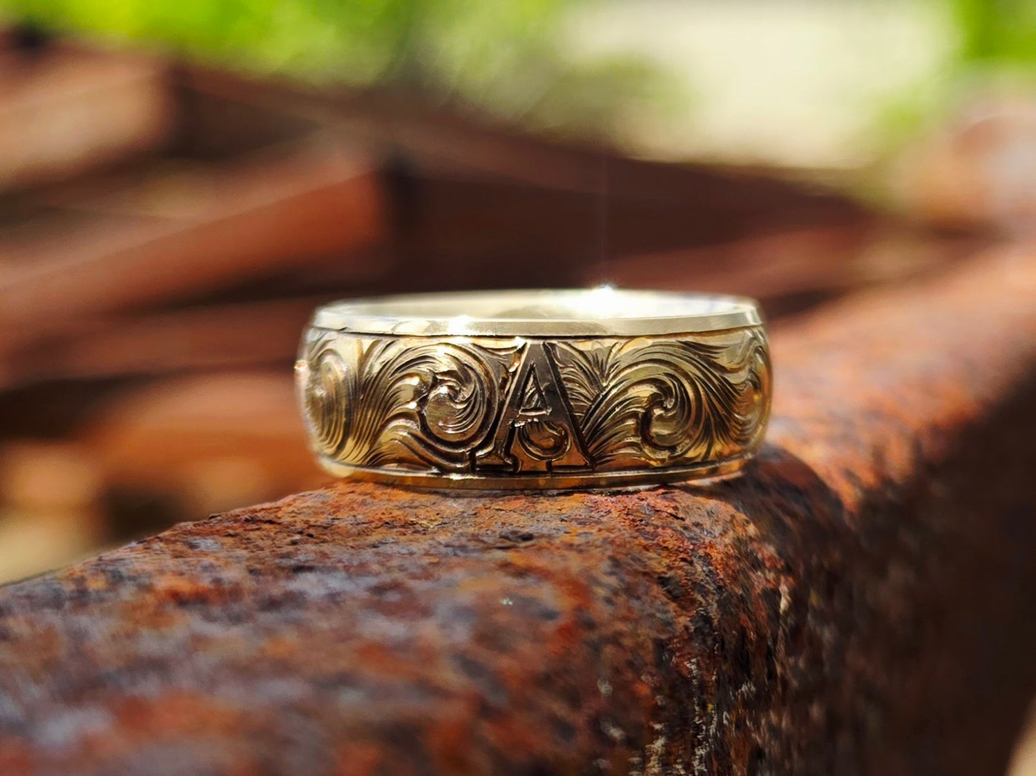 This 8mm heavy wedding band is like a hug for your finger, and feels SO solid. The band is domed and comfort fit, and avalible with a custom intial. The hand-engraved scrollwork wraps around the ring and adds dimention and Western flair.