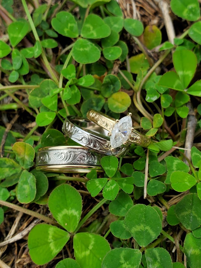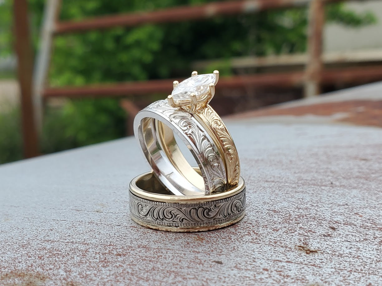All with coordinating metals and hand-engraving, this Western wedding ring trio features: