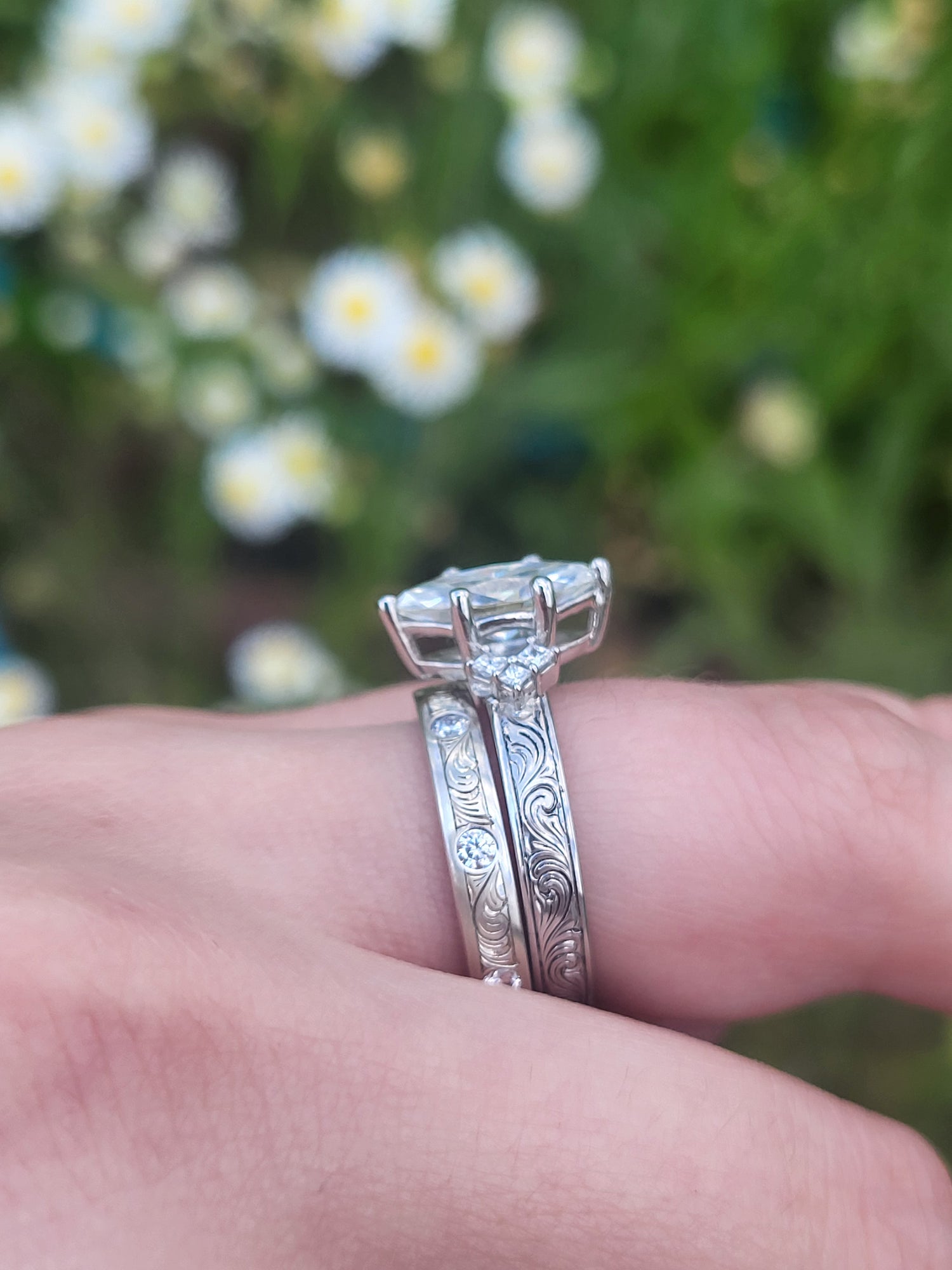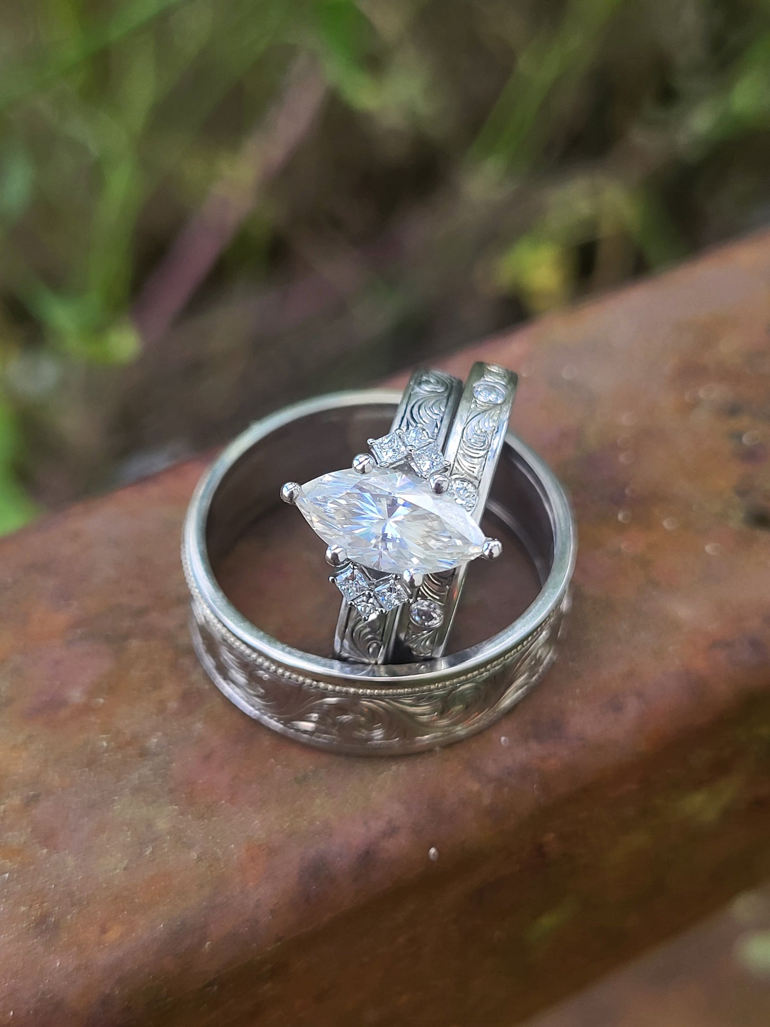 Individual pieces may vary slightly from the pictured item. We make each piece one at a time, for every order. Because of this, your final piece may vary slightly from the picture and the engraving style may be adjusted slightly to fit your ring size or customizations.