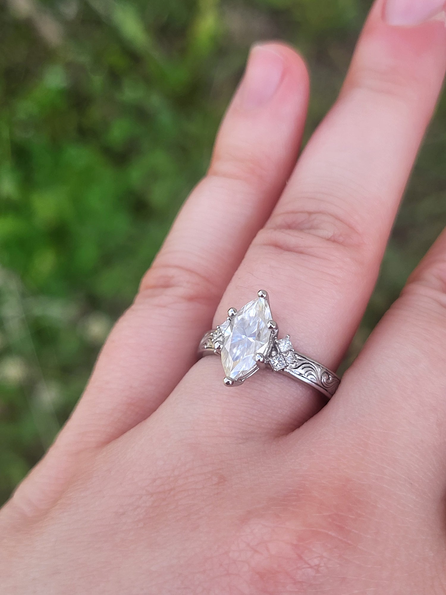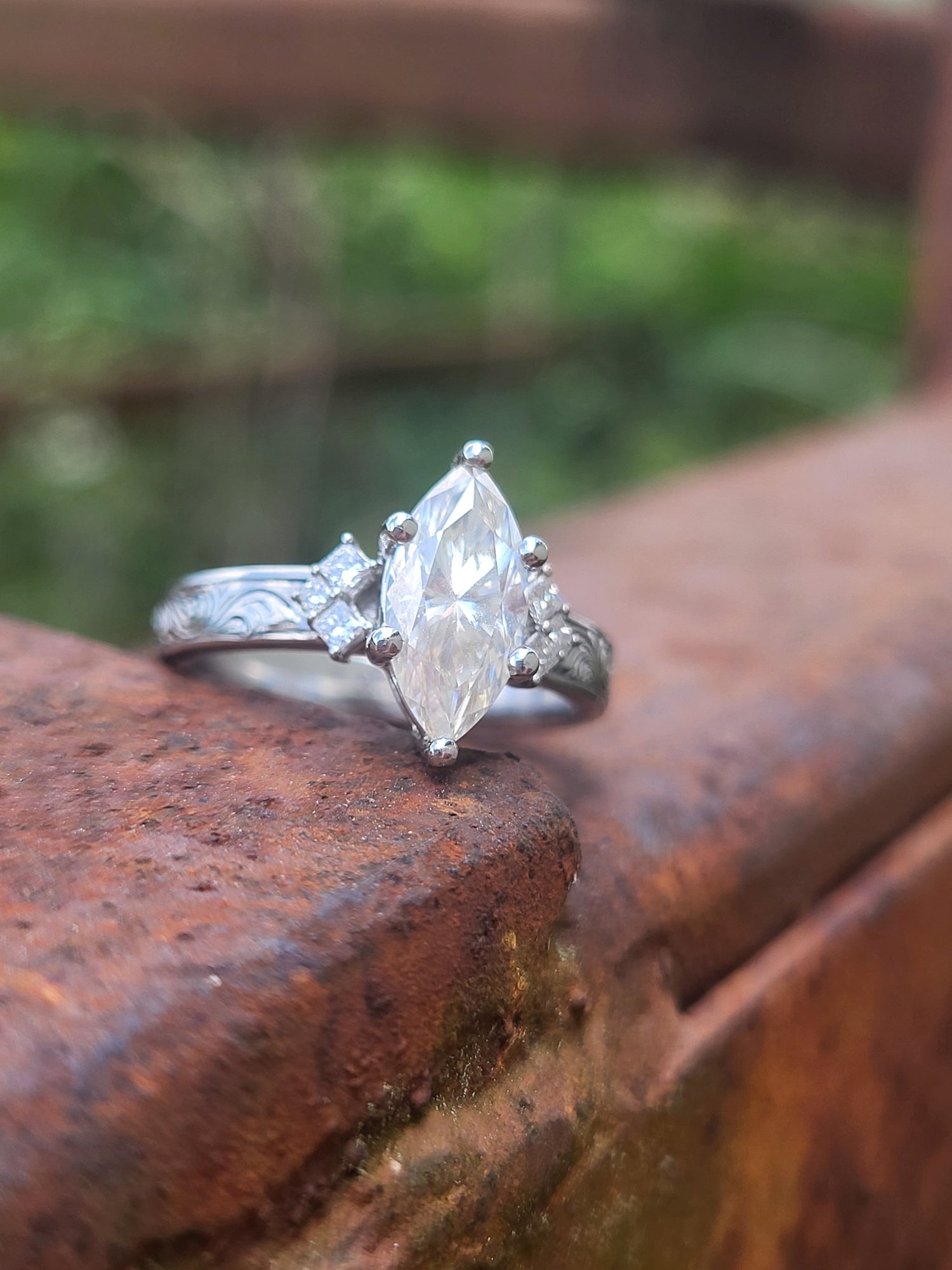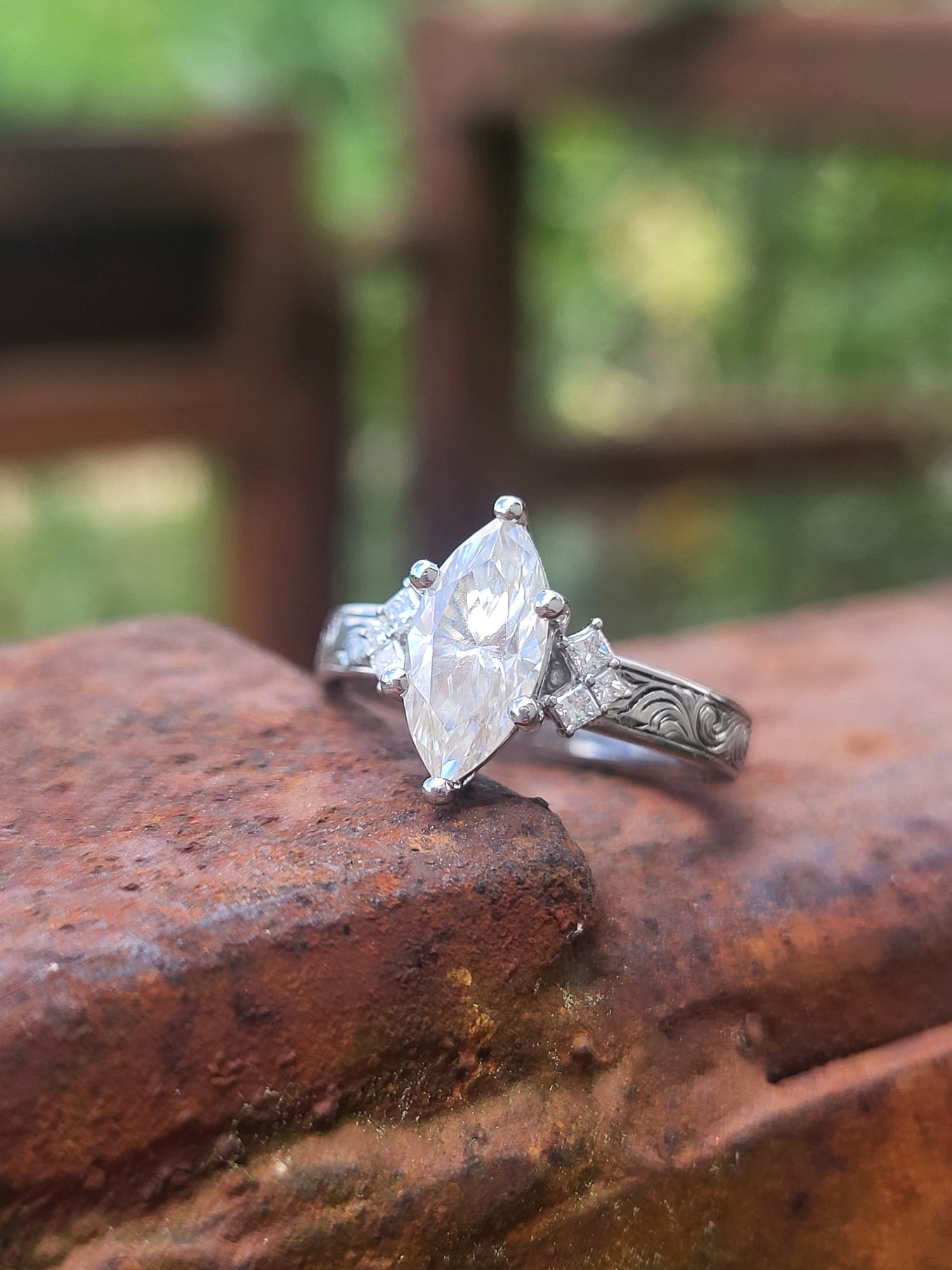The Delaney: 1 to 1.75ct Three-Stone Engagement Ring, 10K, 14K, or 18K White Gold Engagement Ring with 1ct to 1.75ct Marquise Center, Western Engagement Ring, Cowgirl Engagement Ring, Princess Cut Accents