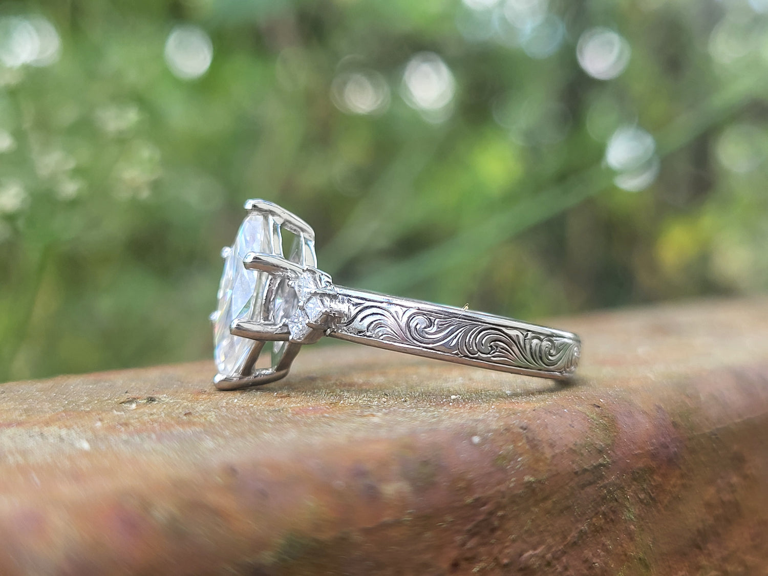 This stunning western engagement ring is mesmorizing, with a trio of glittering princess cut lab diamonds on either side of the center stone to create an intresting profile and optimal sparkle.