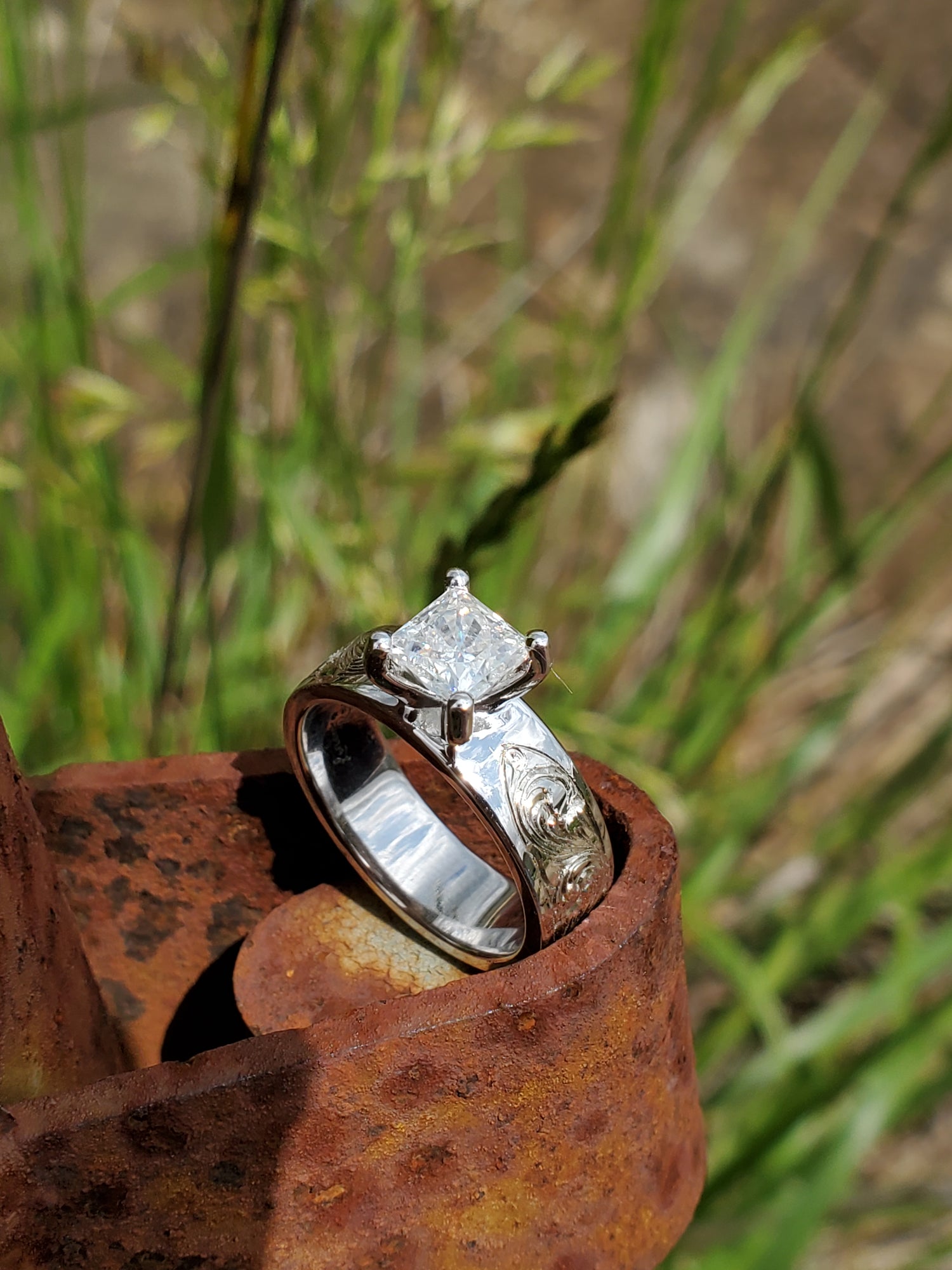 The Eloise: 10K White Gold and Diamond or Moissanite Engagement Ring, Western Engagement Ring, Cowgirl Engagement Ring, Cowgirl Ring, Hand-Engraved Ring