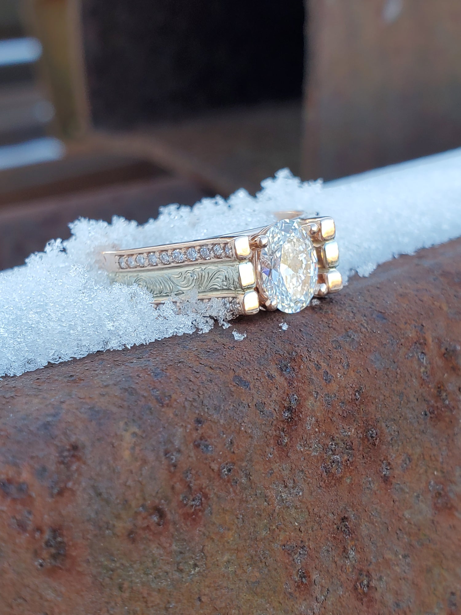 First, the engagement ring. It has hand-engraved 10K white gold with 10K rose gold sides. The sides have gorgeous channel-set diamonds that go halfway down the ring.