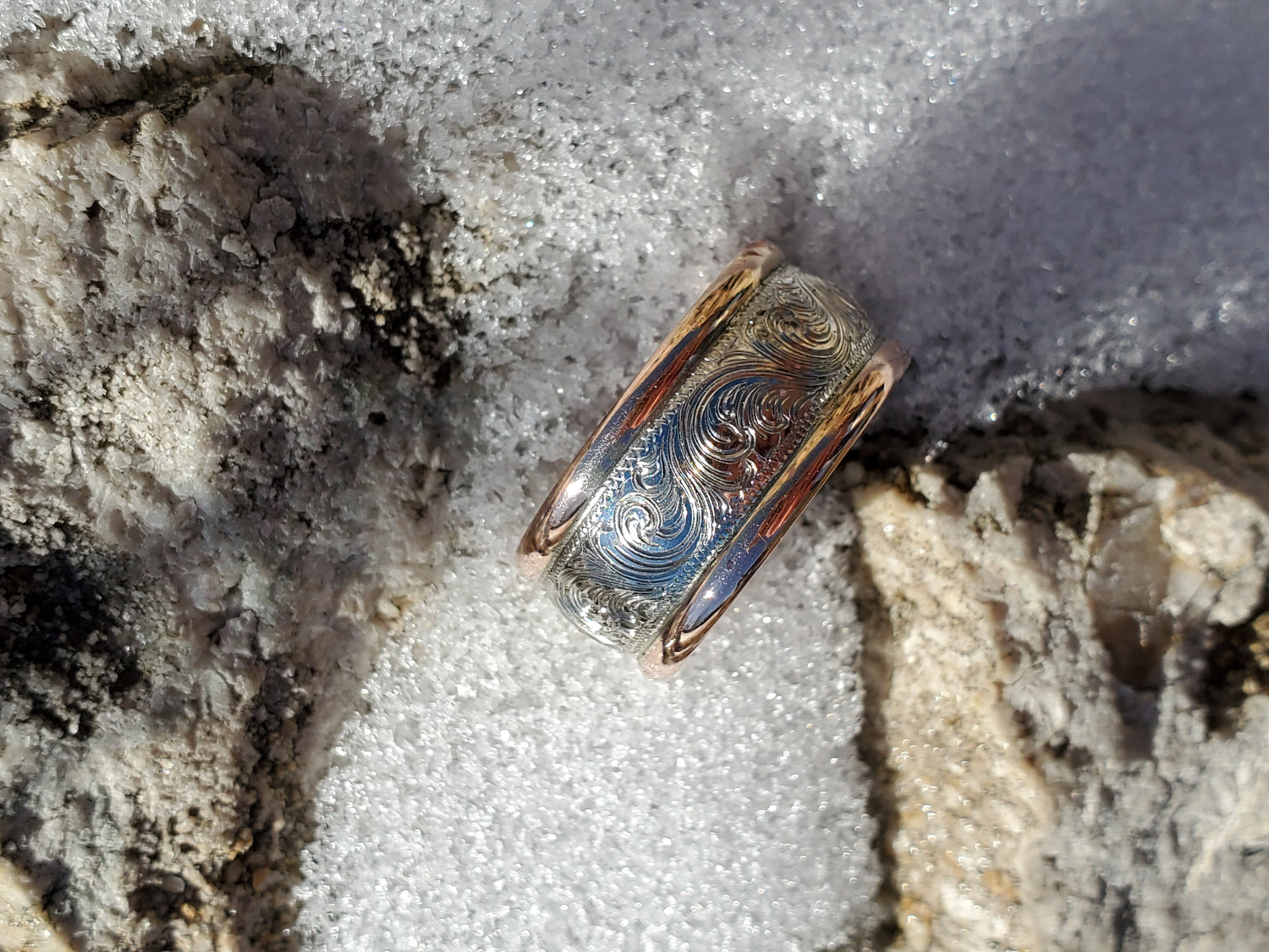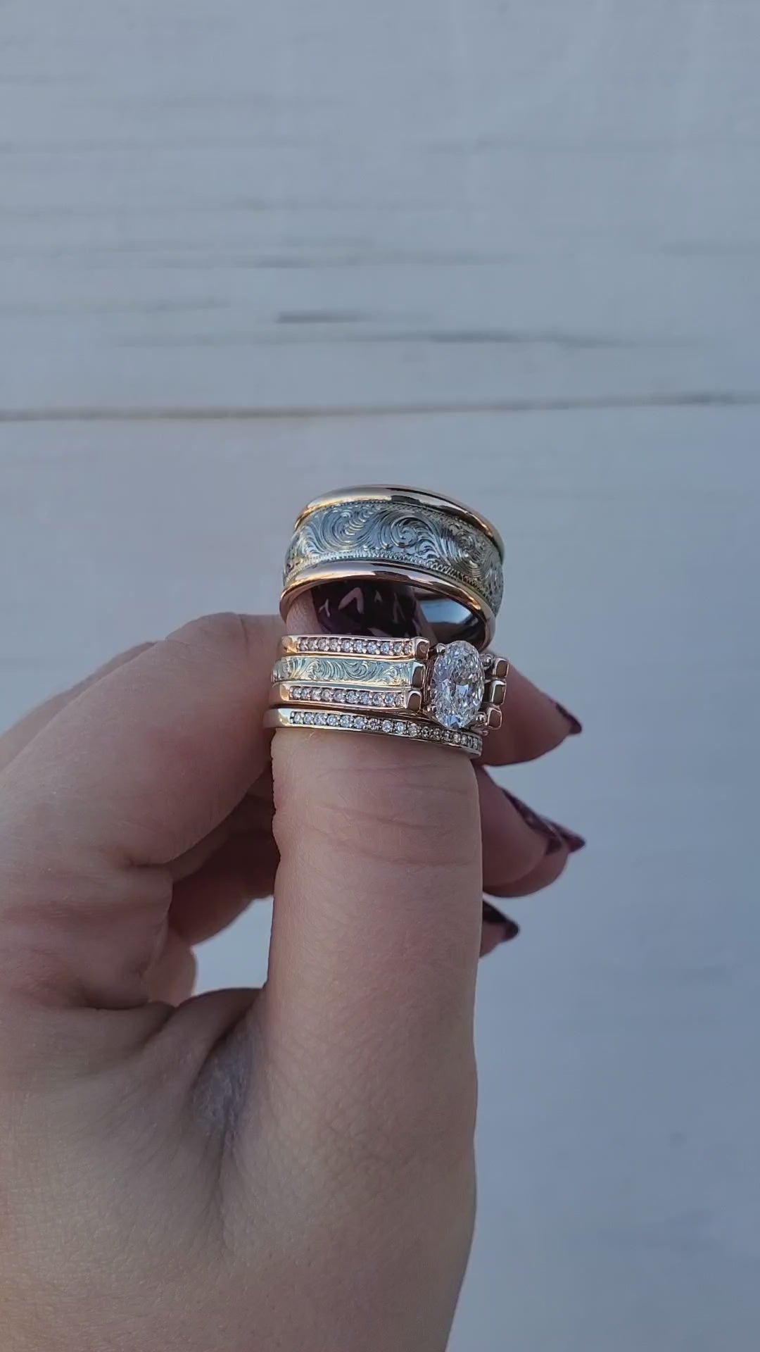 Last but far from least, a men's band as wonderful as the engagement ring: No oval center stone, but equally fabulous! This stunning band has the same 10K rose and white gold as the women's band, and a handsome hand-engraved middle section. The ring is domed and about 10mm wide. Take a closer look at the individual listing here.