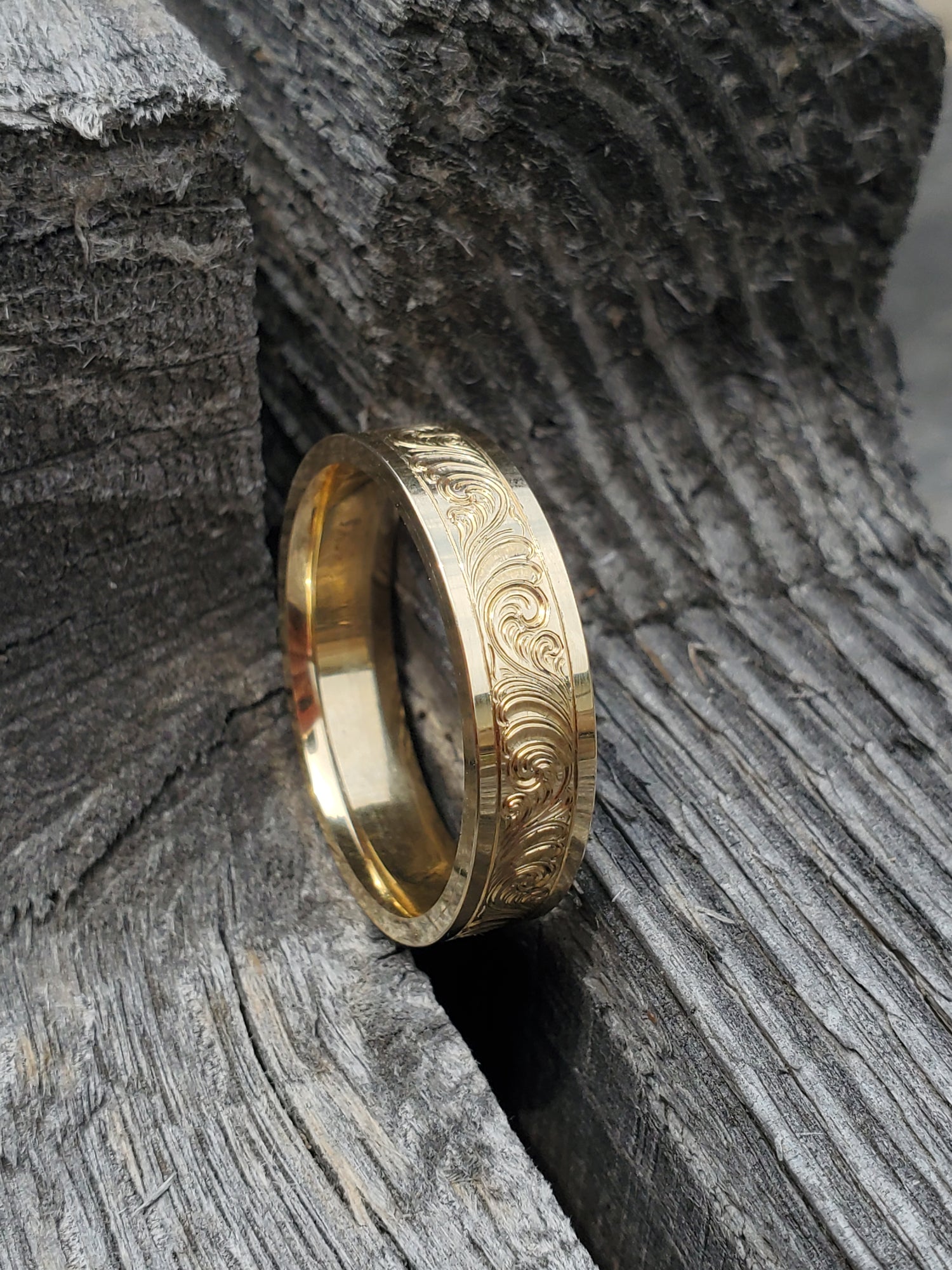 The Henry: 10K-18K Yellow Gold Band, Men's Western Wedding Band, Yellow Gold Wedding Ring, Hand-engraved Ring, Cowboy Wedding Ring