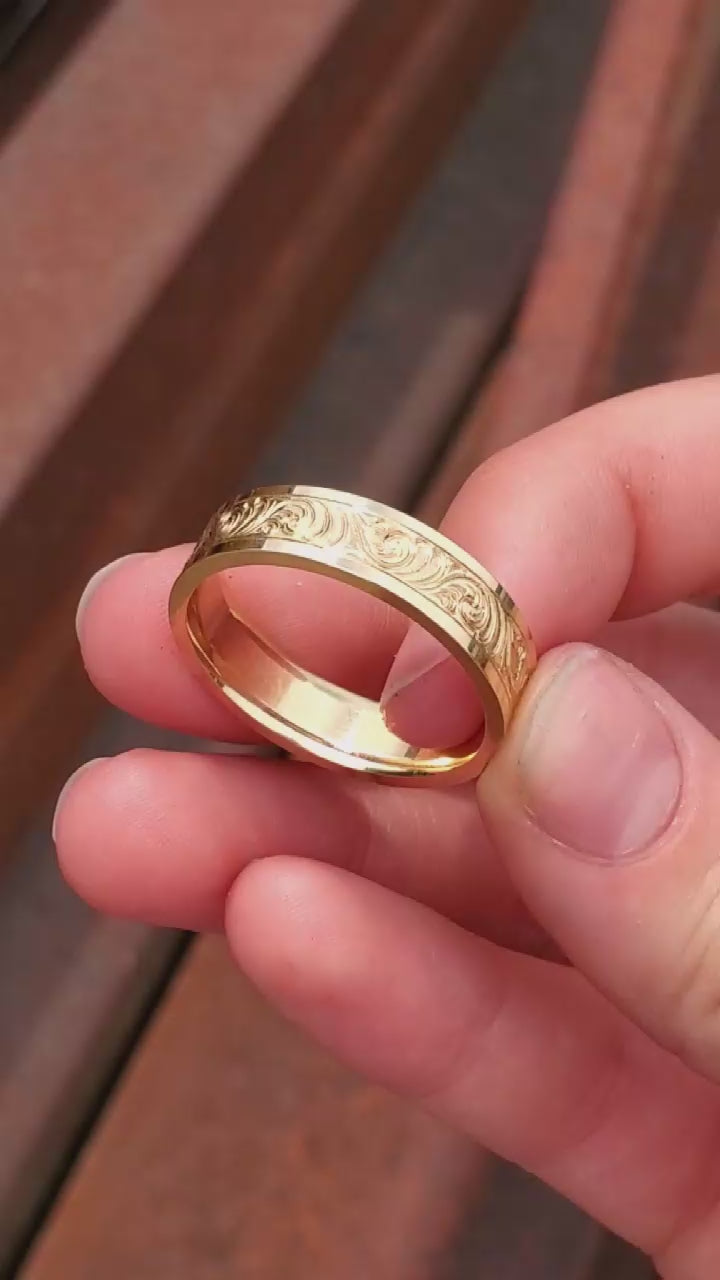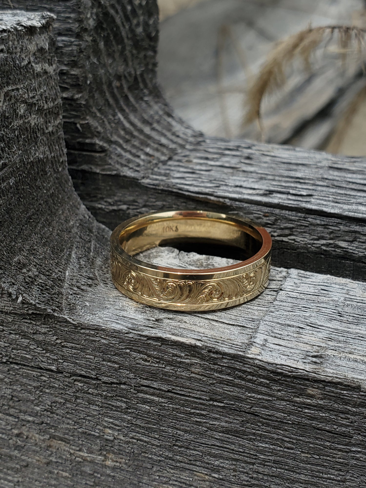 With a 6mm wide, light comfort-fit yellow gold band and hand-engraved swirls, this ring is an instant classic. It is available in 10K, 14K, and 18K yellow gold.