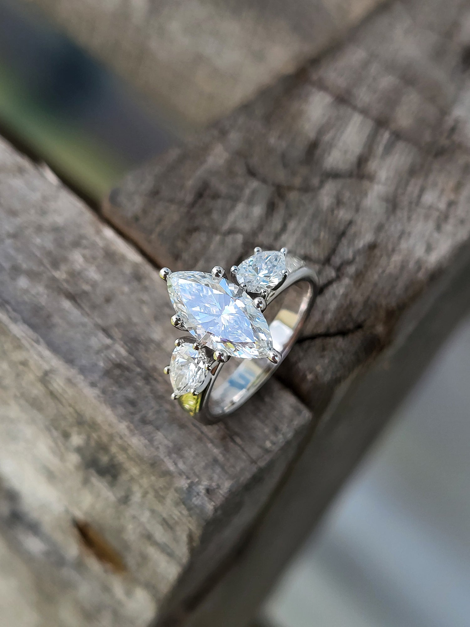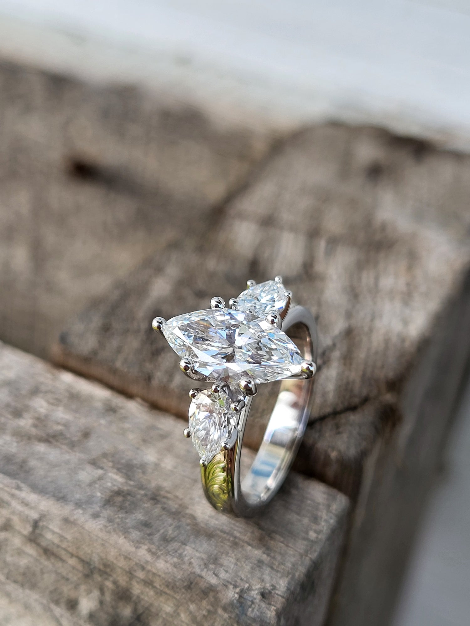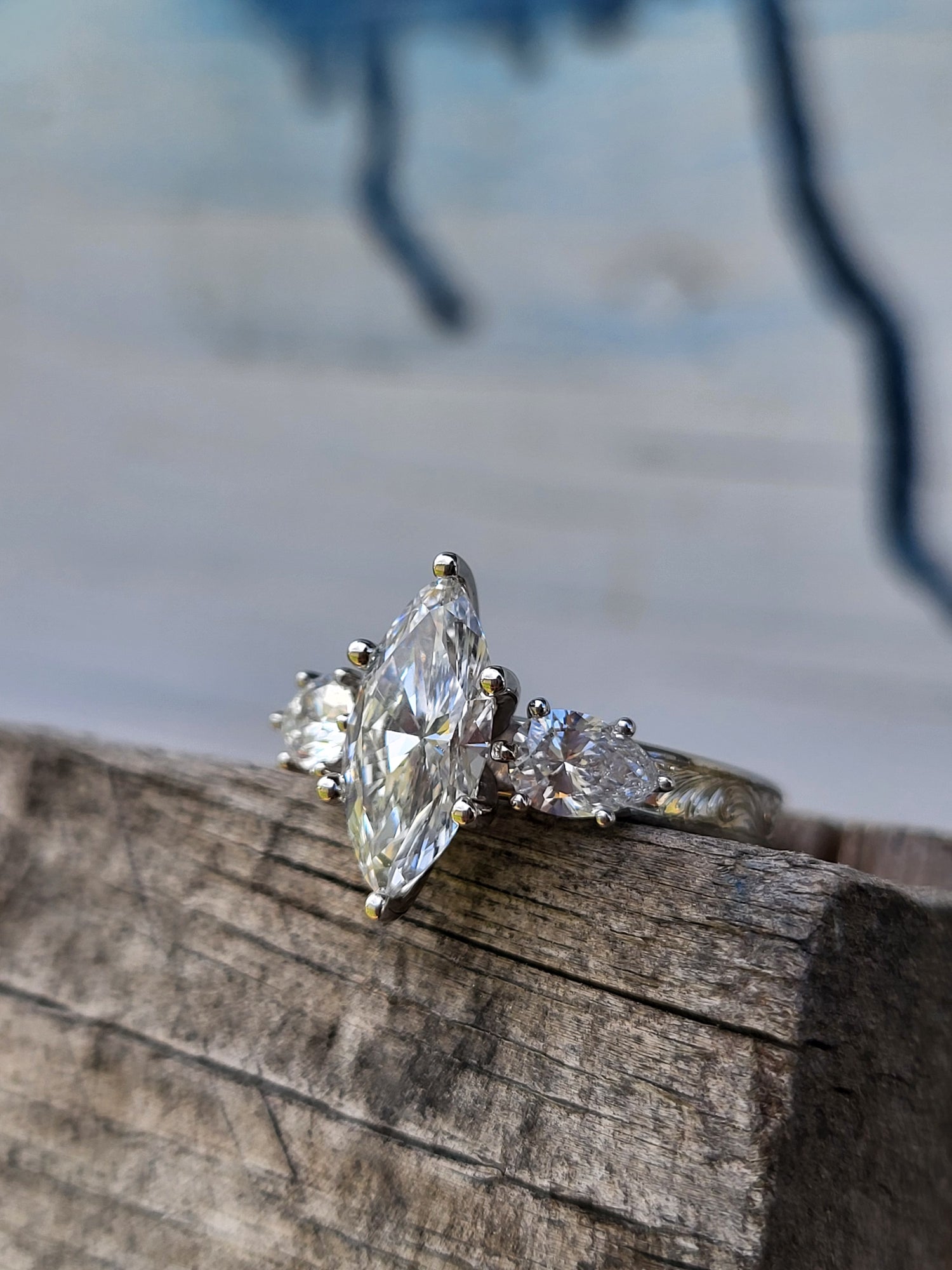 The Jena: 1 to 1.75ct Three-Stone Engagement Ring, 10K, 14K, or 18K White Gold Engagement Ring with 1ct to 1.75ct Marquise Center, Western Engagement Ring, Cowgirl Engagement Ring