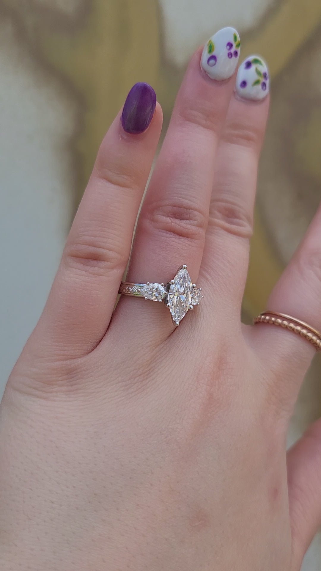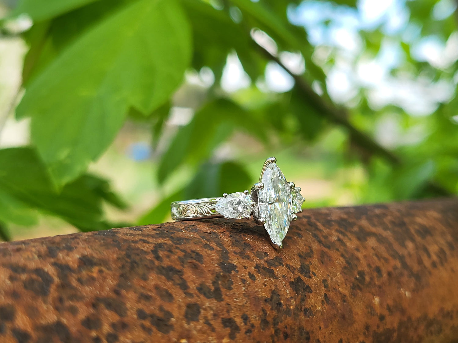 This ring has three beautiful stones for sparkle that will sweep her off her feet and the delicate, hand-engraved scrollwork band she's been dreaming about.