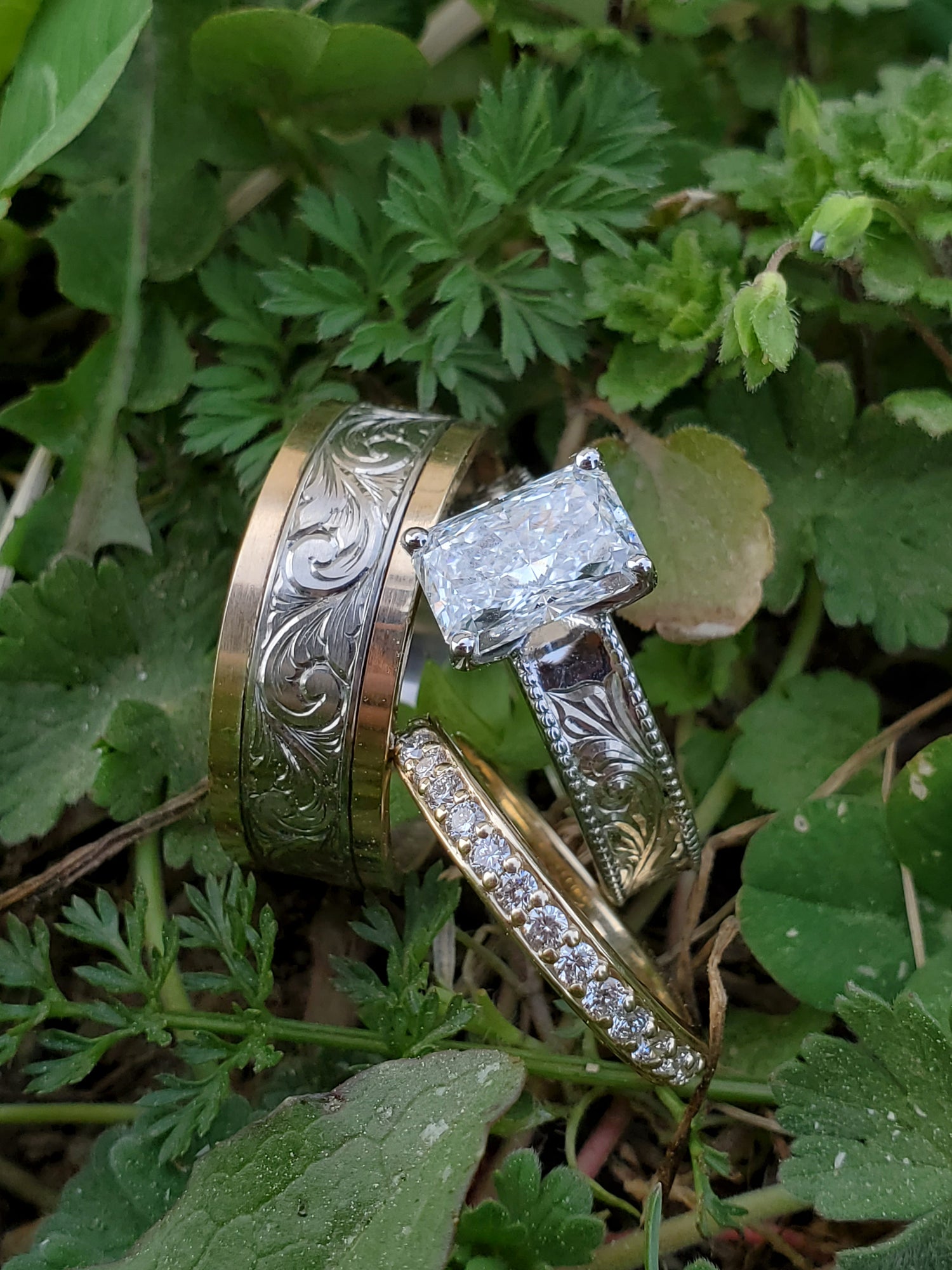 The engraving features detailed swirls, and you can opt to have our engraver work an initial (or several, up to 3) into the hand-engraving. (Please leave your chosen initial in the "notes" section at checkout!) You can also choose to have the engraving antiqued, or bright (see last photo as examples of the ring left bright).
