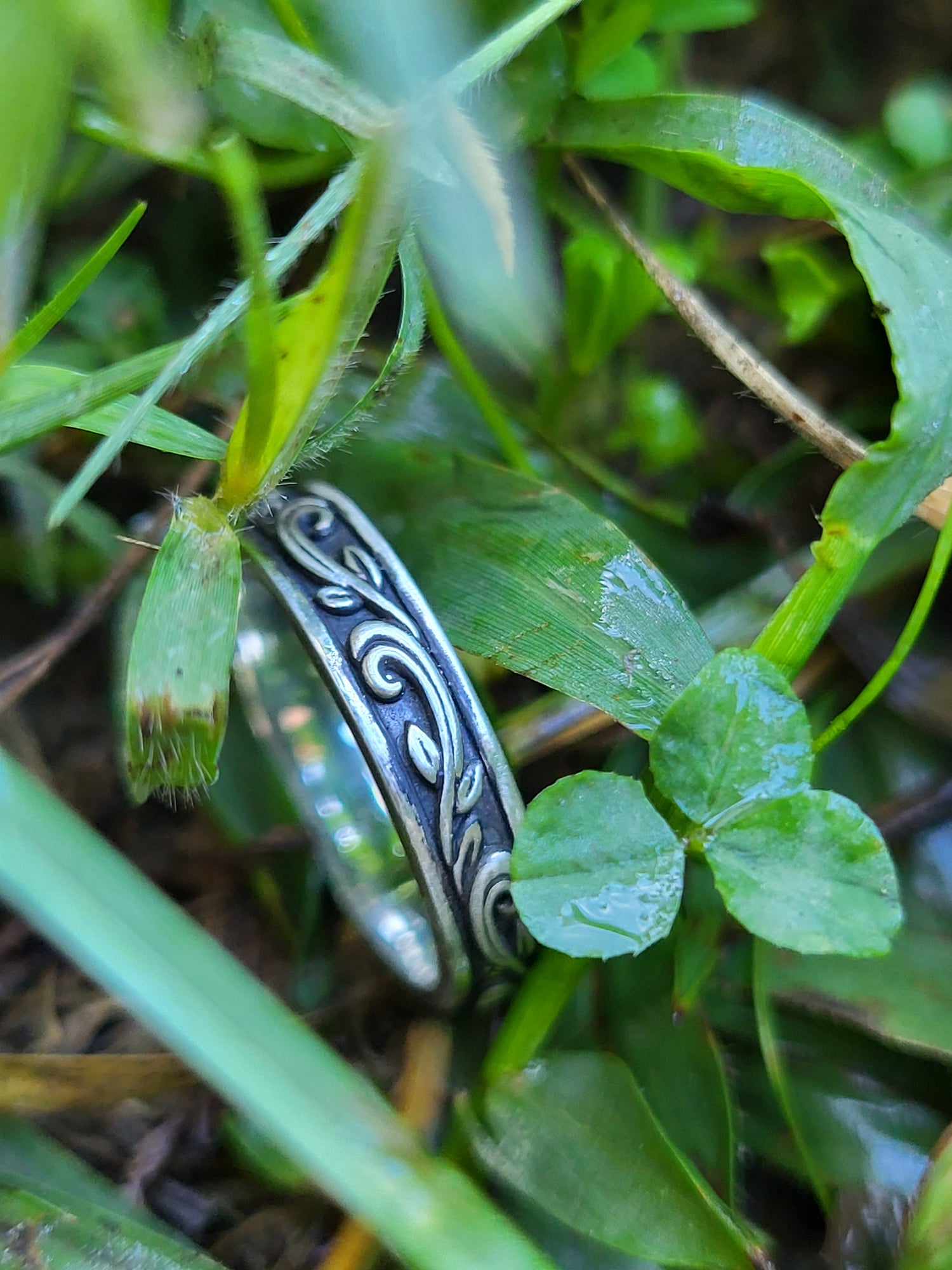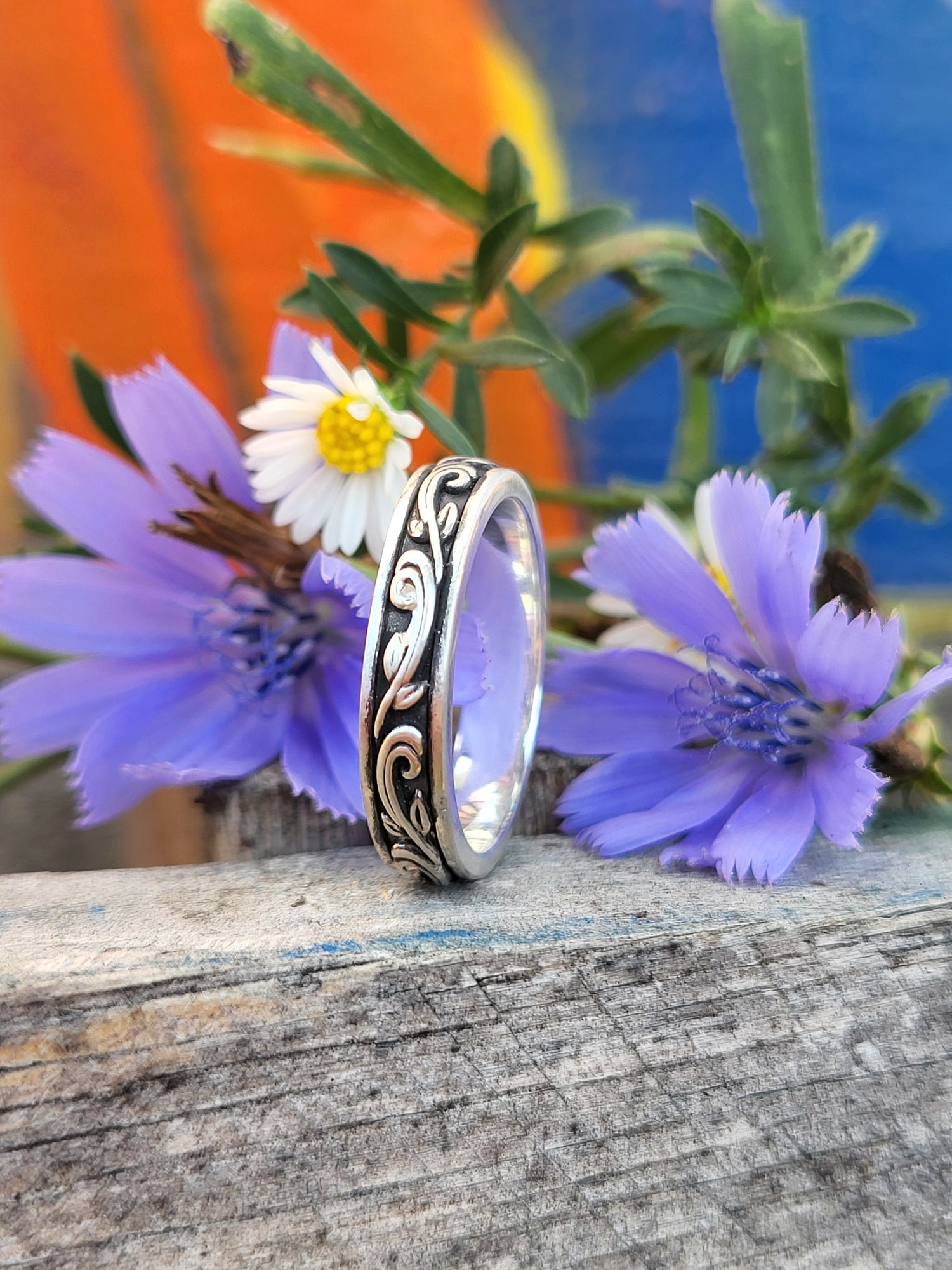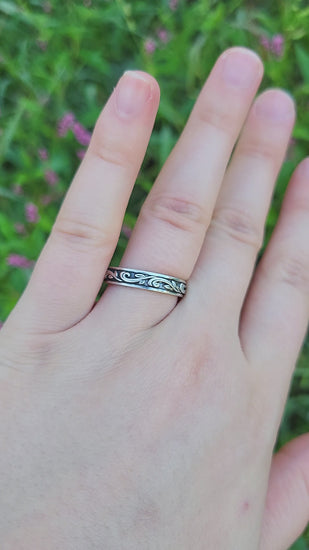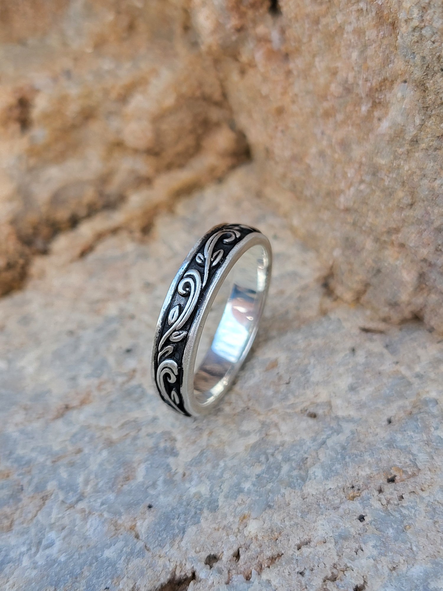 This sculptural antiqued scrollwork band is a gorgeous 4mm wide, dainty enough to stack with any engagement ring, yet it packs a bold punch with its high-contrast antiquing, giving it a vintage Western vibe.
