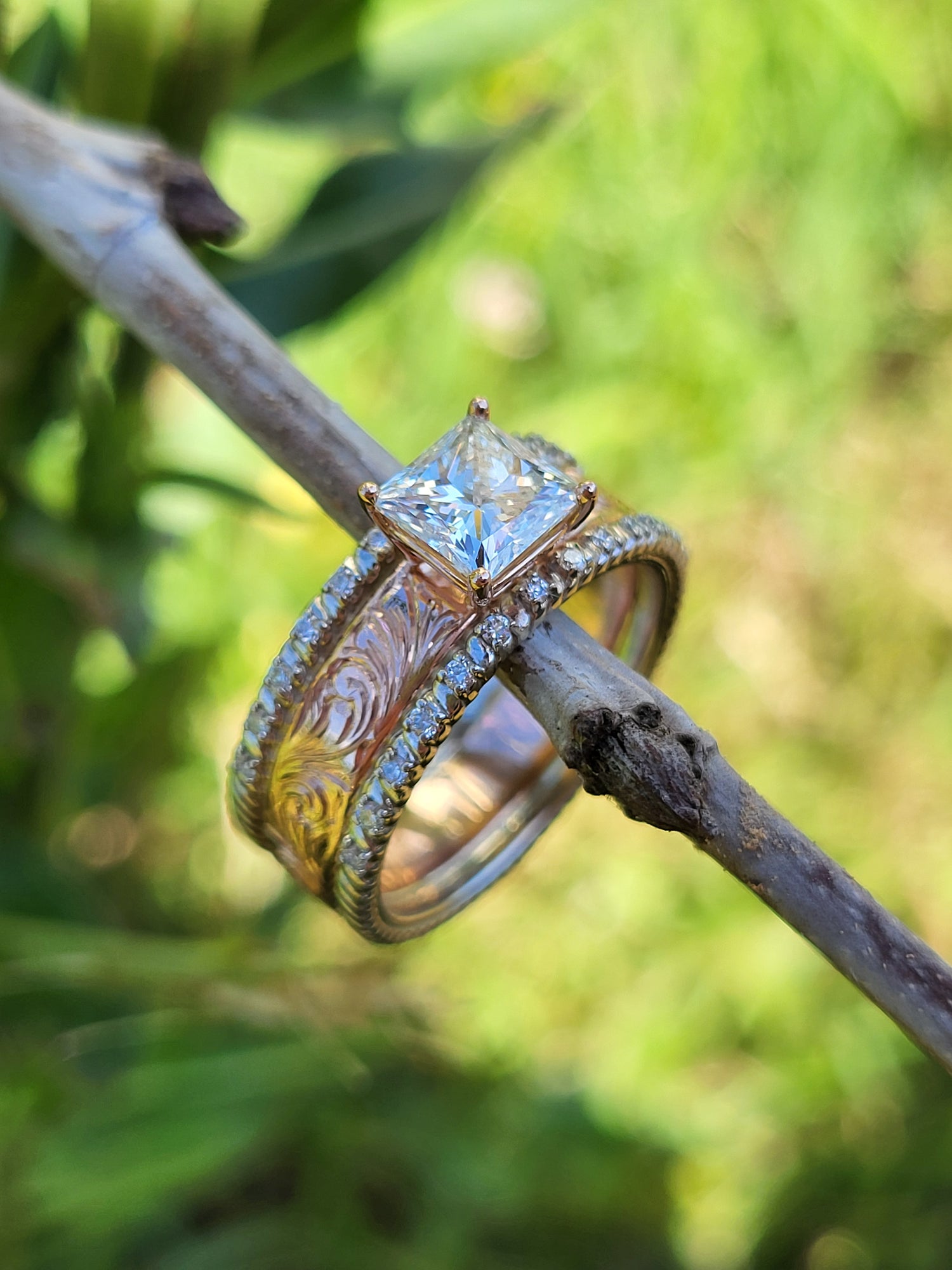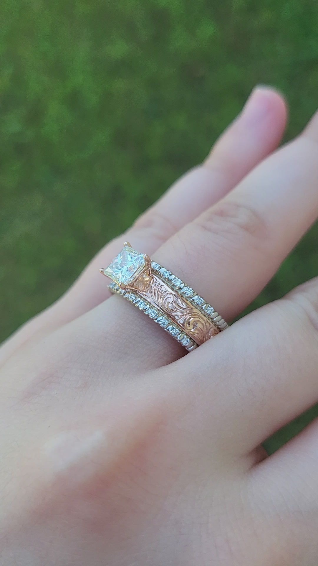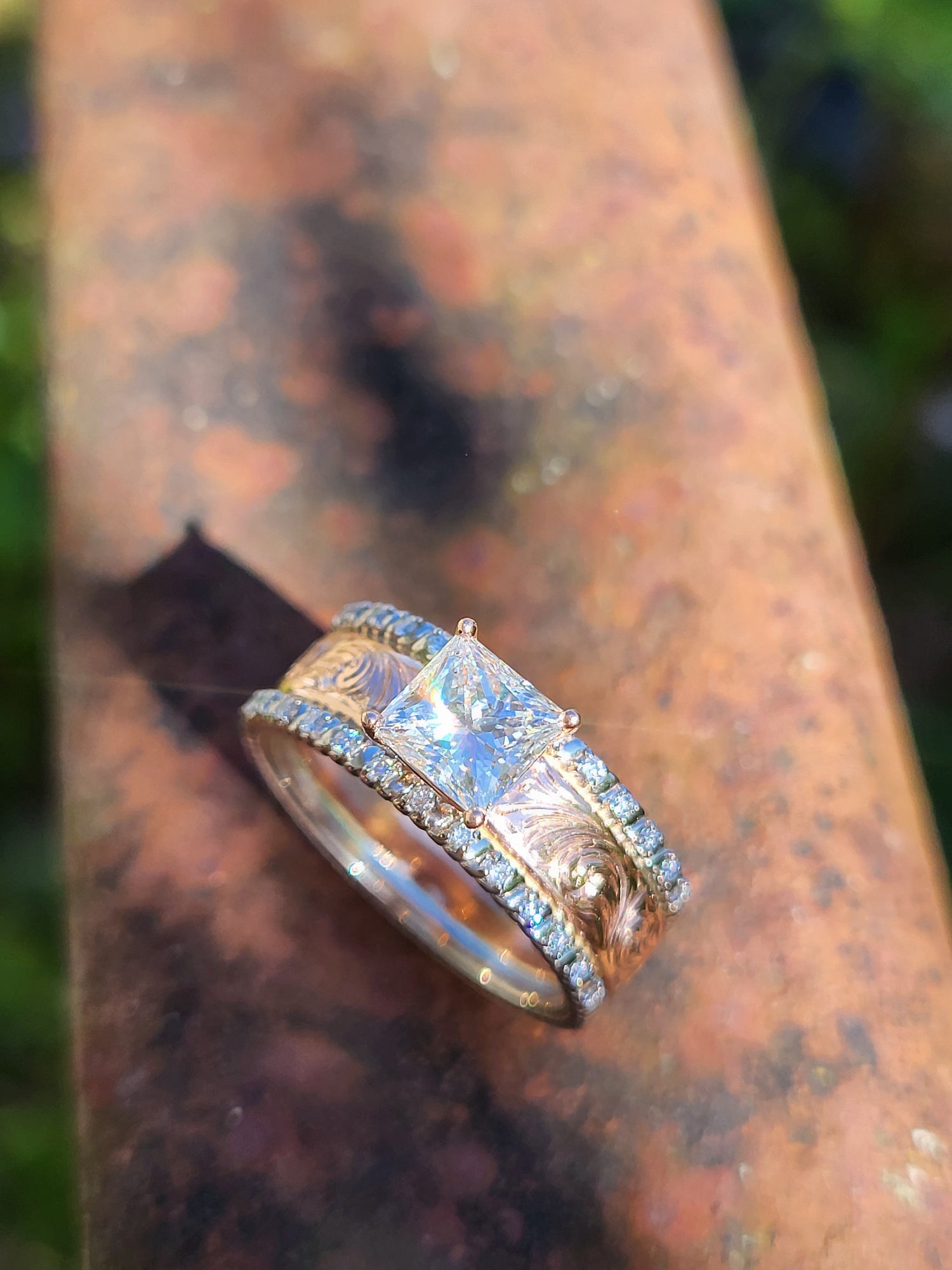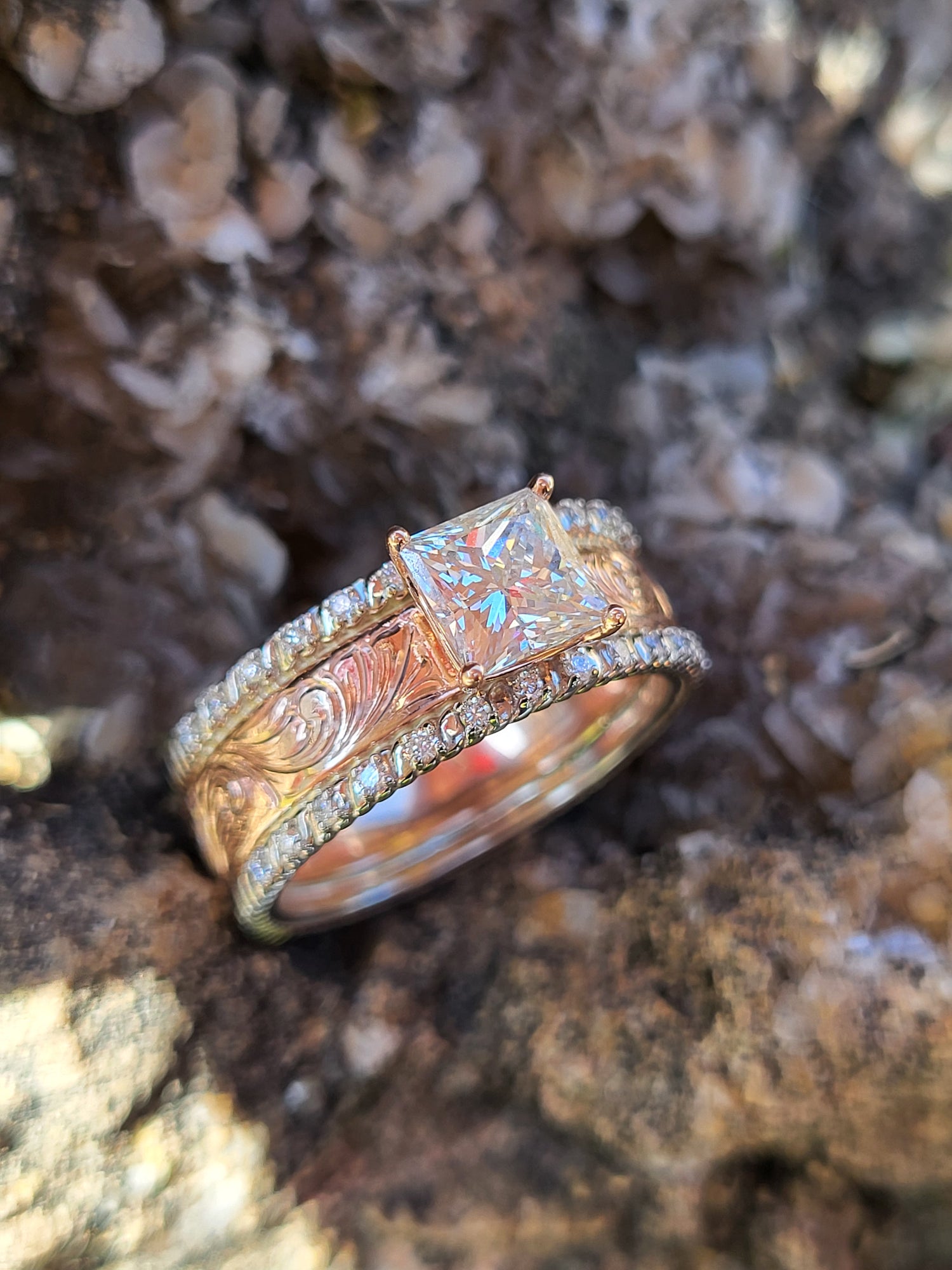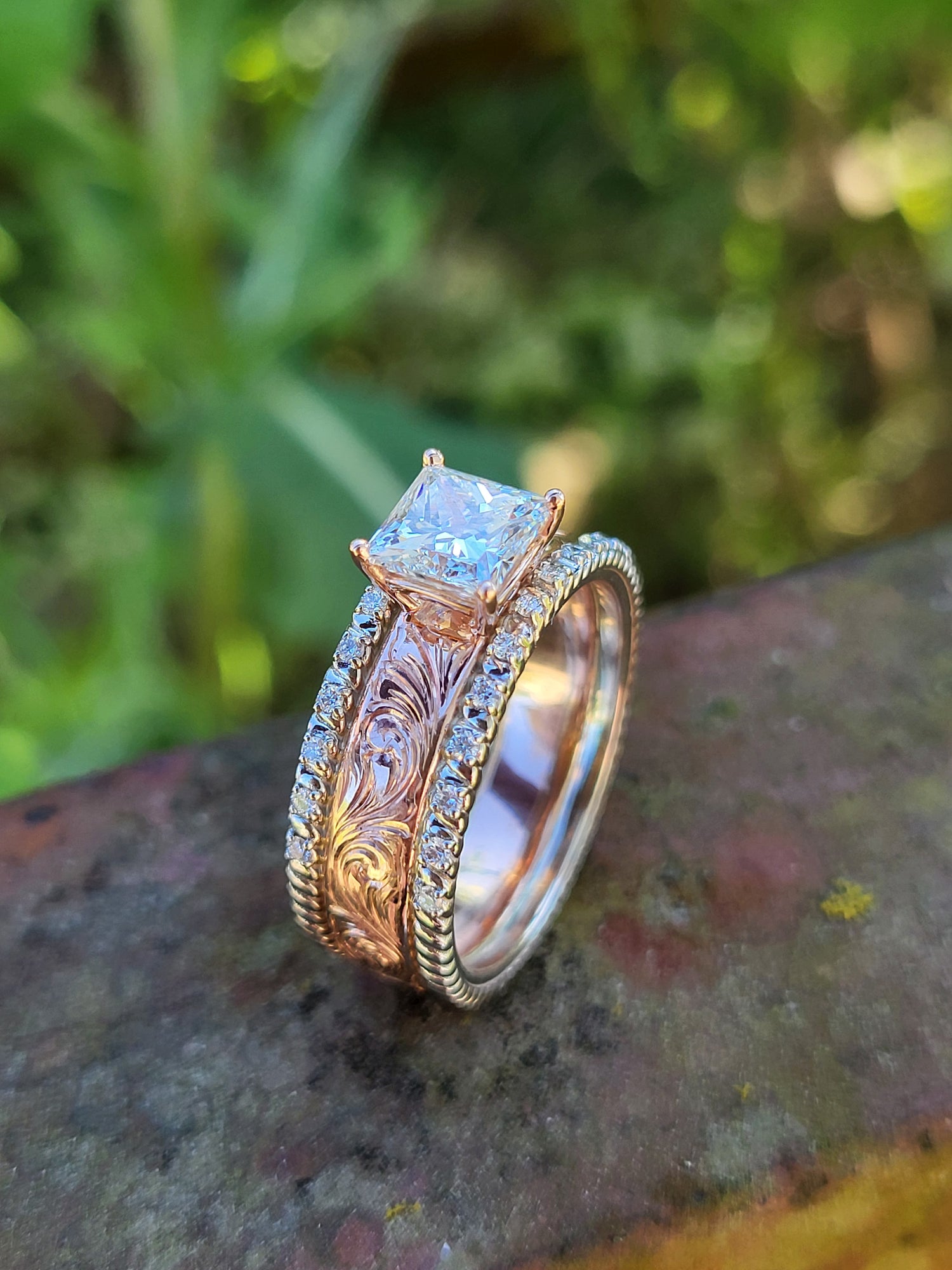 The ring has a hand-engraved, rose gold center section with a rope edge that glitters with inlaid lab diamonds on the top third of the band. Choose from a moissanite or lab diamond, 1ct to 1.75ct center.