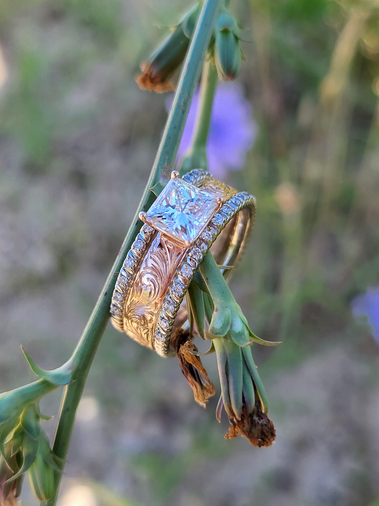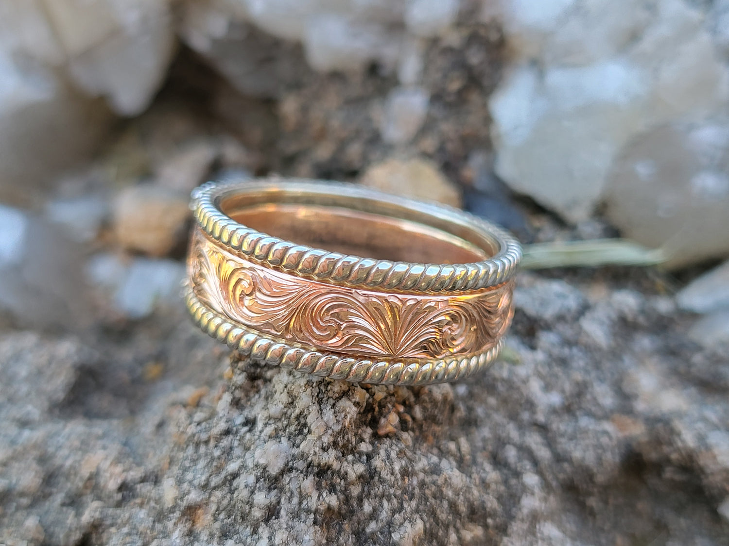 The Kinsley: Rope and Diamond Edge Engagement Ring with Hand-Engraved Center, Western Engagement Ring, Cowgirl Ring, Rose Gold Scrollwork Engagement Ring for Cowgirls