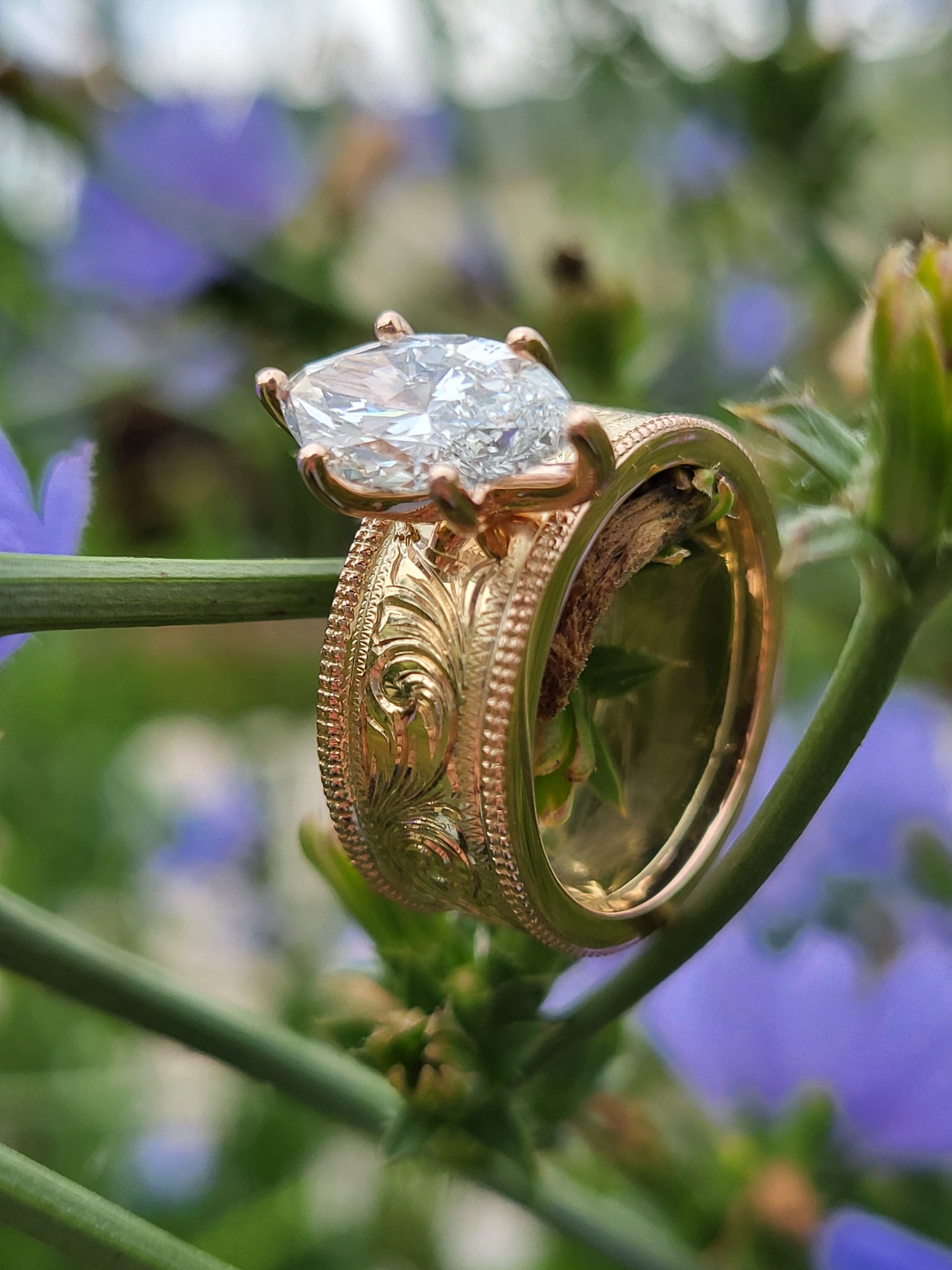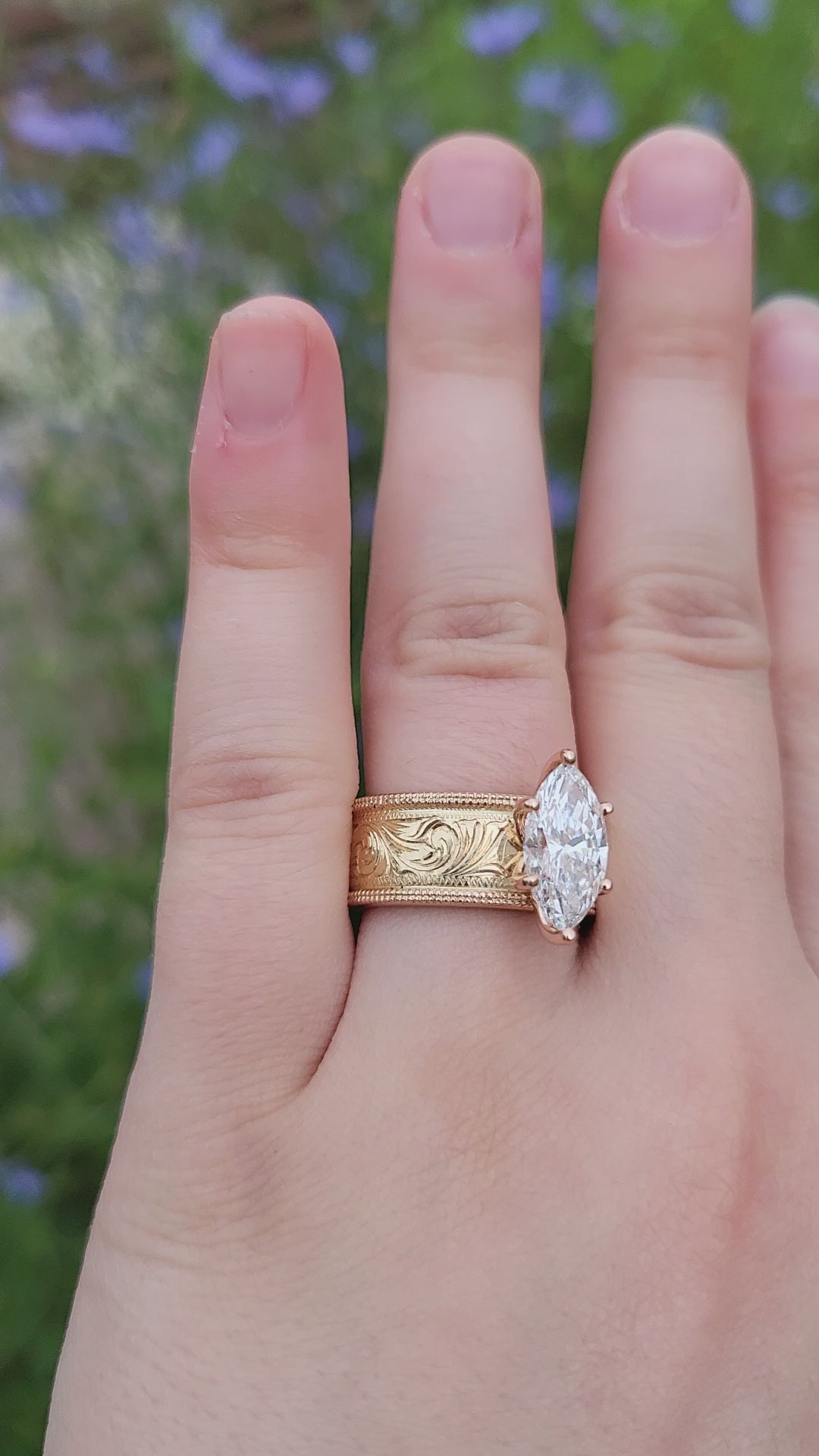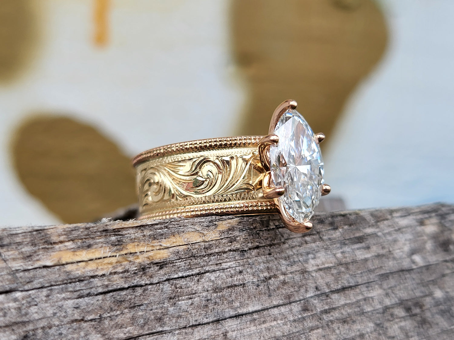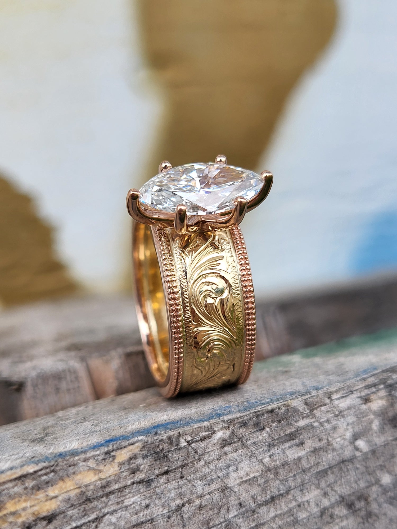 The Louisa: Wide 2ct. Two-Tone Rose and Yellow Gold Hand-Engraved Western Engagement Ring, Unique Cowgirl Ring, Western Engagement Ring for Her, Rose Gold and Yellow Gold Engagement