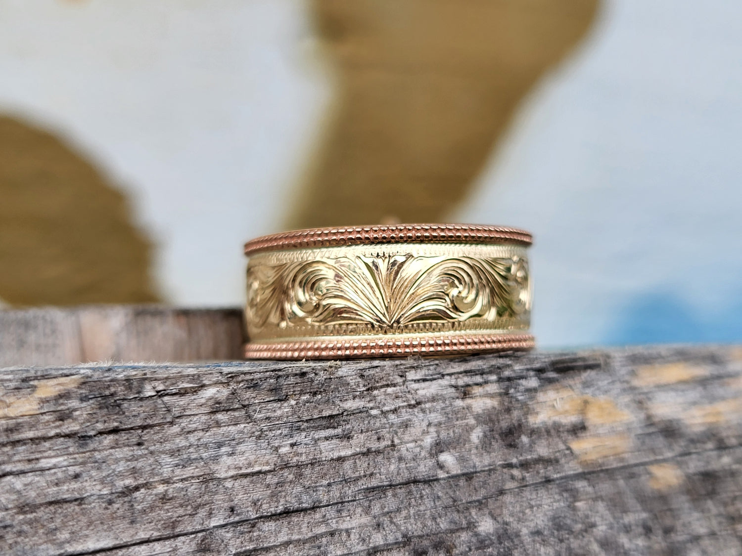 At 7mm wide, it showcases hand-engraved scrollwork that swirls around the 10K yellow gold band, framed in by the upraised contrasting 10K rose gold upraised double milgrain edge.