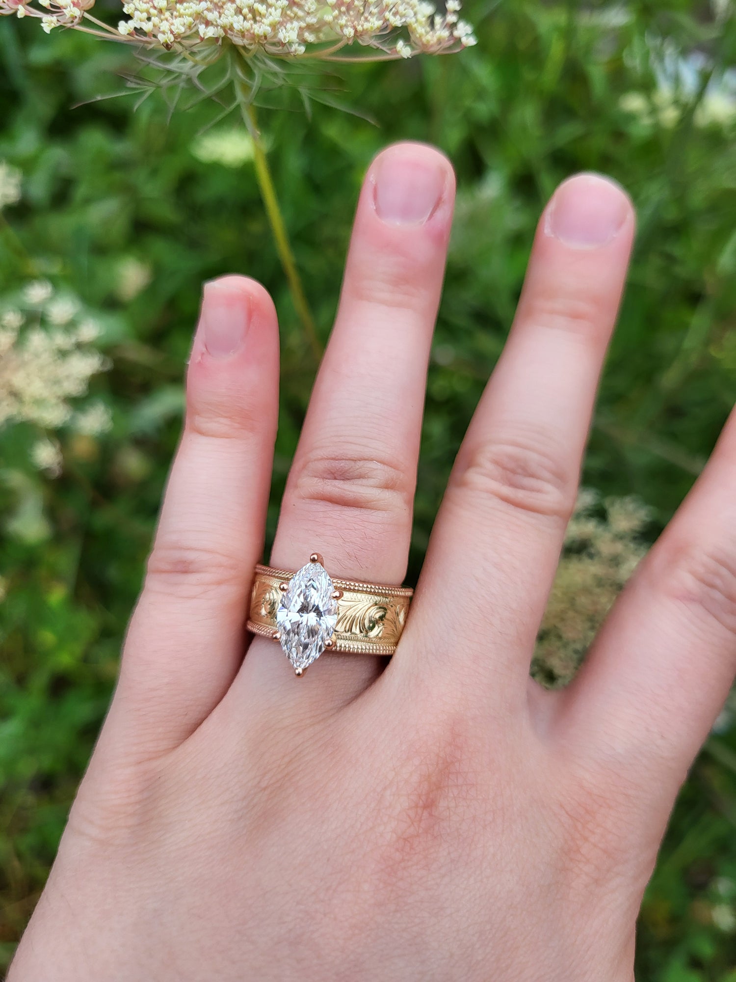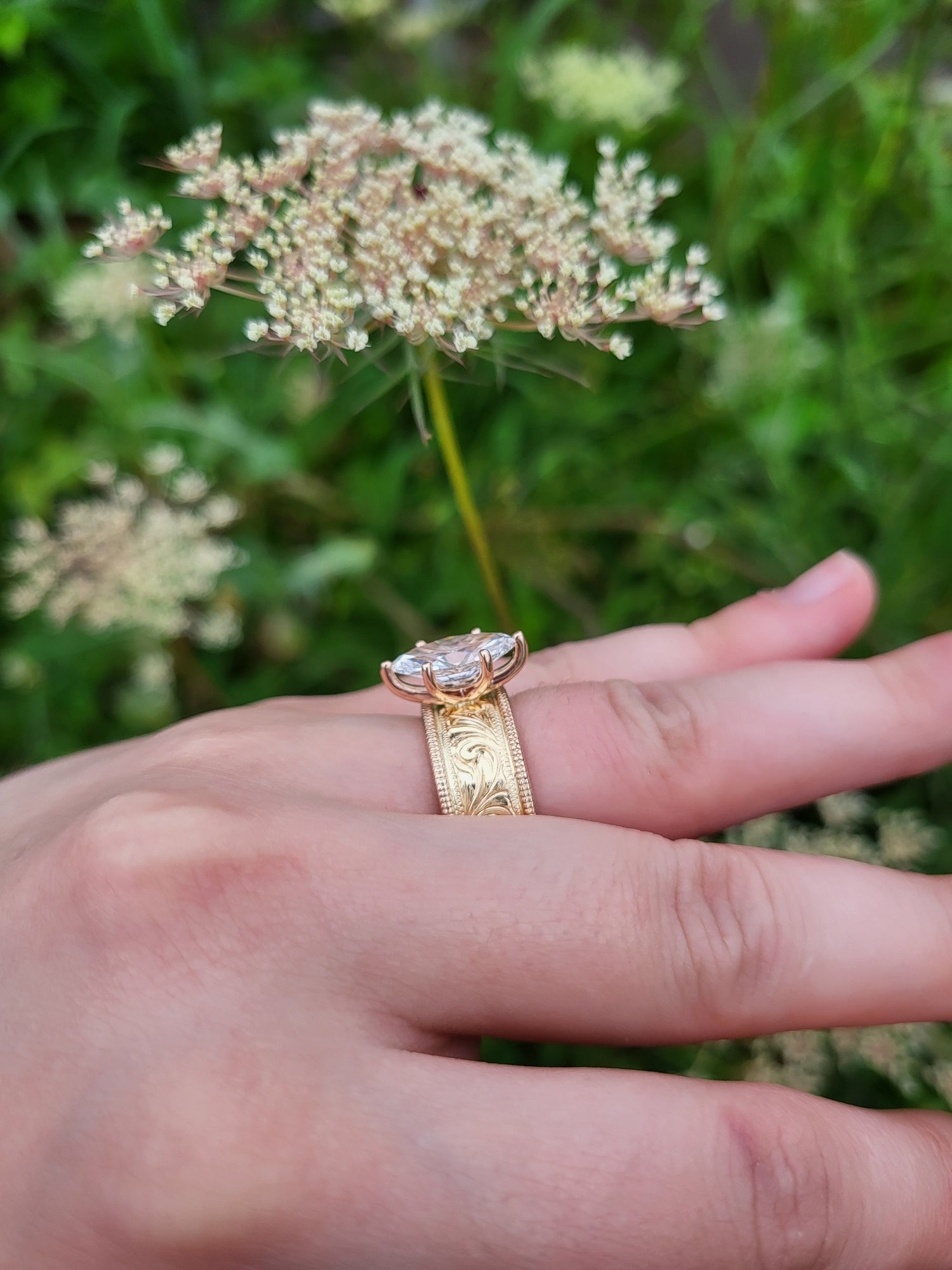 Do you crave two-tone deliciousness with a bend towards warmth? Do objects with strong visual intrest draw you in? This darling, wide two-tone rose and yellow gold ring features stunning hand-engraving and a swoon-worthy 2ct+ center stone that will leave you breathless!
