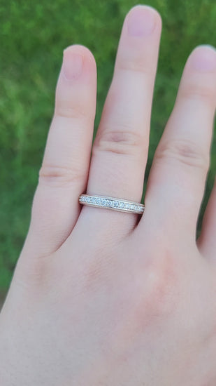 This is a dainty stackable wedding band crafted in sterling silver, 10K, 14K or 18K white gold, or platinum.